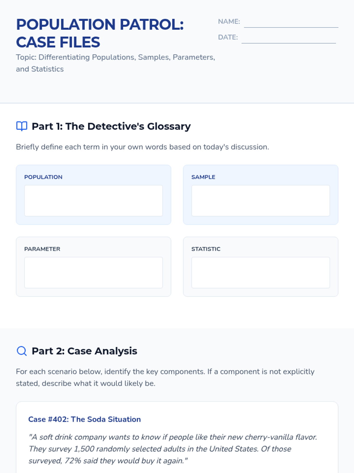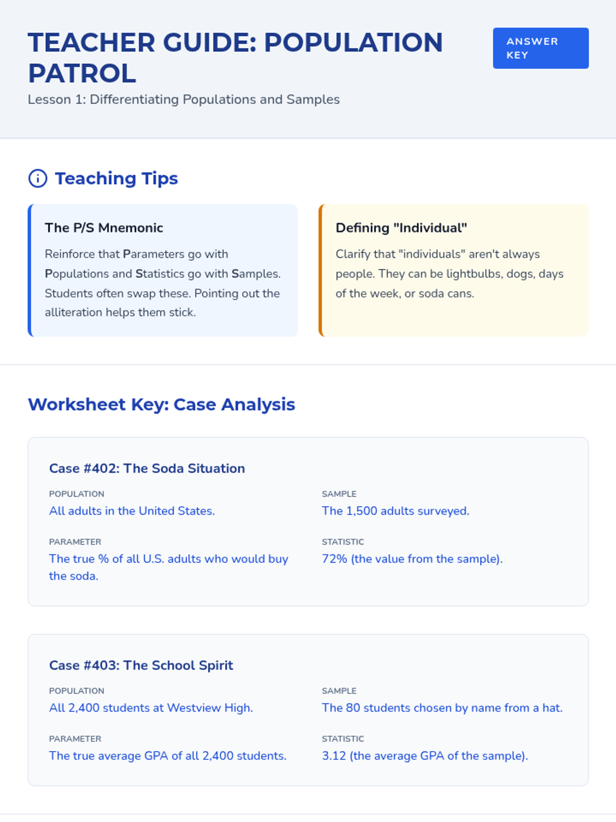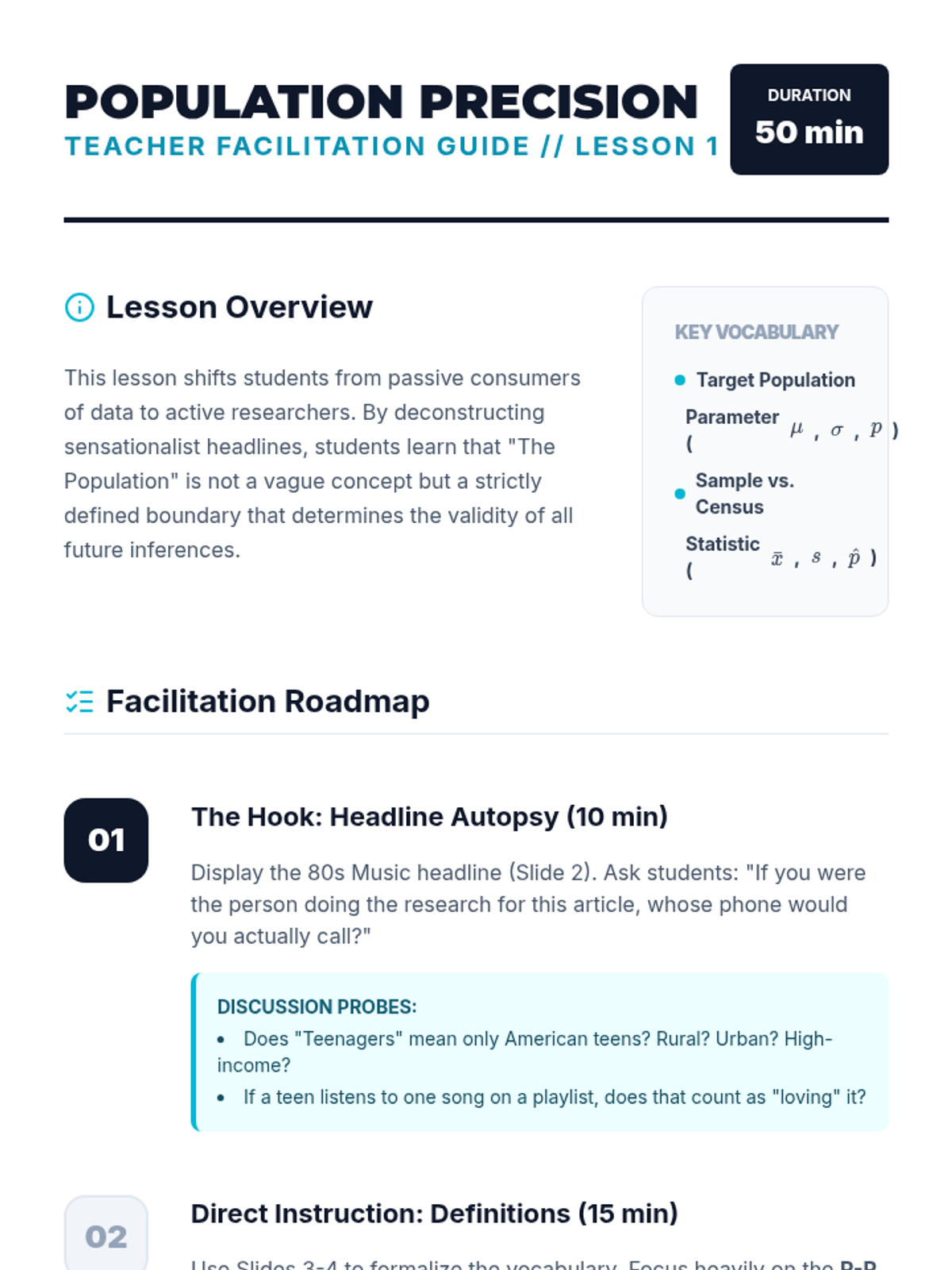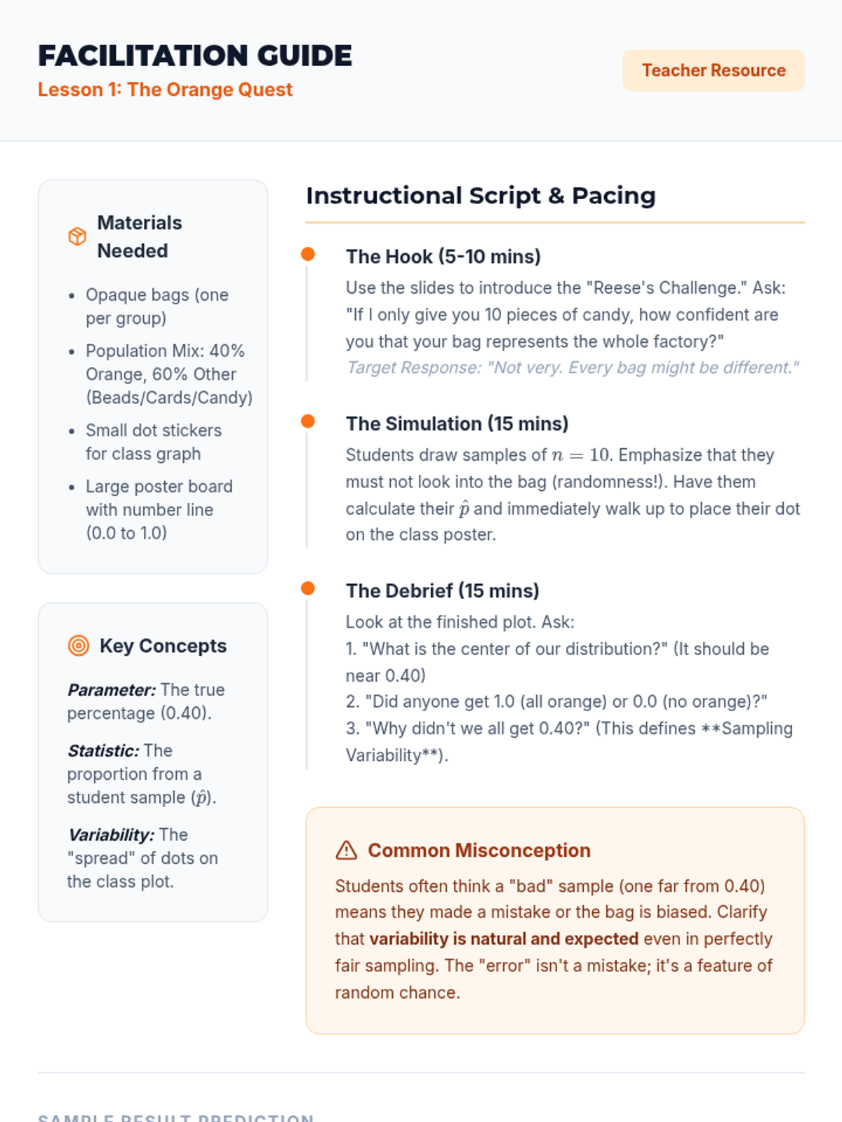 A targeted Tier 2 intervention sequence designed to help high school students master the fundamental concepts of statistical inference, moving from population parameters to sample statistics and back again through real-world applications.