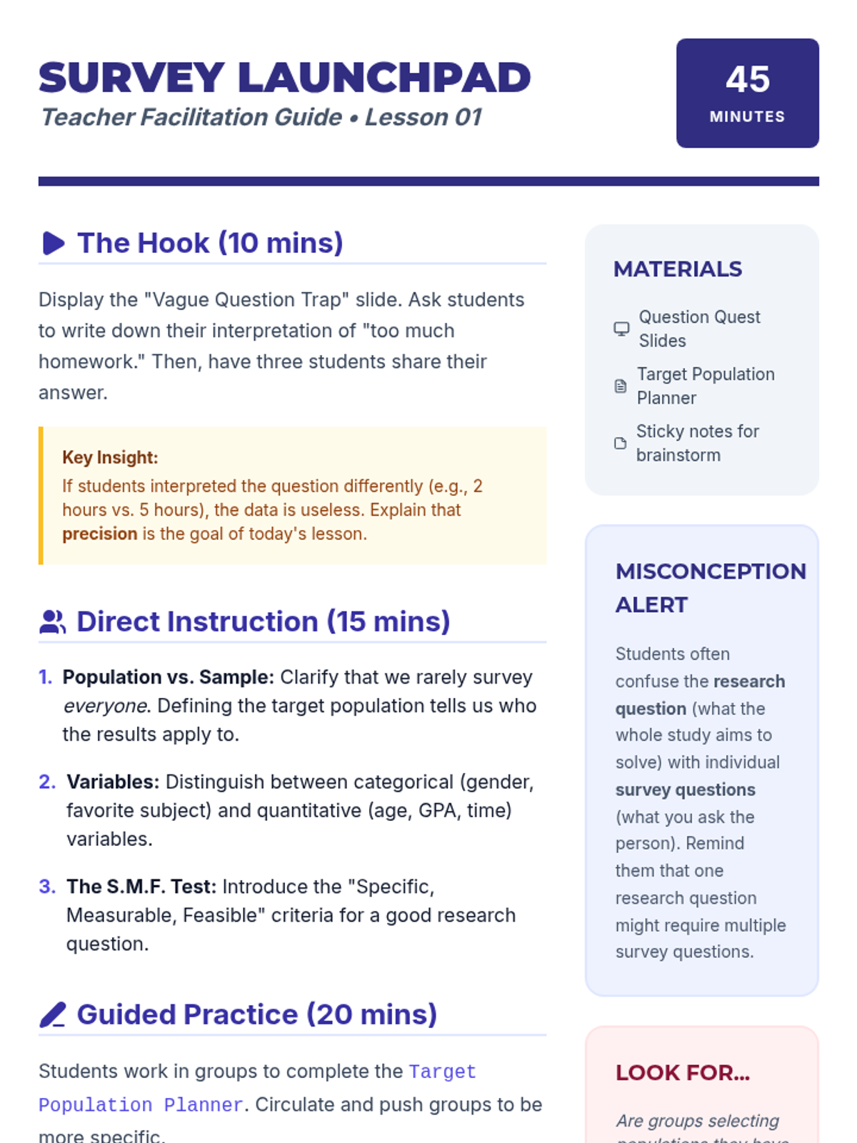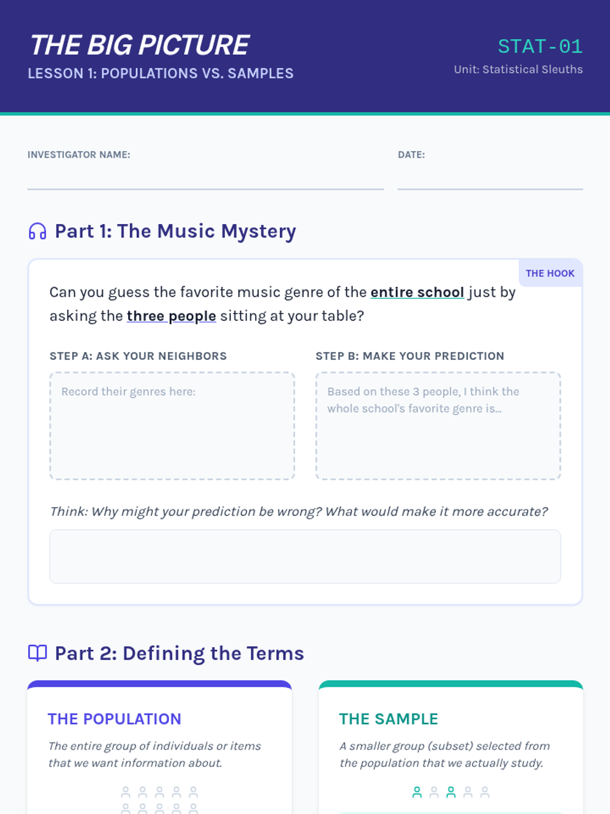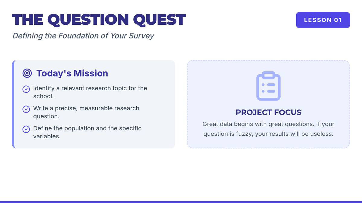 A project-based unit where students act as lead researchers, designing and executing a statistical study from question formulation to final validity reporting. Students learn to navigate population definitions, sampling methods, and question bias to ensure their data accurately reflects reality.