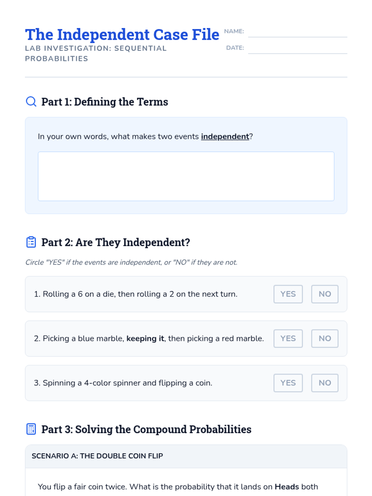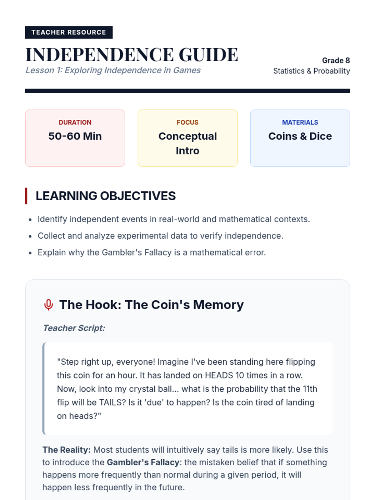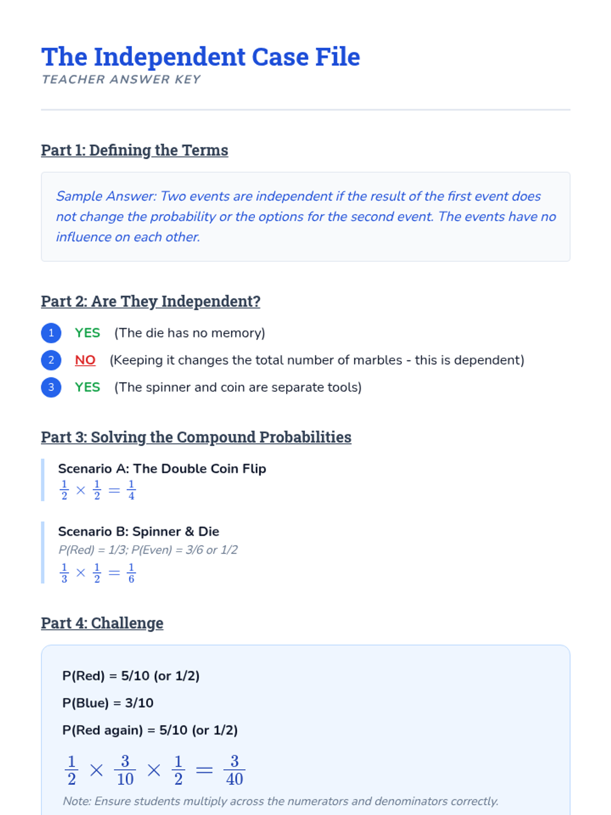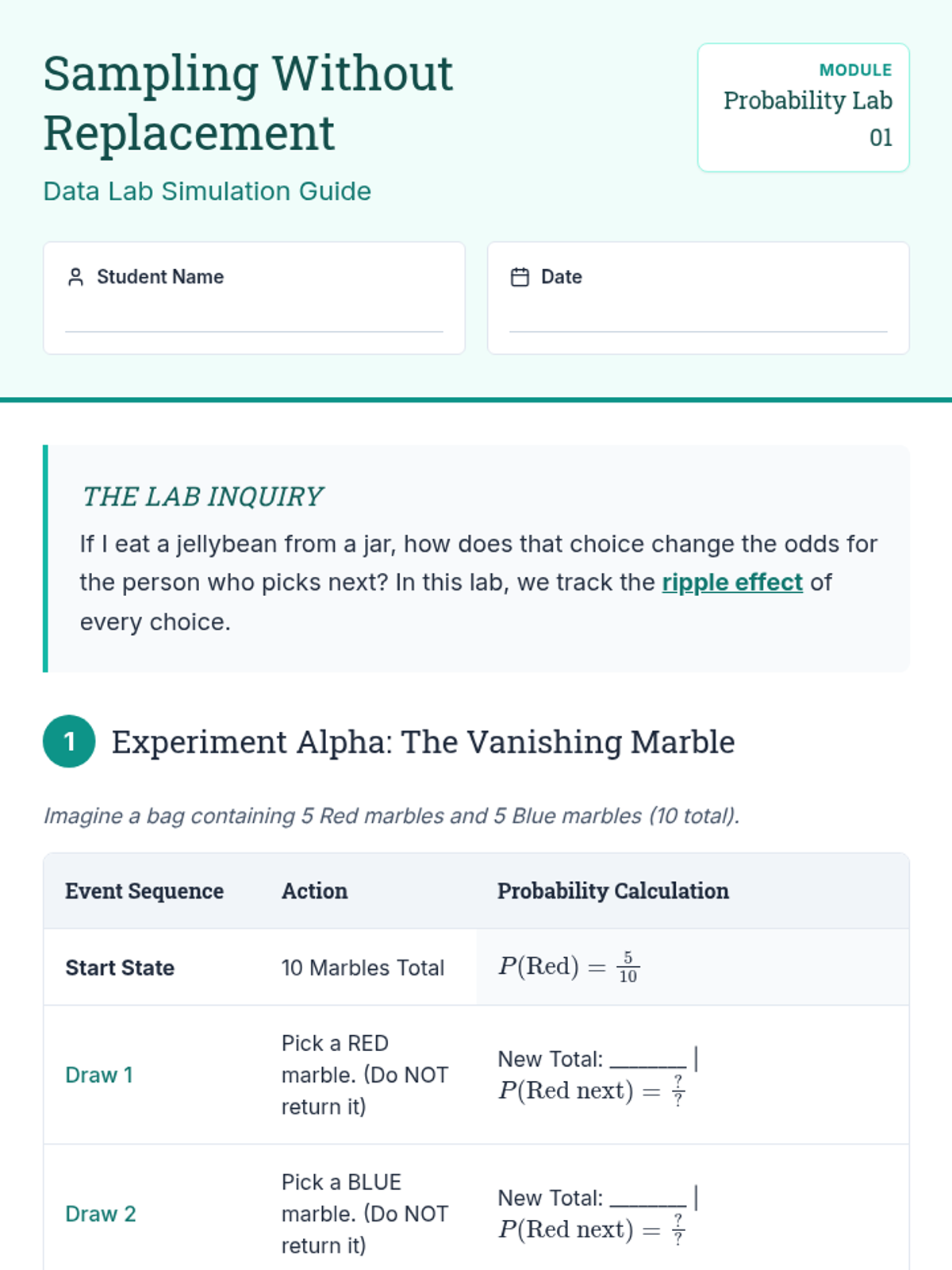 This sequence explores the differences between independent and dependent events through hands-on simulations, comparative analysis, and multi-step calculations. Students learn to adjust sample spaces and numerators based on whether items are replaced, building a strong foundation for compound probability.