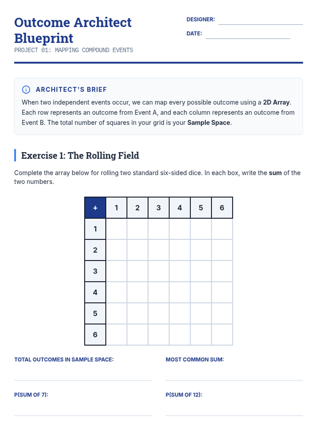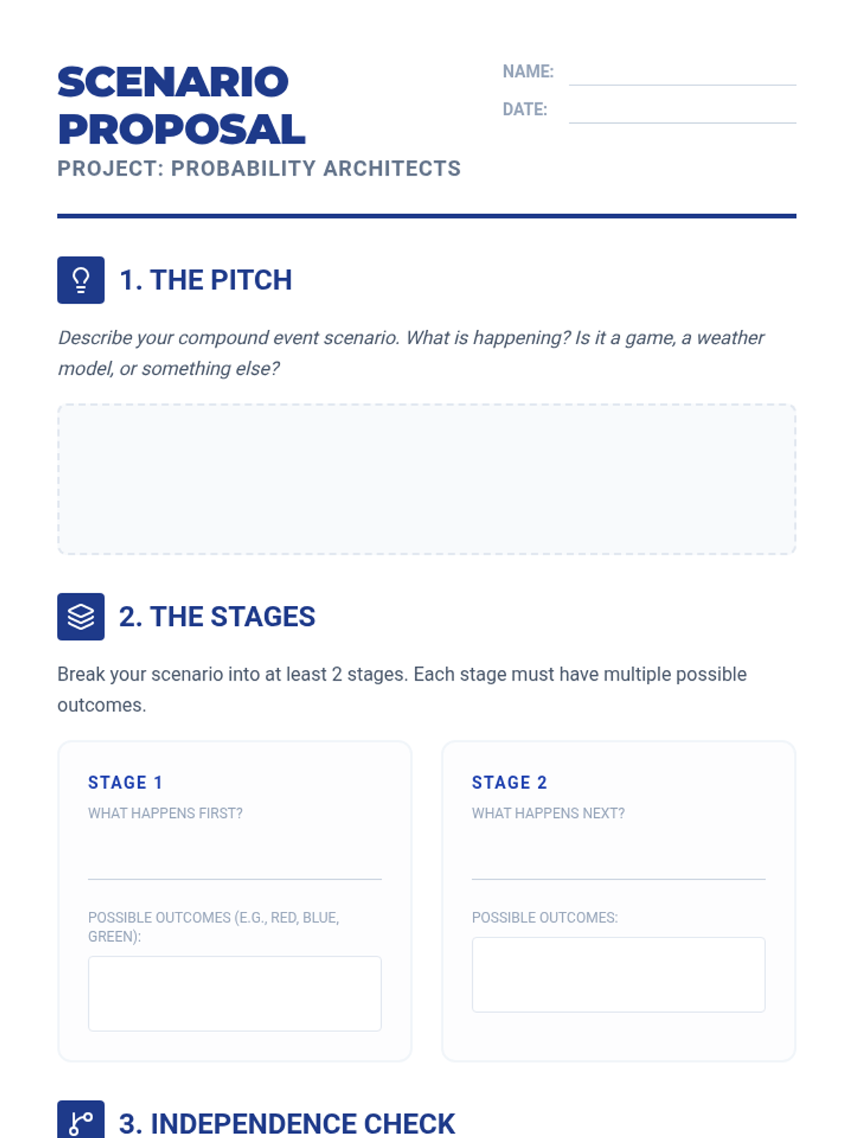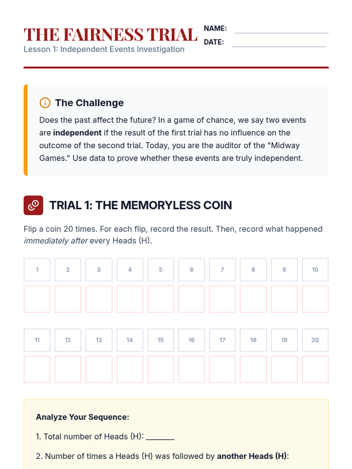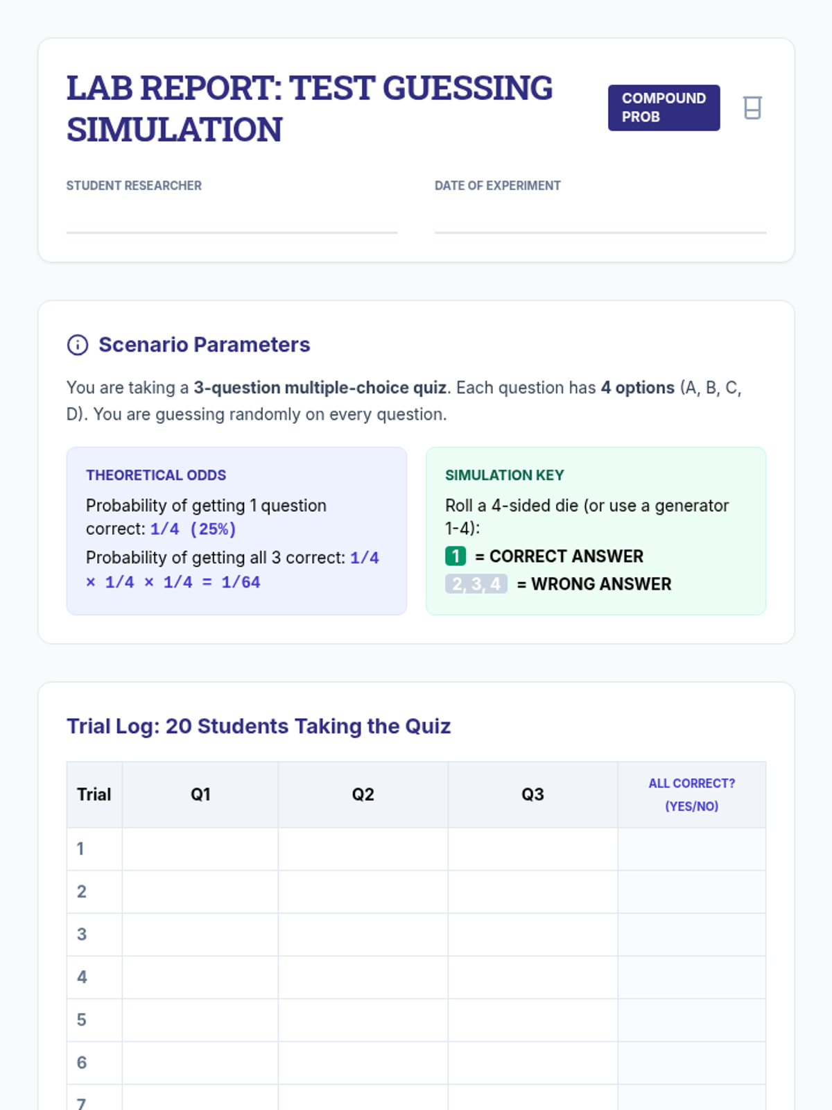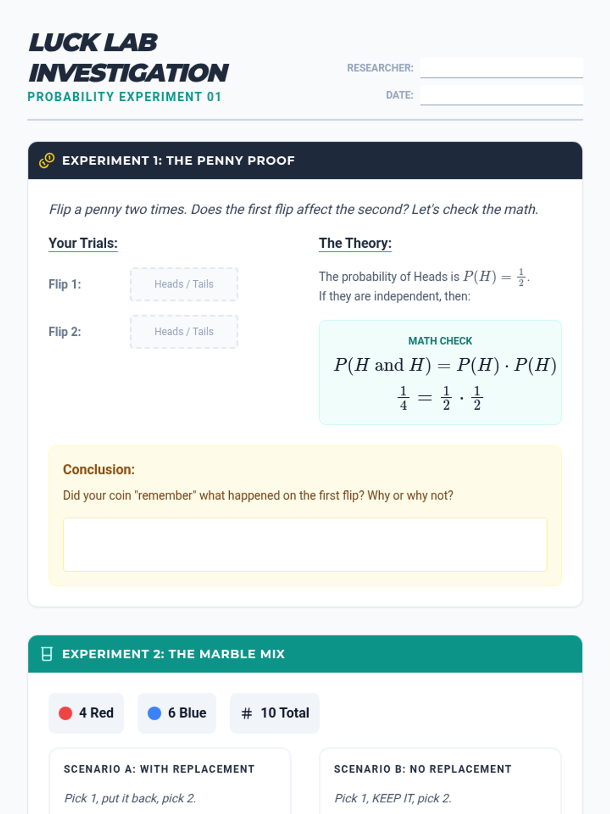 This sequence explores the differences between independent and dependent events through hands-on simulations, comparative analysis, and multi-step calculations. Students learn to adjust sample spaces and numerators based on whether items are replaced, building a strong foundation for compound probability.