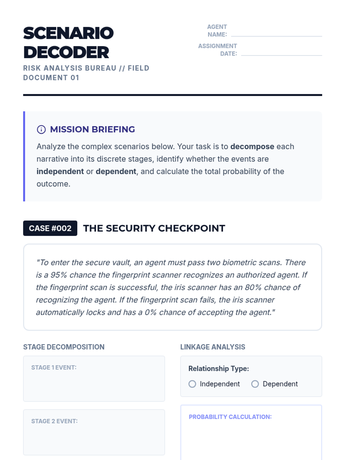 An advanced project-based sequence where 9th-grade students act as risk analysts, modeling complex multi-stage scenarios and calculating compound probabilities for independent and dependent events.