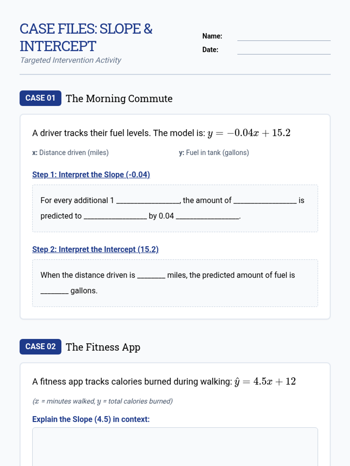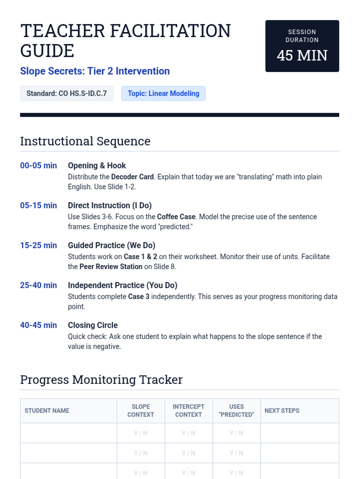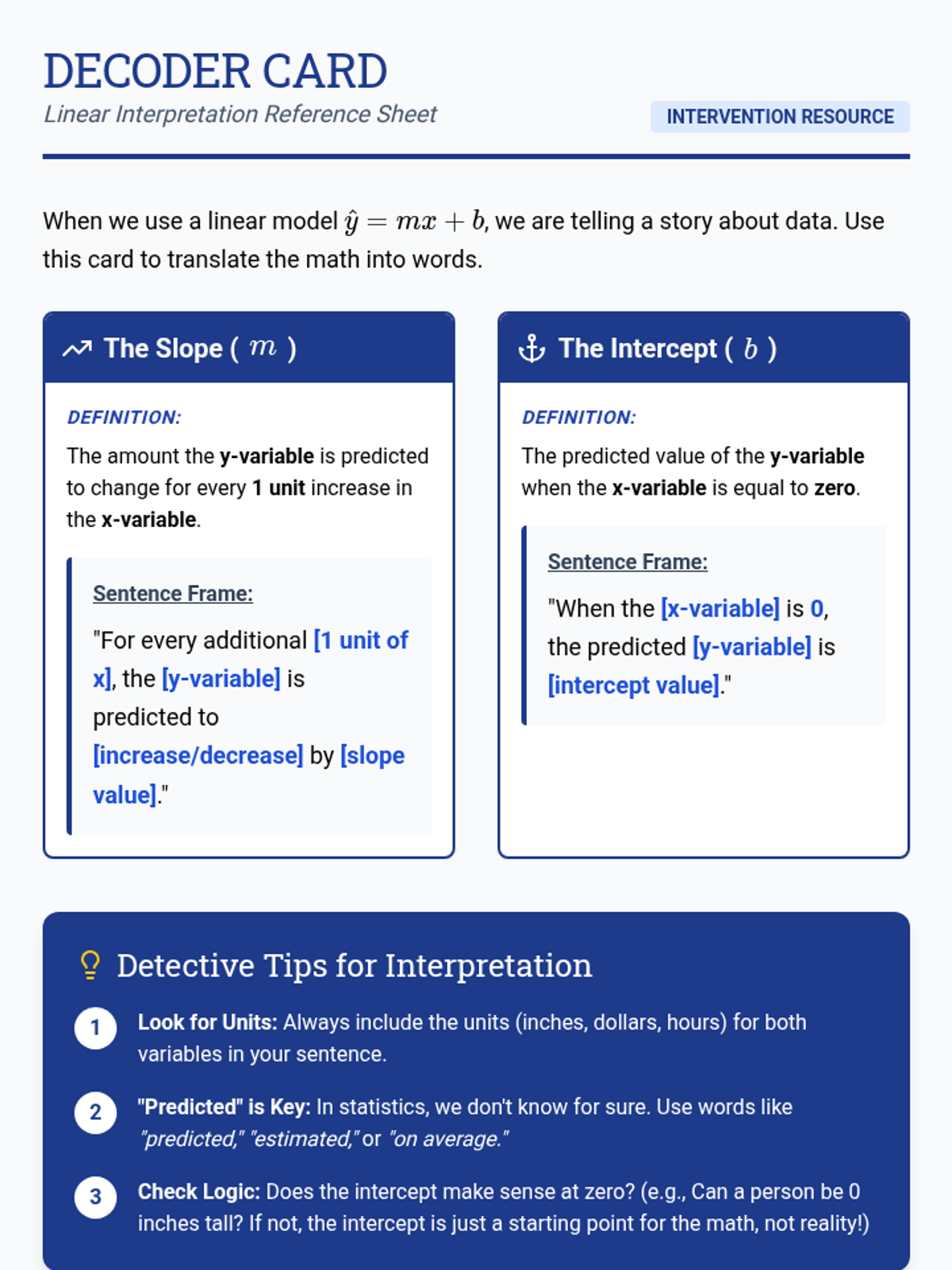 A specialized intervention sequence focusing on the foundational skills of linear modeling in statistics, specifically interpreting slope and intercept in real-world contexts. Designed for small groups requiring Tier 2 support.