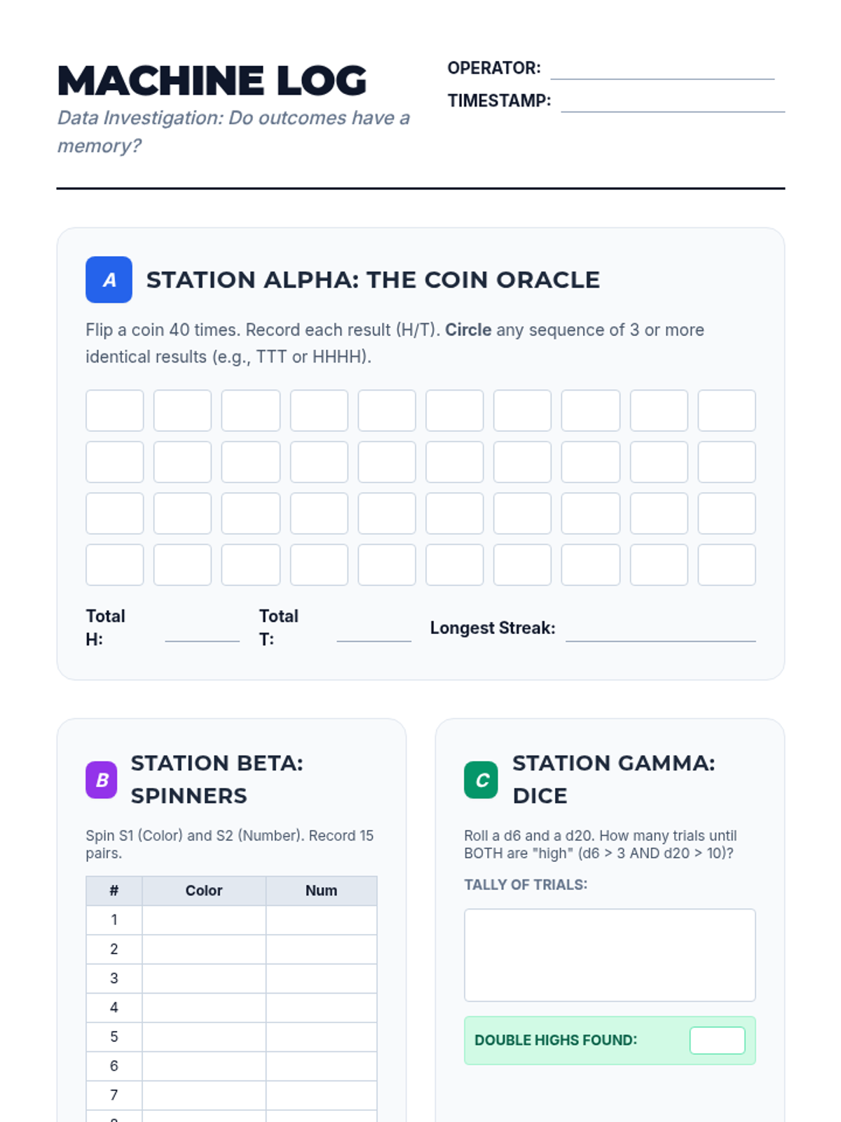 A simulation-based journey through statistical sampling, focusing on the Law of Large Numbers, variability, and the distinction between bias and precision. Students move from manual experiments to digital simulations to build intuition for statistical inference.