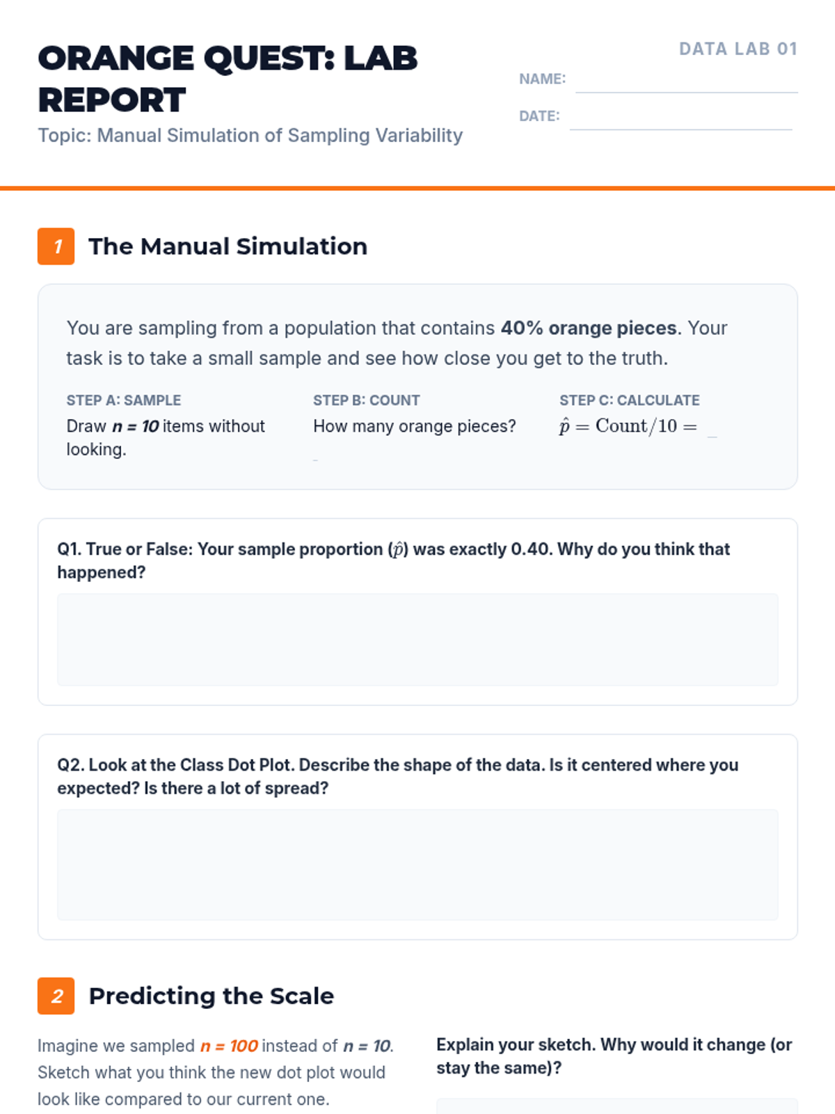 A project-based exploration of statistical sampling where students learn to define populations, determine sample sizes, design protocols, and make valid inferences. Students act as data consultants, moving from theoretical understanding to simulated data collection and analysis.