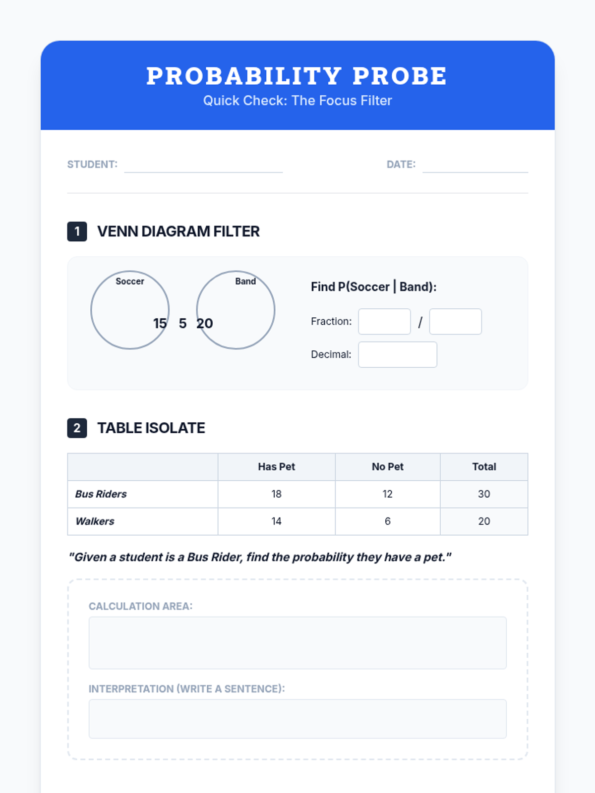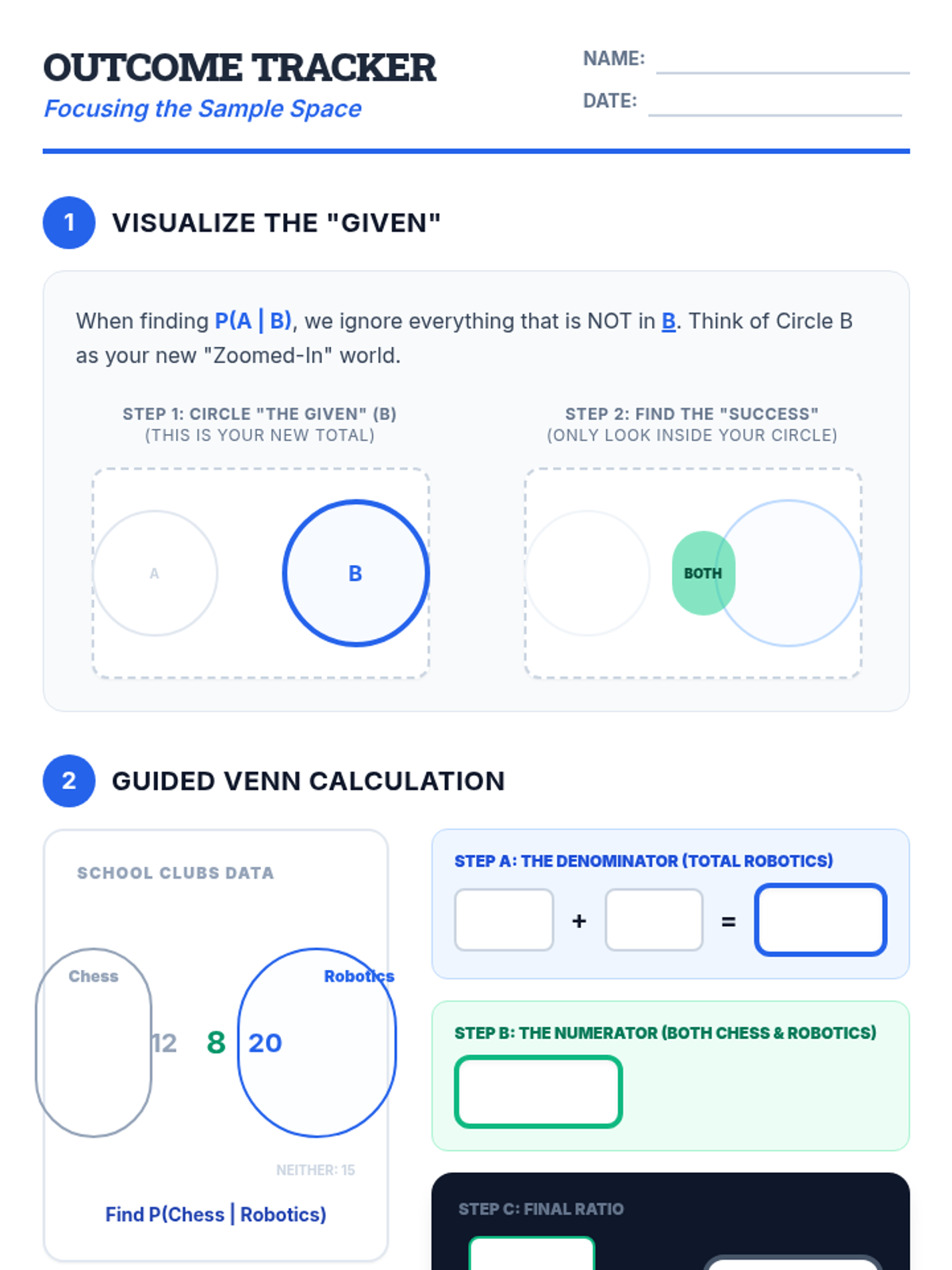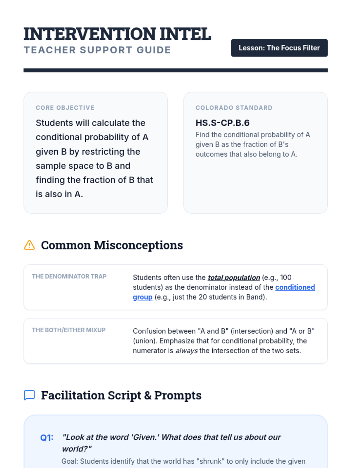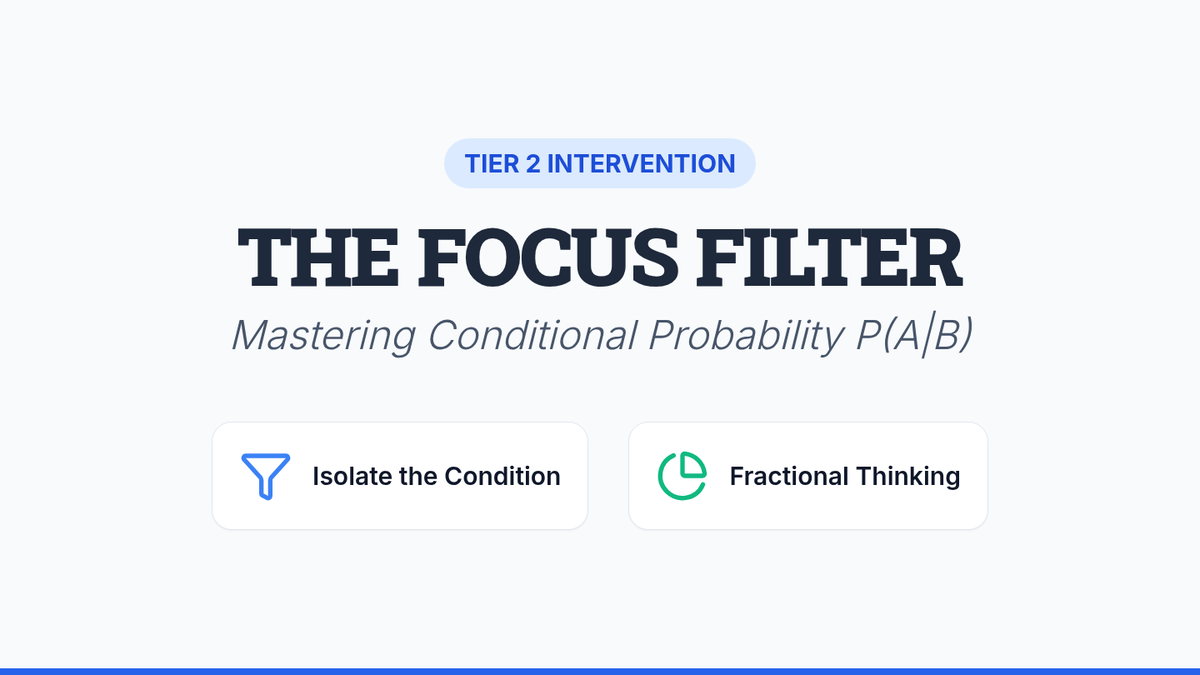 A Tier 2 intervention sequence focused on mastering conditional probability through visual filters and fractional reasoning. Students learn to restrict their sample space to the 'given' condition using Venn diagrams and tables.