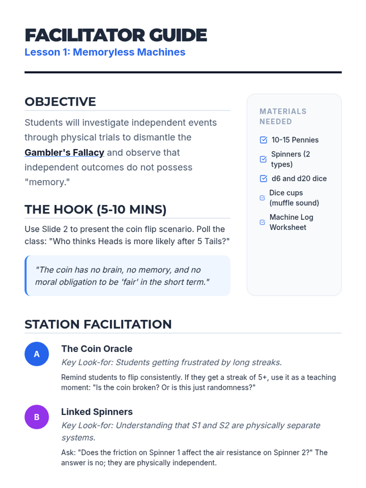 An inquiry-driven investigation into counter-intuitive probability. Students explore the Birthday Problem, Gambler's Fallacy, Monty Hall Problem, and Simpson's Paradox to understand why human intuition often fails in the face of compound event logic.