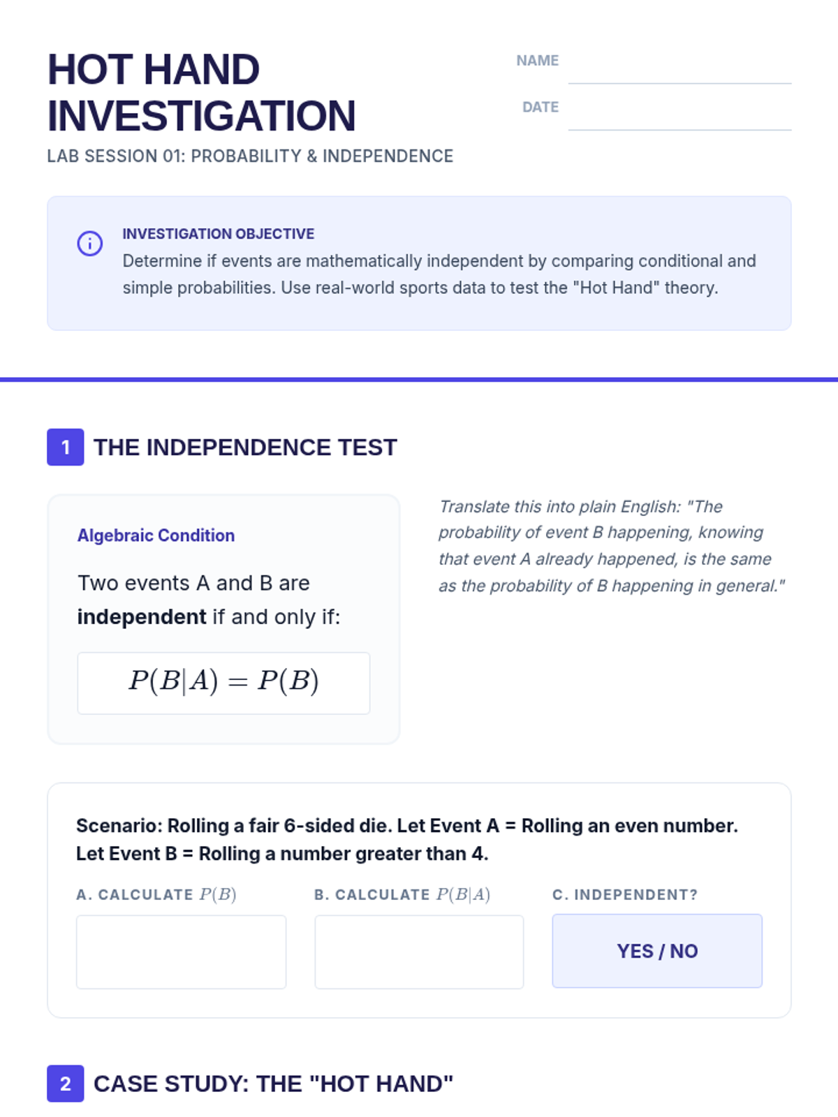 A deep dive into compound event probability, moving from conceptual independence to the algebraic rigor of the Multiplication Rule and conditional logic. Students analyze sports streaks, card games, and forensic evidence to master independent and dependent probabilities.