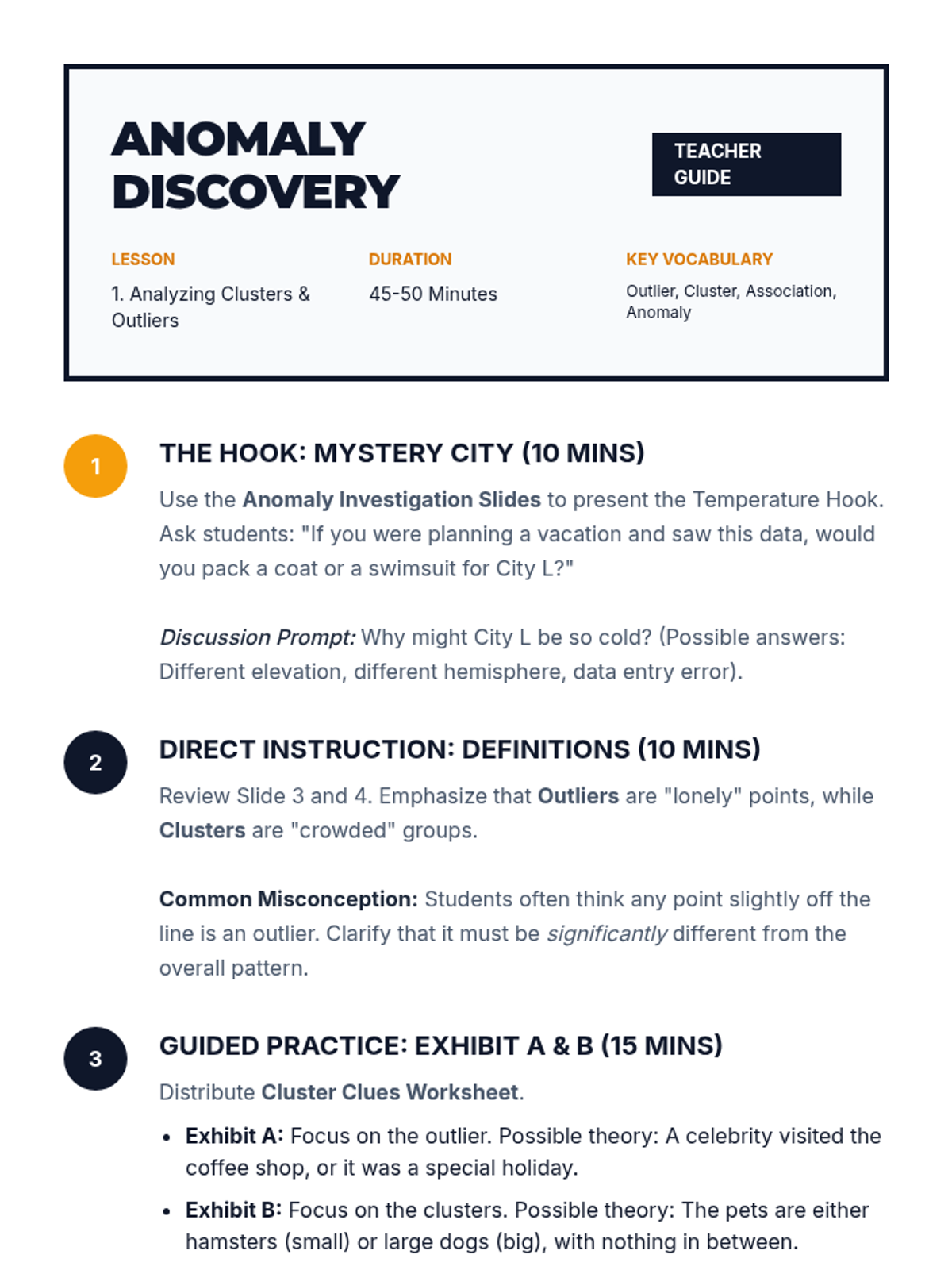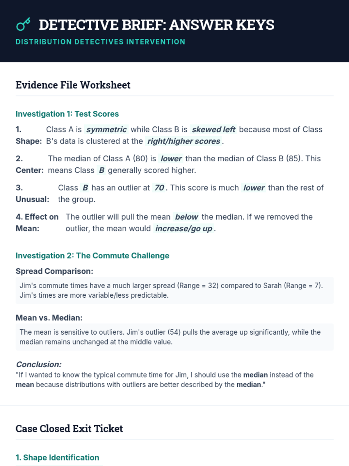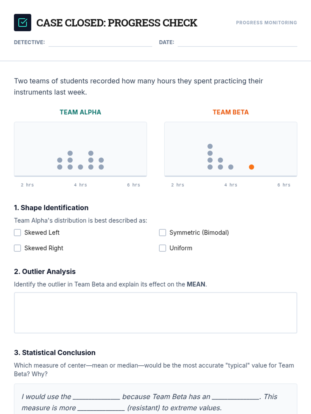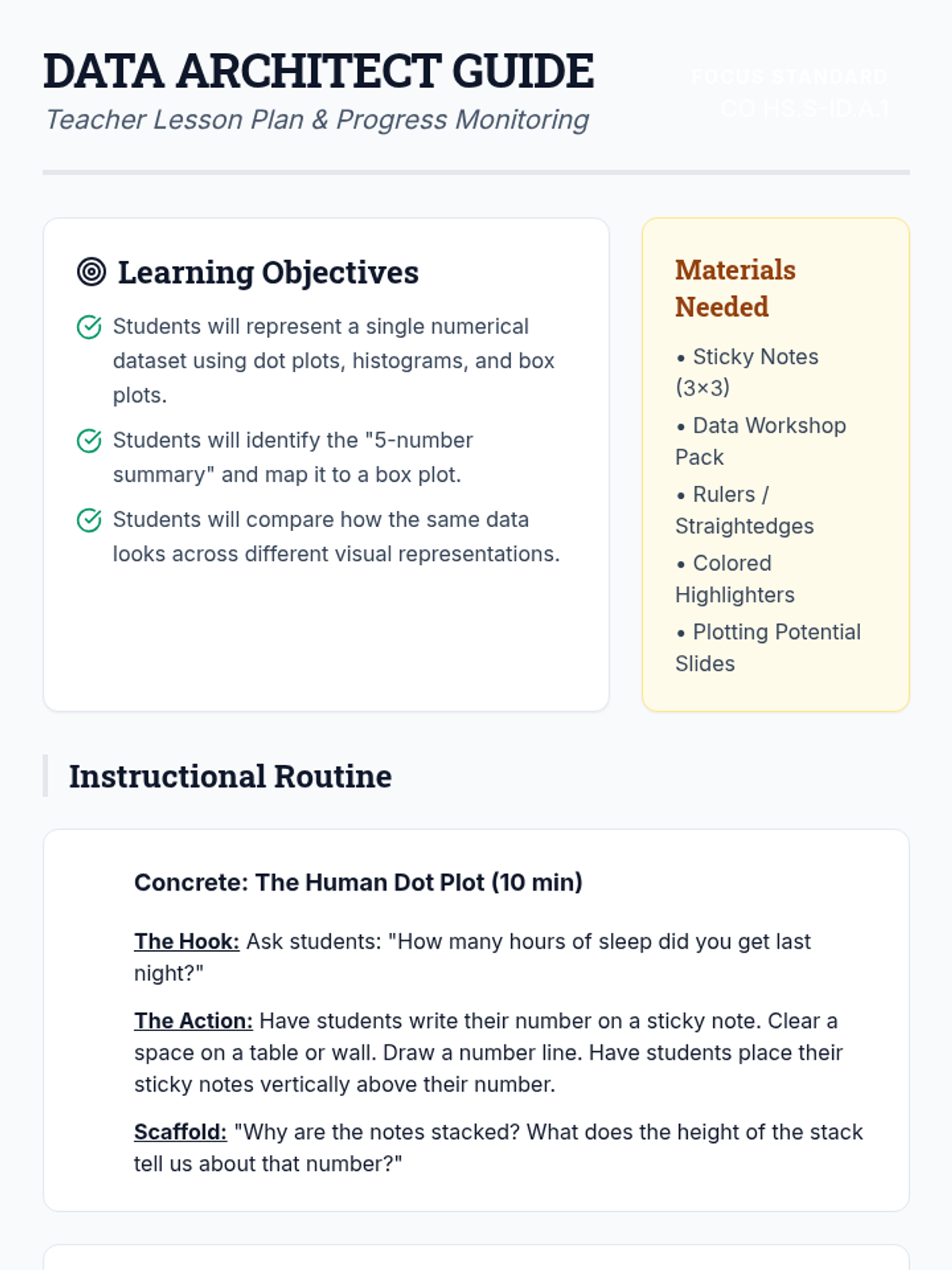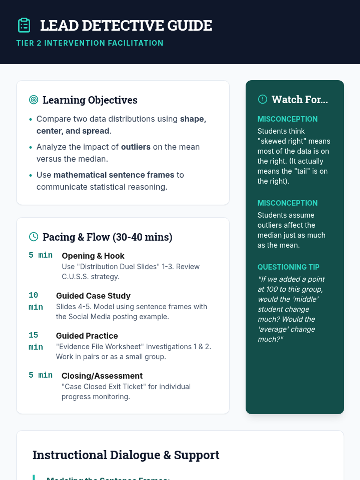 A targeted Tier 2 intervention for High School Statistics focusing on comparing data distributions (shape, center, spread) and understanding the impact of outliers. Includes scaffolded instruction, guided practice with sentence frames, and progress monitoring tools.