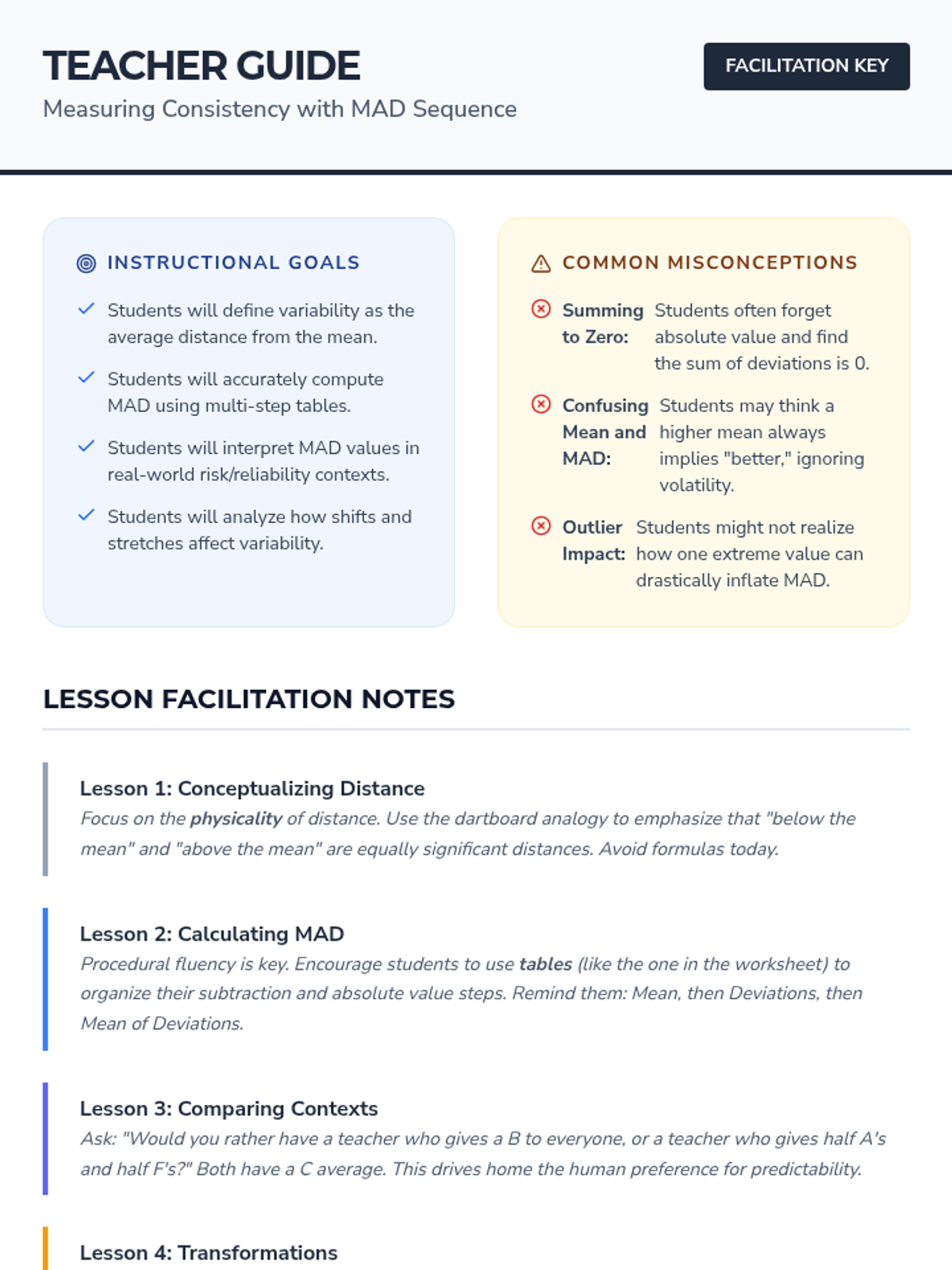 This project-based sequence explores consistency and volatility through the lens of Mean Absolute Deviation (MAD). Students analyze real-world datasets to understand how variability quantifies 'reliability' beyond simple averages.