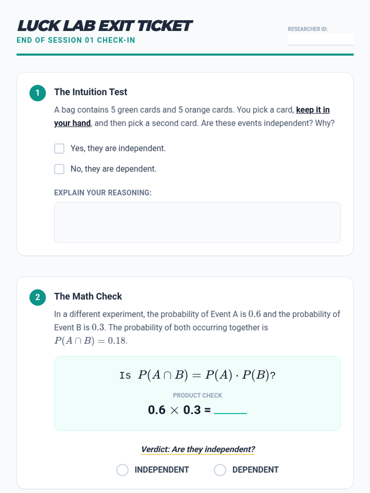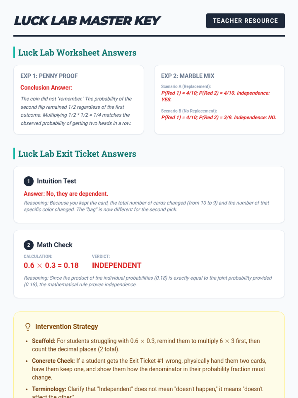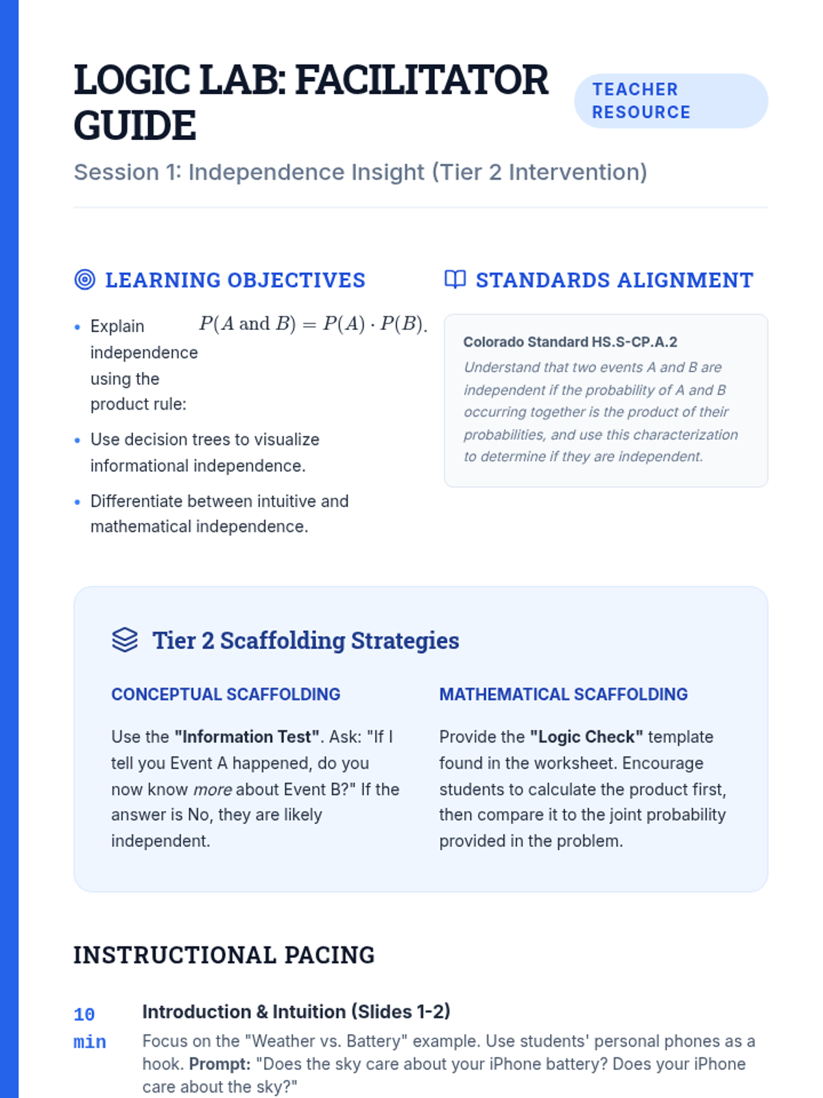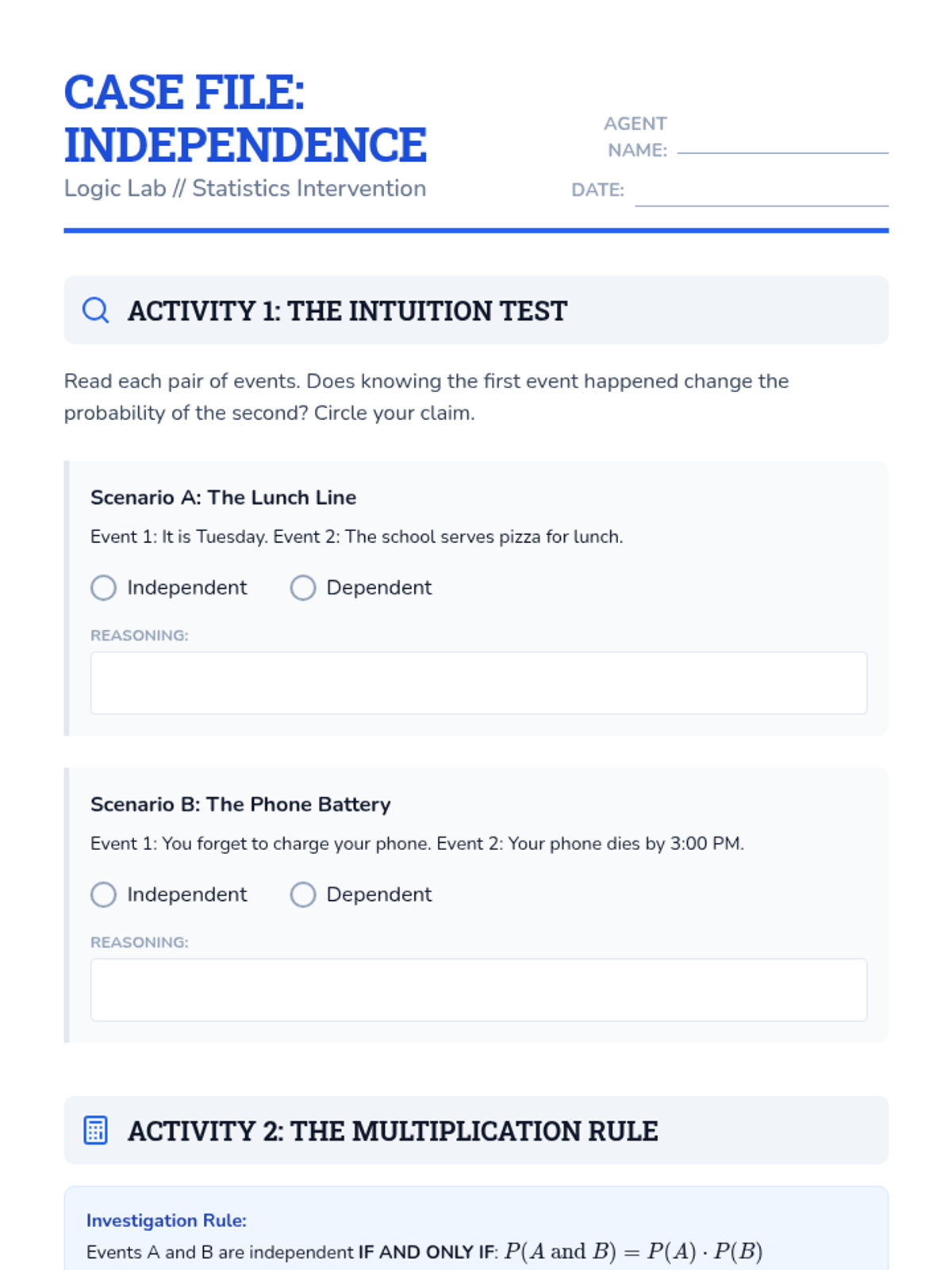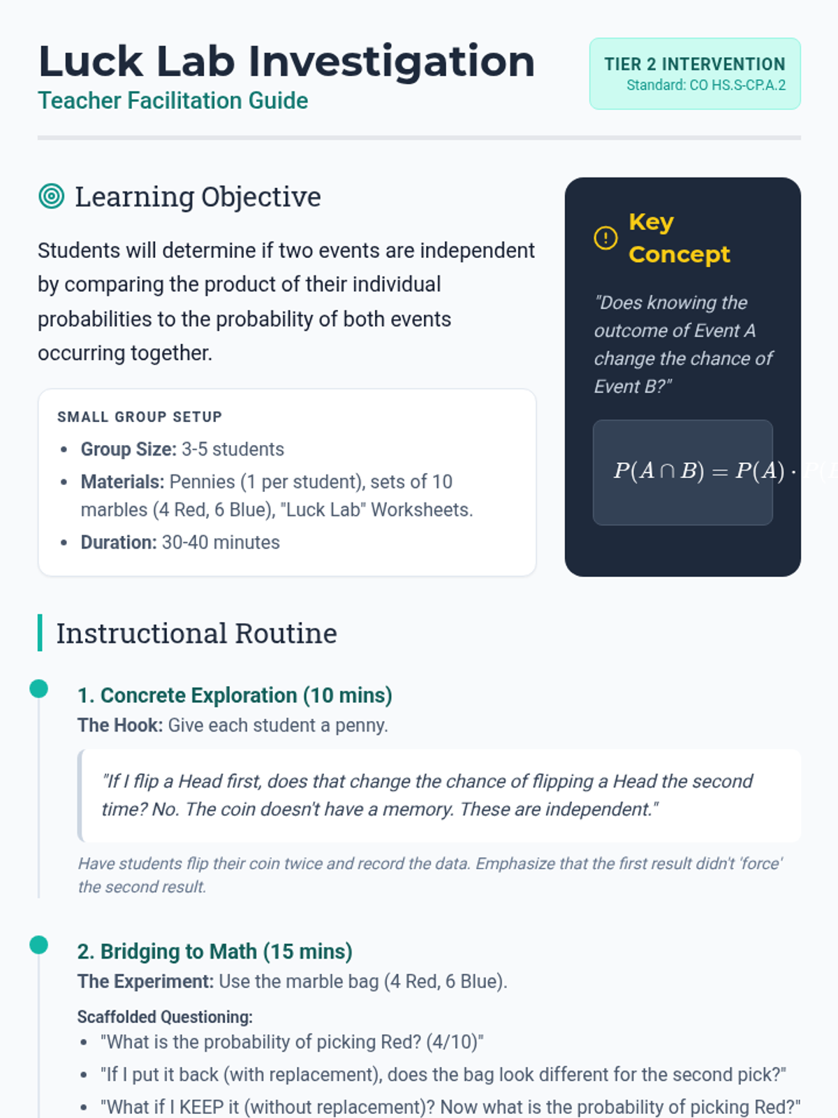 A targeted Tier 2 intervention unit focused on understanding and calculating the independence of two events using the multiplication rule. This sequence uses concrete manipulative-based experiments to bridge the gap between intuition and formal probability notation.