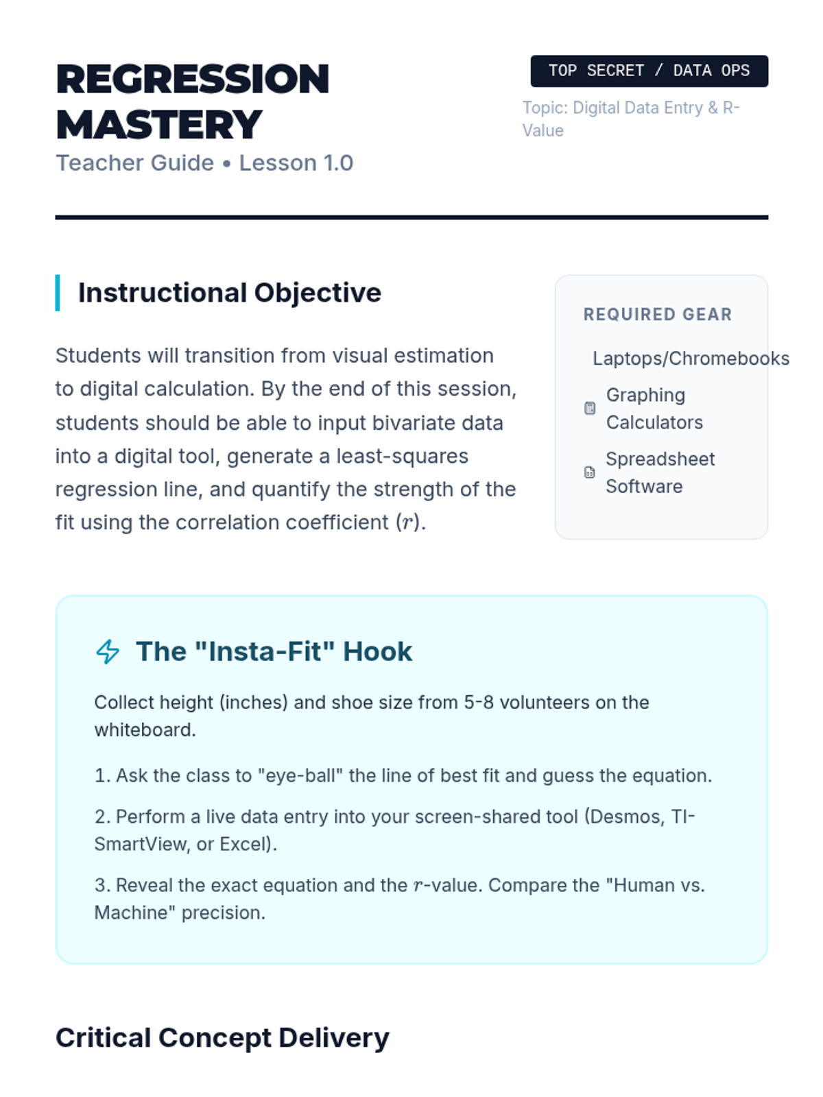 A project-based unit for 9th-grade students focusing on the reliability of linear models, technology-based regression, residual analysis, and the critical distinction between correlation and causation. Students transition from manual calculations to digital tools to defend data-driven predictions.