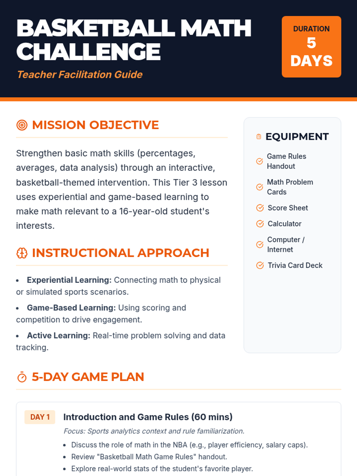 A 5-day math intervention for a high school student that uses basketball statistics and simulation to teach percentages, averages, and data analysis.