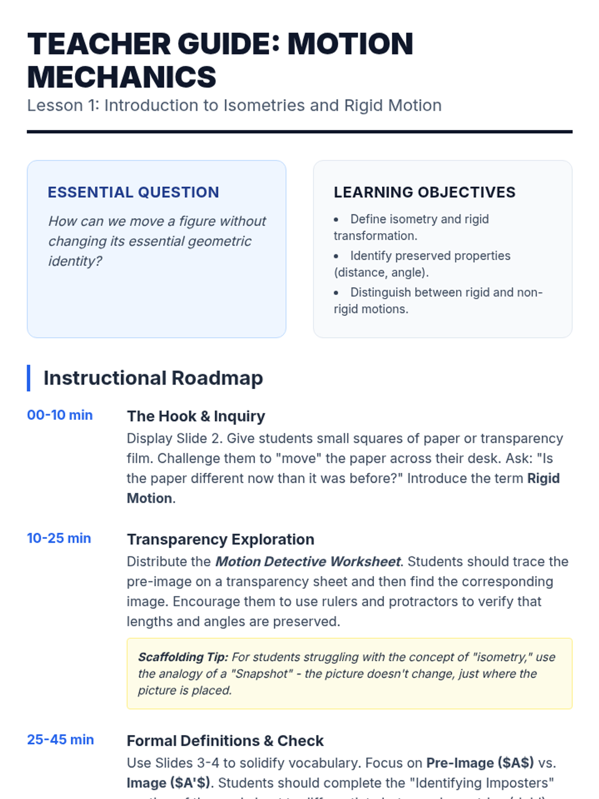 A comprehensive unit for 9th-grade geometry covering rigid transformations (isometries) in the coordinate plane. Students explore translations, reflections, and rotations, transitioning from physical manipulation to formal algebraic rules.