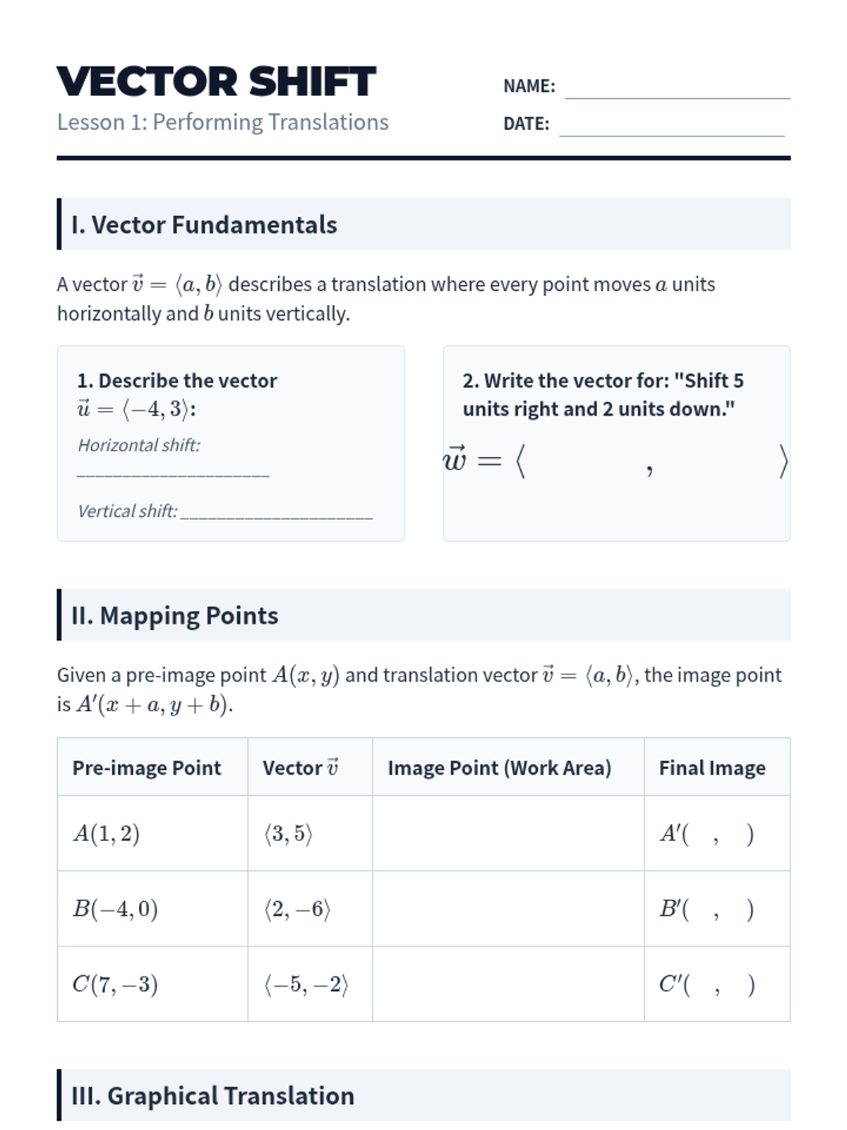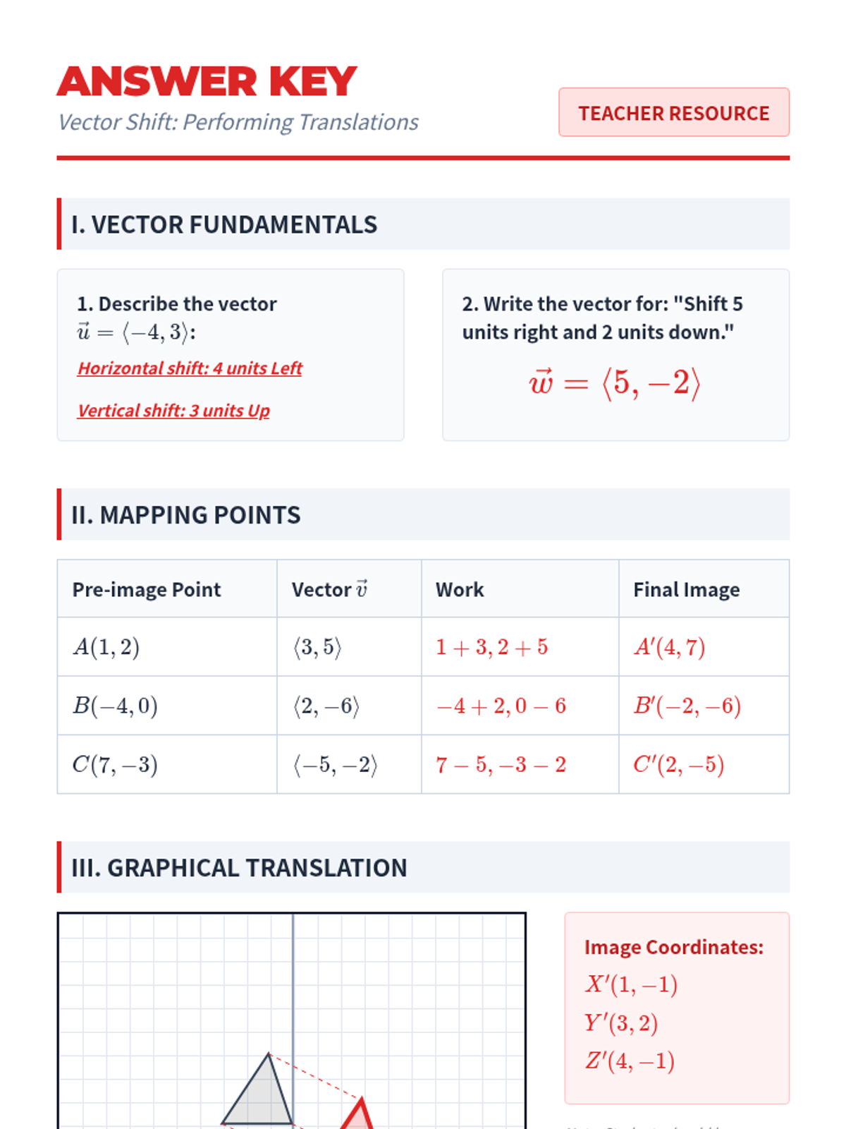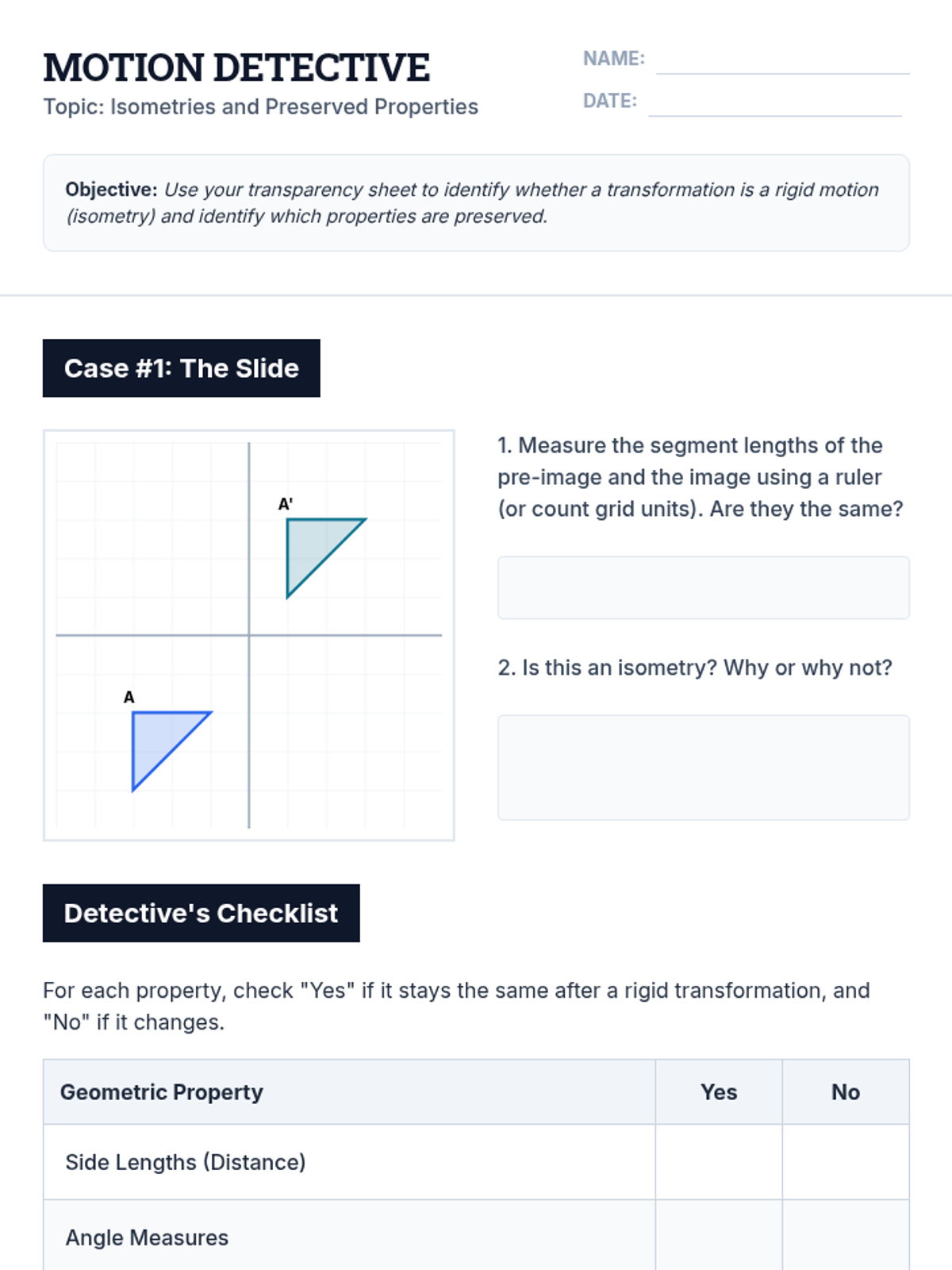A comprehensive unit on the three primary rigid transformations: translations, reflections, and rotations. Students move from physical manipulation to precise geometric descriptions using vectors, lines of reflection, and centers of rotation to prepare for the study of congruence.