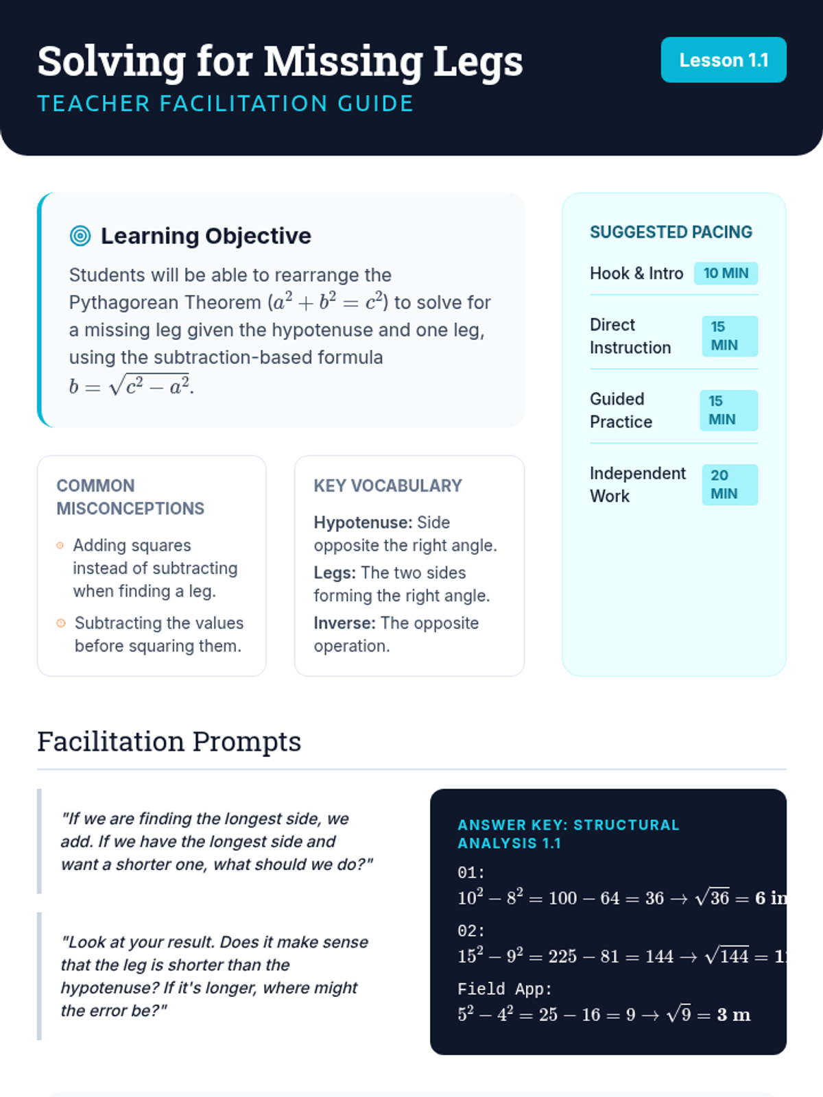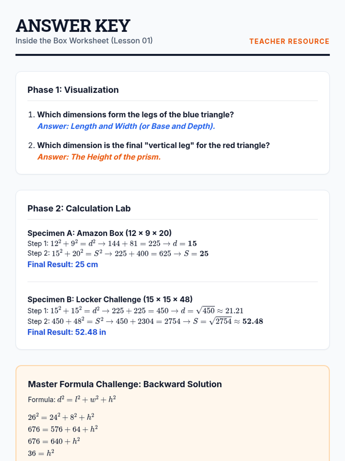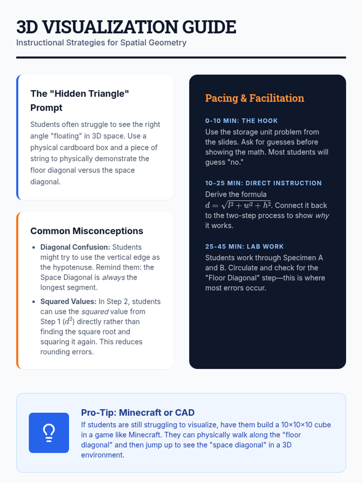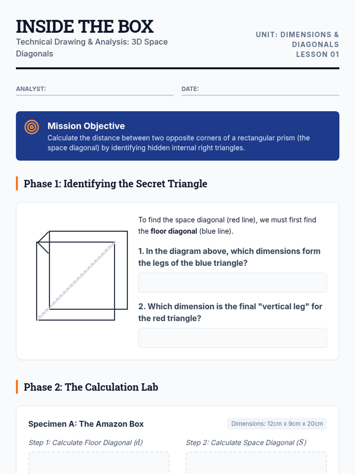 This advanced geometry sequence explores the Pythagorean Theorem in three dimensions and complex modeling scenarios. Students move from calculating space diagonals in prisms to optimizing paths on surfaces and designing ADA-compliant structures.