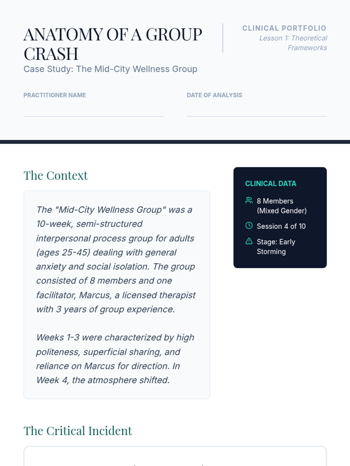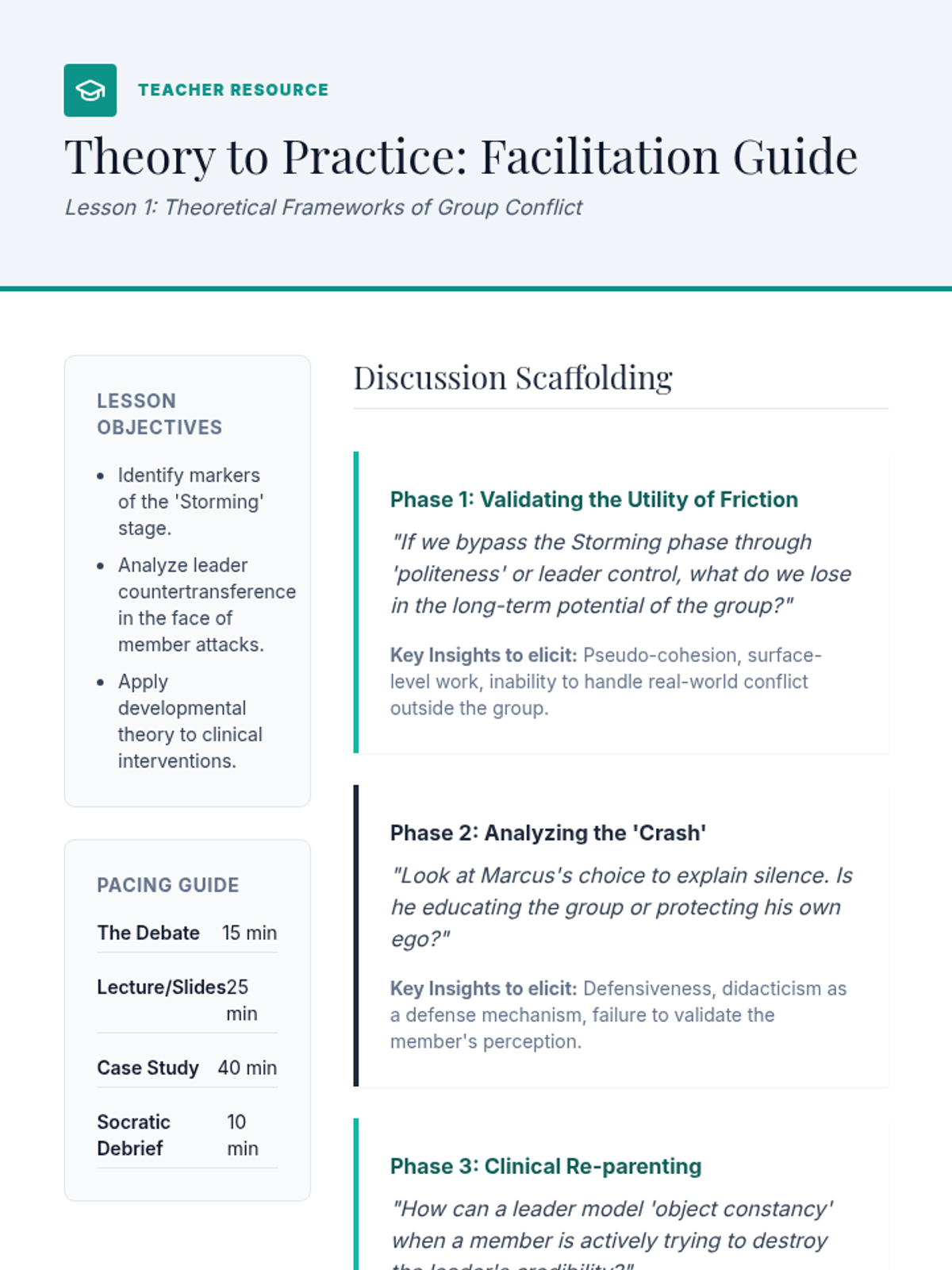 A comprehensive graduate-level sequence exploring conflict resolution, challenging member behaviors, and crisis management within group therapy. Students move from theoretical 'Storming' stage frameworks to hands-on simulation of de-escalation and restorative dialogue.