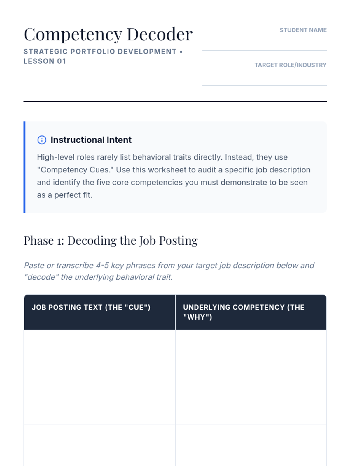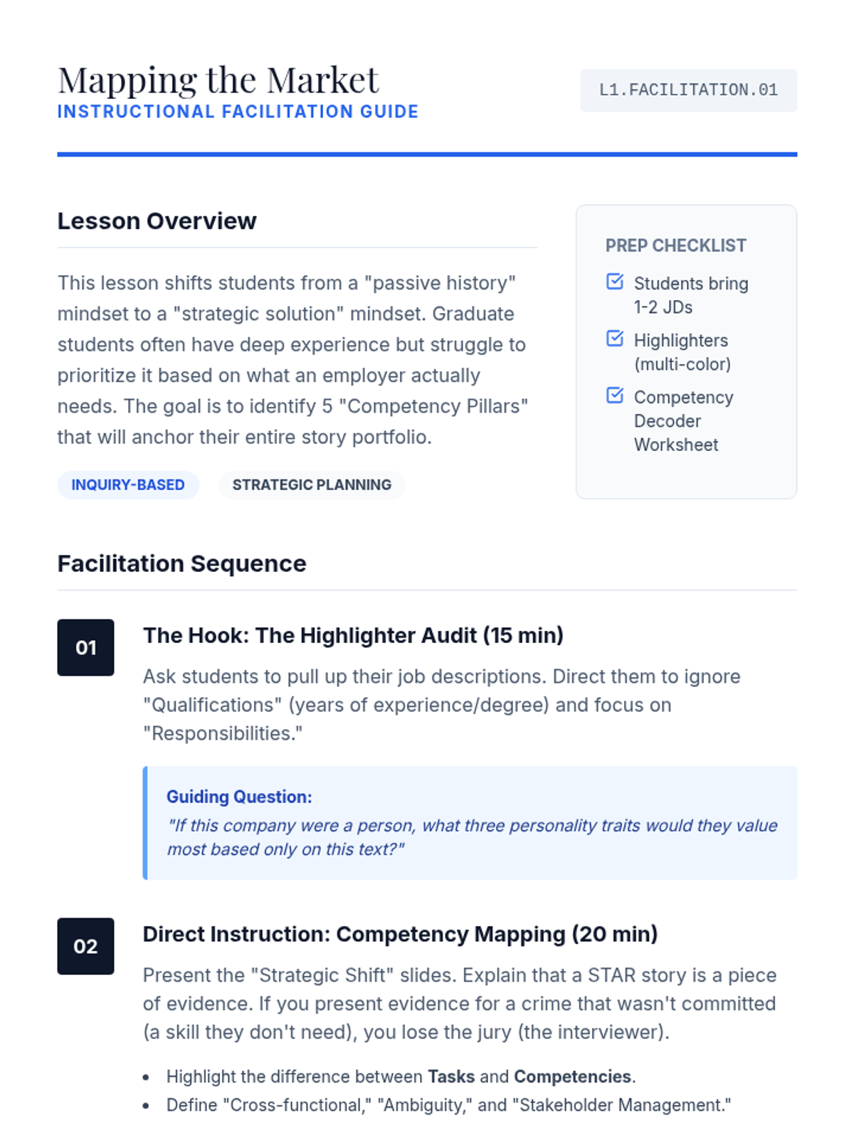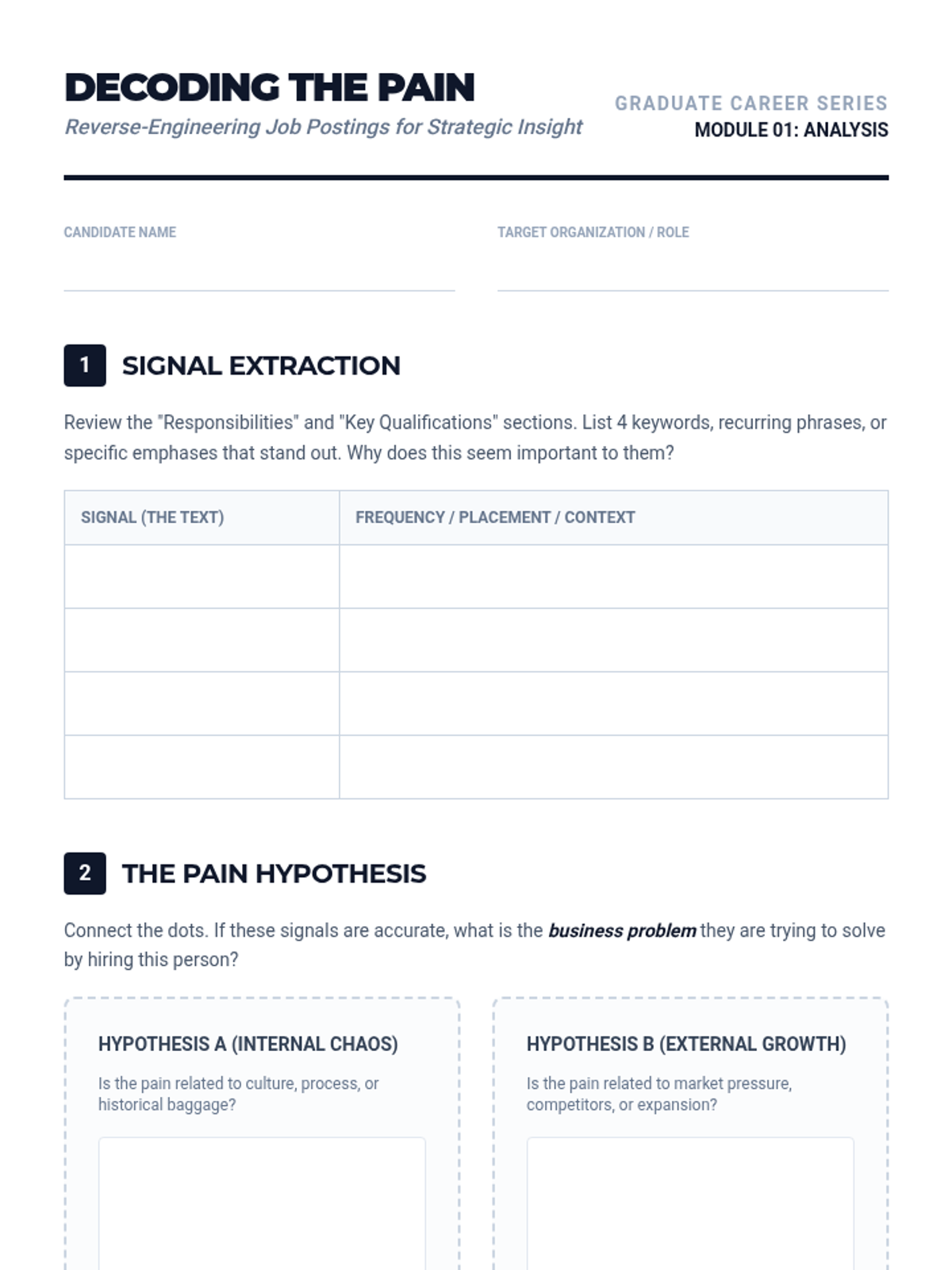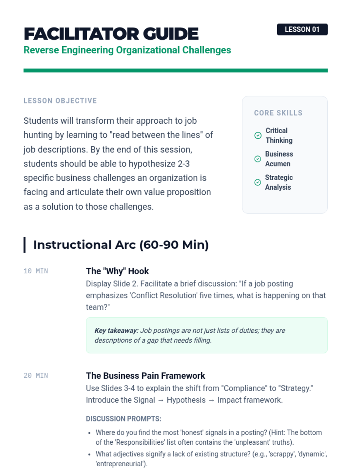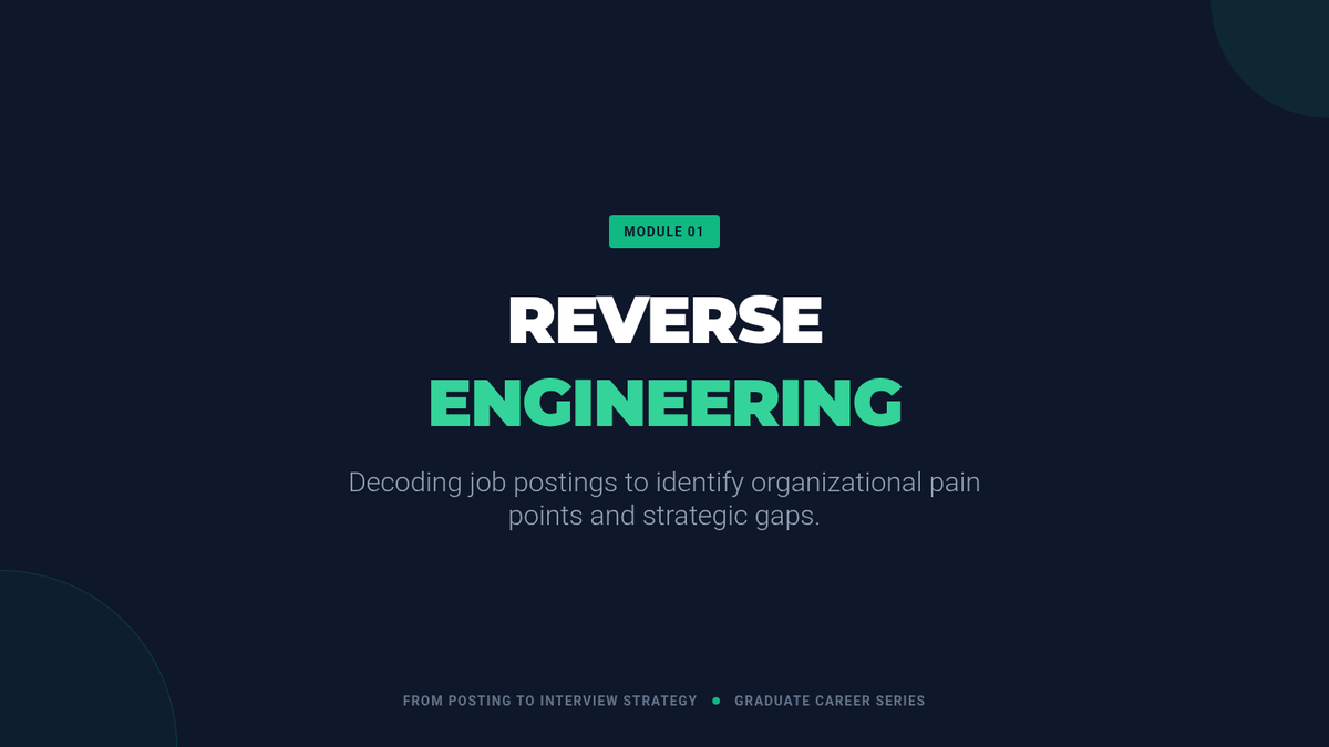 A 5-lesson sequence for graduate students focused on reverse-engineering job postings to identify organizational pain points, map stakeholder ecosystems, and develop high-impact interview strategies. Students transition from passive readers to strategic consultants by decoding job descriptions.