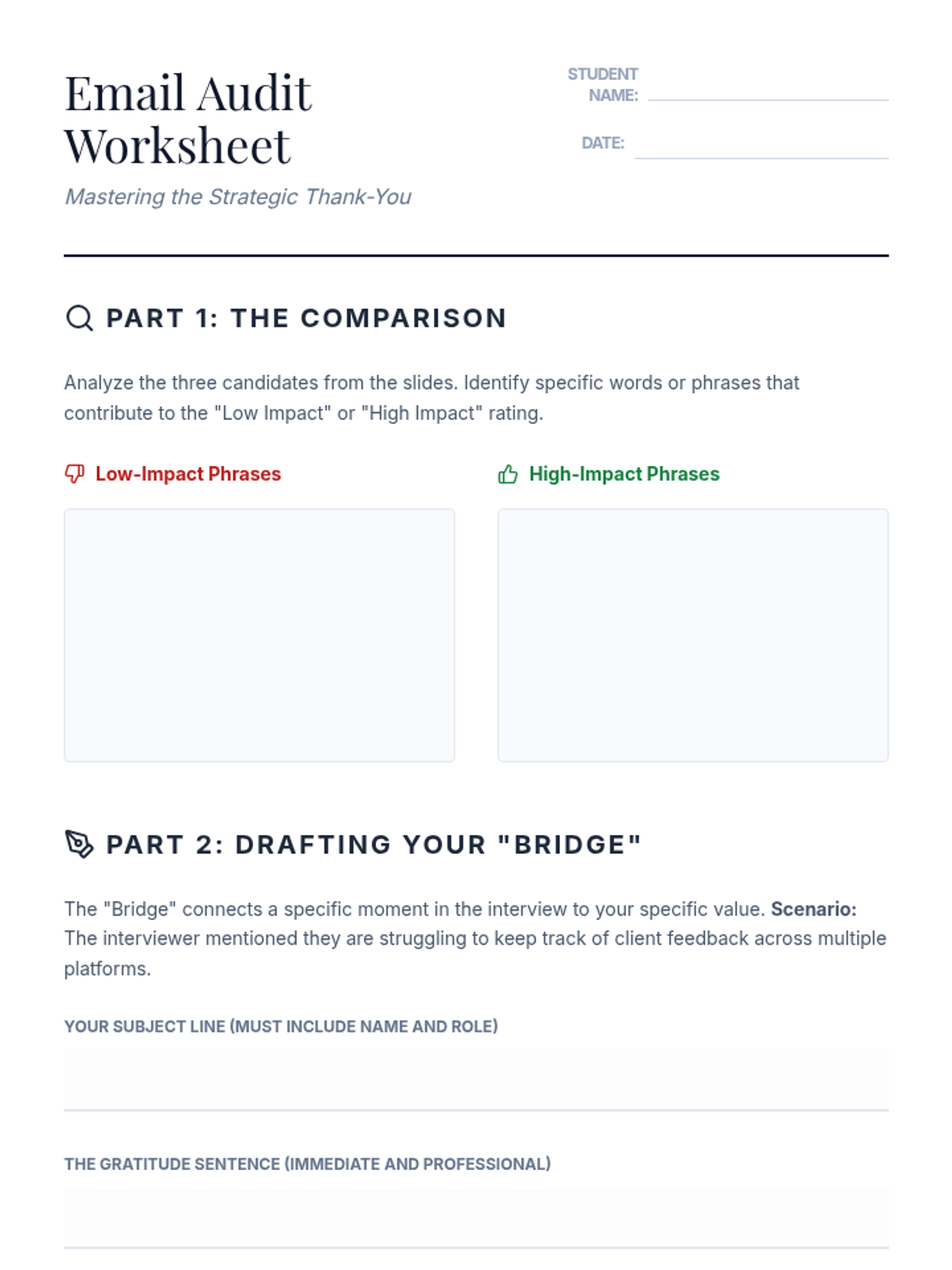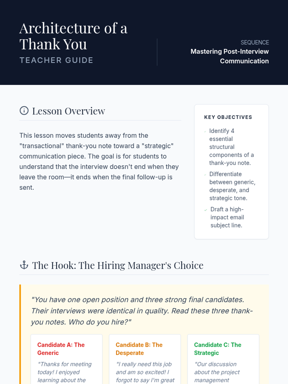 This comprehensive sequence guides undergraduate students through the strategic nuances of post-interview communication. Students will master the art of writing high-impact thank-you notes, addressing interview gaps, navigating professional etiquette, and managing communication during hiring delays to build a robust professional portfolio.