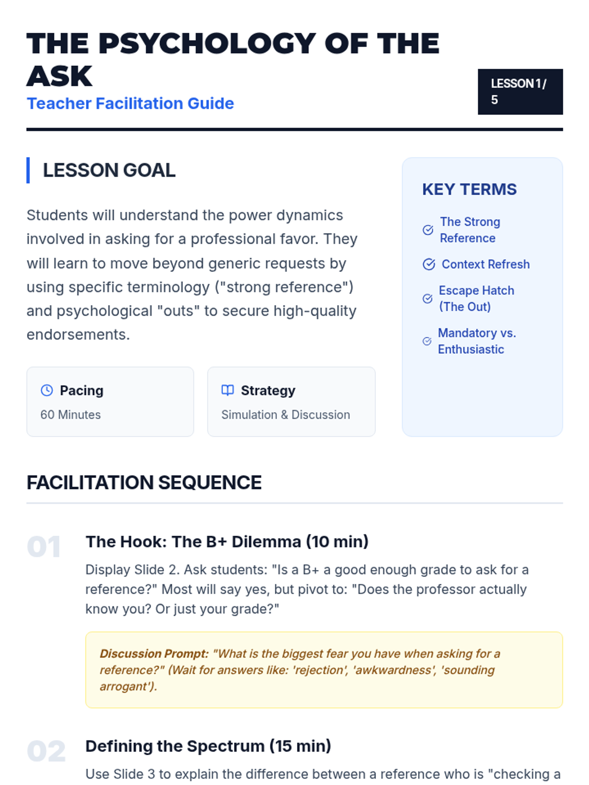A comprehensive guide for undergraduate students to master the interpersonal dynamics and communication strategies required for managing professional reference relationships. This sequence covers everything from the initial request to interpreting hesitation, coaching references for success, and maintaining long-term professional bonds.