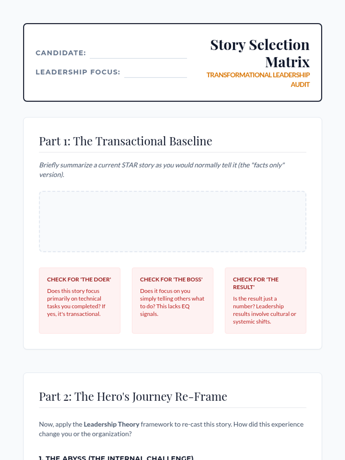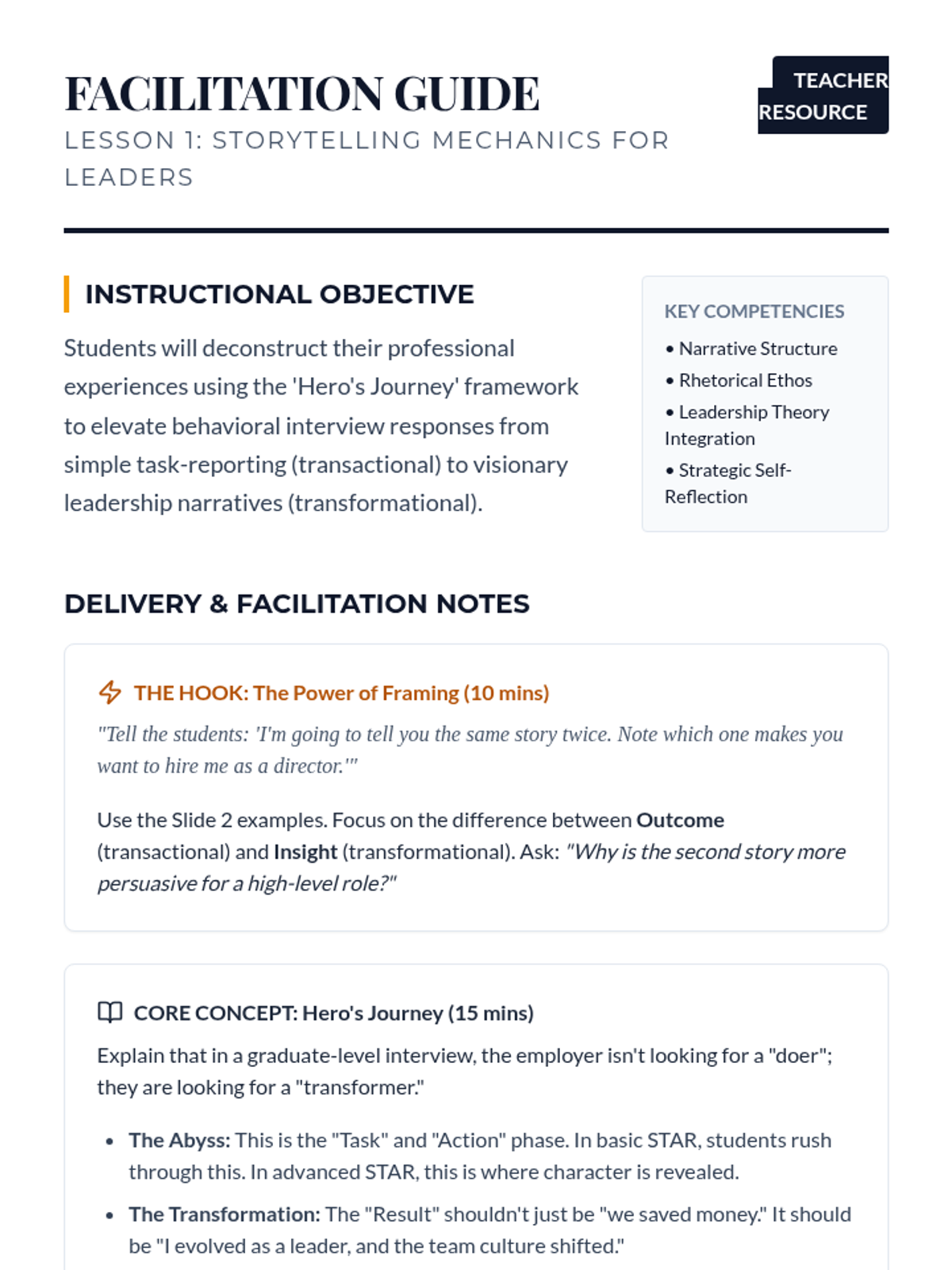 A high-level sequence for graduate students focusing on the rhetorical and leadership elements of the STAR method. Students move beyond basic reporting to craft sophisticated narratives that demonstrate vision, emotional intelligence, and organizational alignment for executive-level roles.
