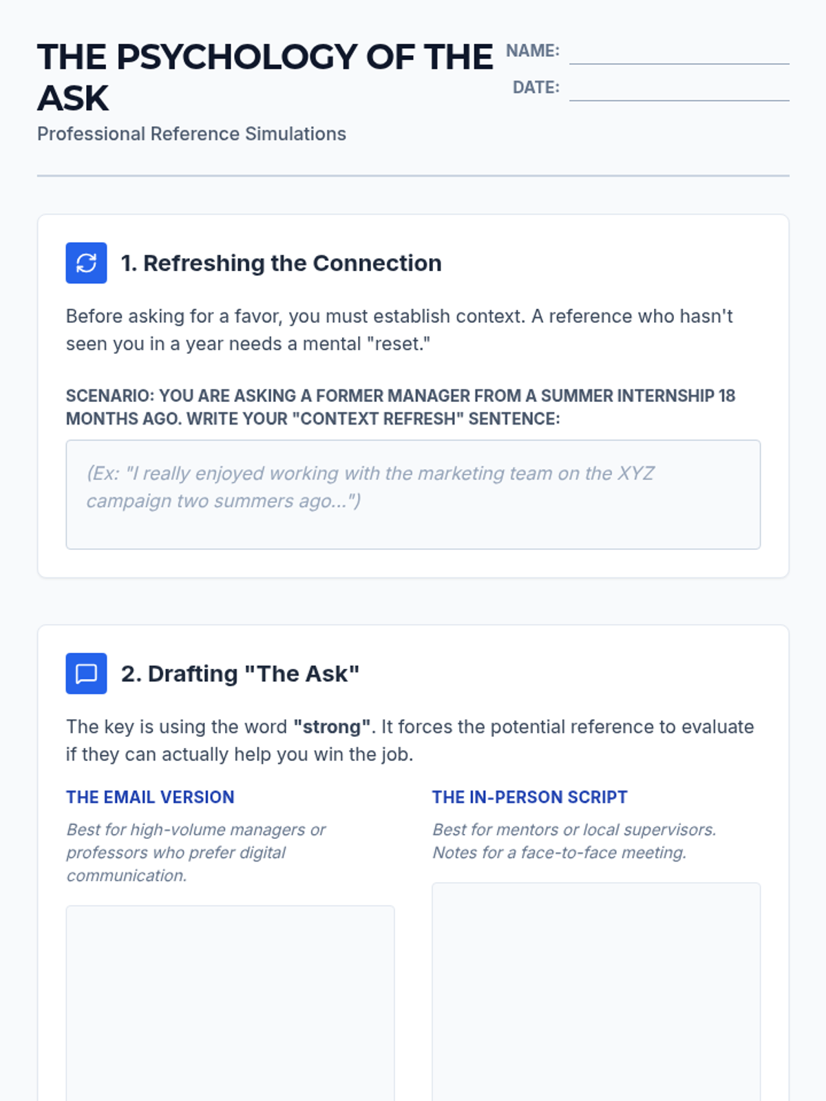 This sequence equips graduate students with the tactical communication skills needed to manage professional references. It focuses on shifting from a passive 'ask' to an active 'briefing' strategy, ensuring references are prepared with specific talking points and context to advocate effectively for the candidate.