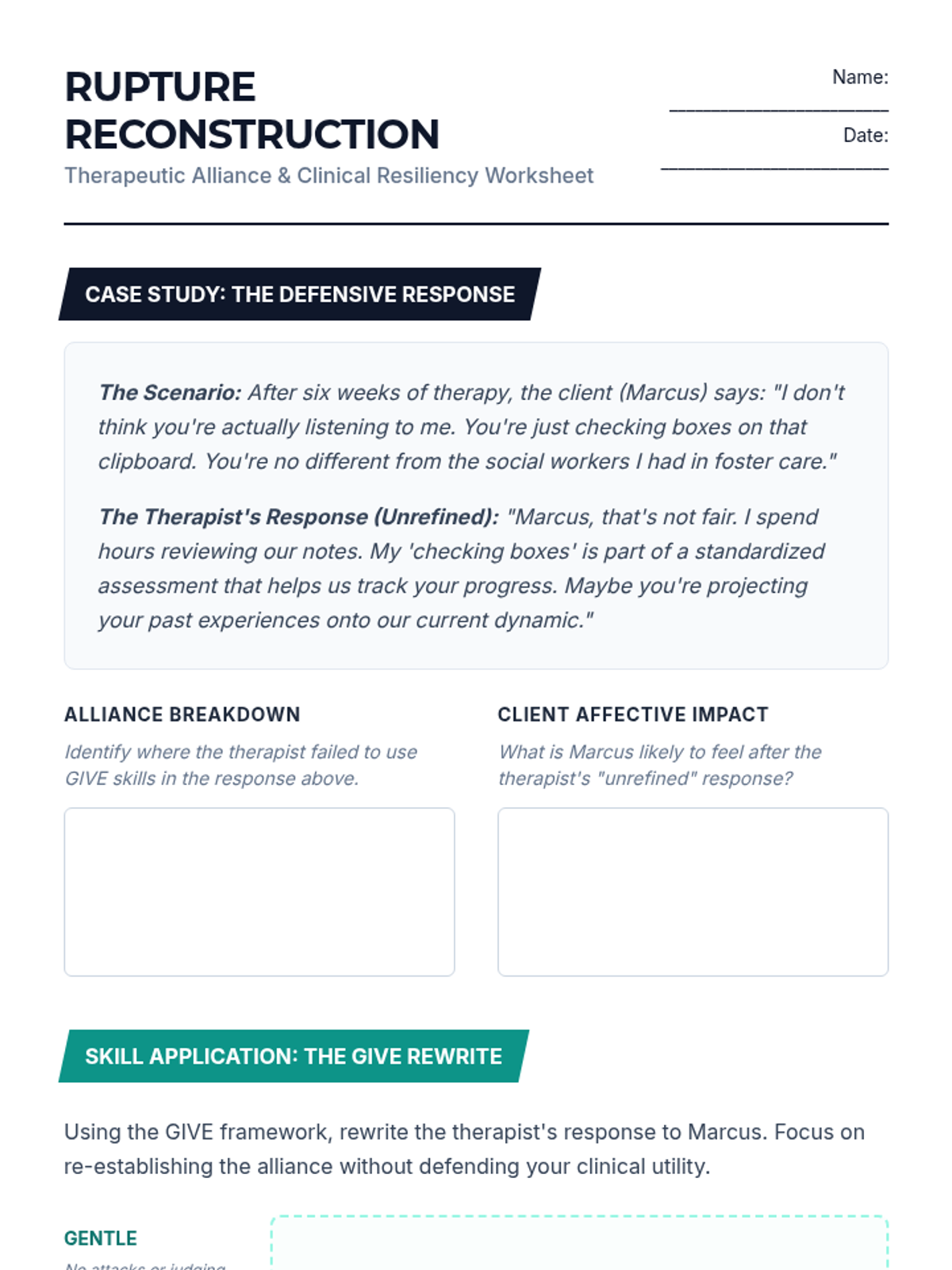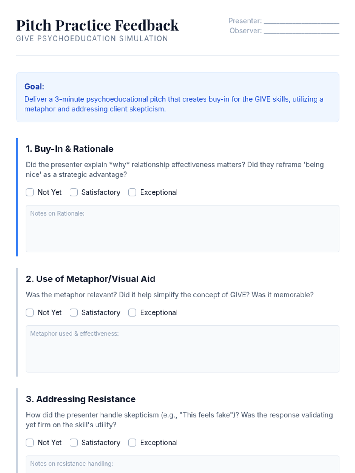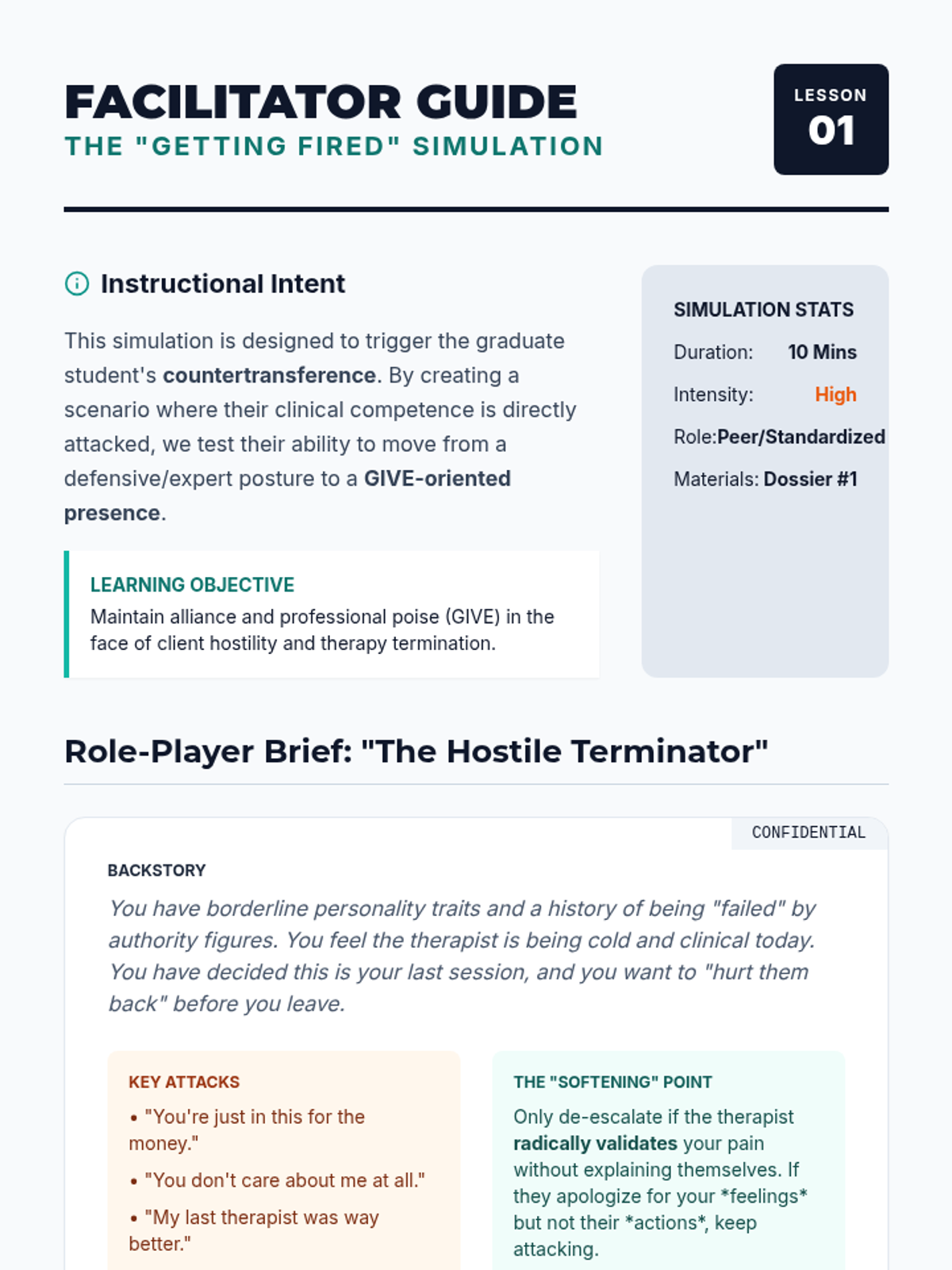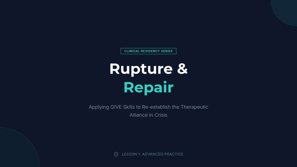 An advanced clinical training sequence for graduate counseling students focused on the "Self of the Therapist" through the application of GIVE skills in high-stakes professional and therapeutic scenarios. Students move from theoretical understanding to high-fidelity simulations and micro-analytical self-assessment.