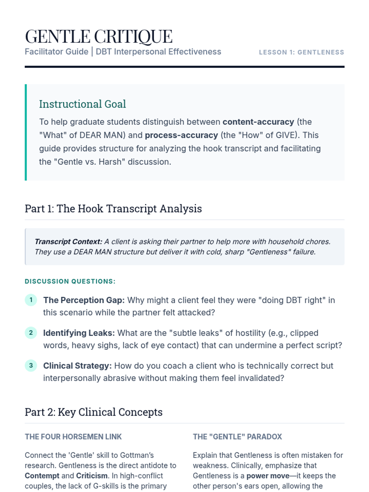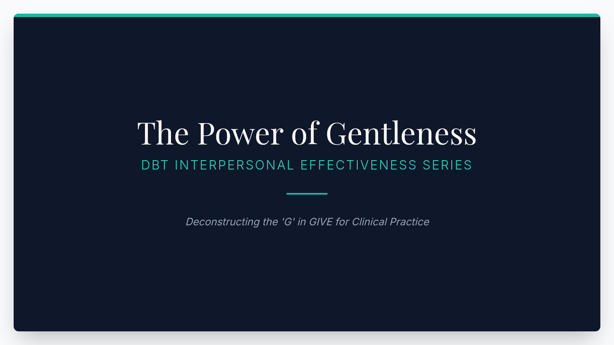 A comprehensive graduate-level course focused on the pedagogy of teaching DBT GIVE skills. This sequence prepares future therapists to facilitate psychoeducation, coach validation, address clinical barriers, and adapt interpersonal effectiveness skills for diverse populations.