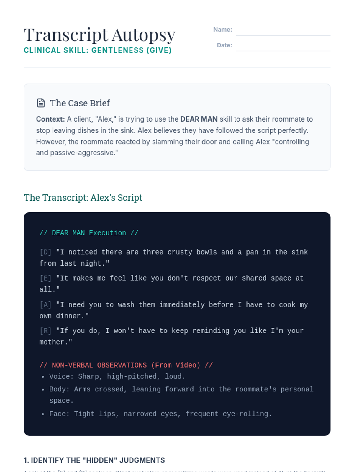 This graduate-level sequence deconstructs the GIVE skill set (Gentle, Interested, Validate, Easy Manner) within DBT, focusing on clinical conceptualization, neurobiological underpinnings, and differential application in complex interpersonal systems. Students progress from theoretical analysis to sophisticated treatment planning and case conceptualization.
