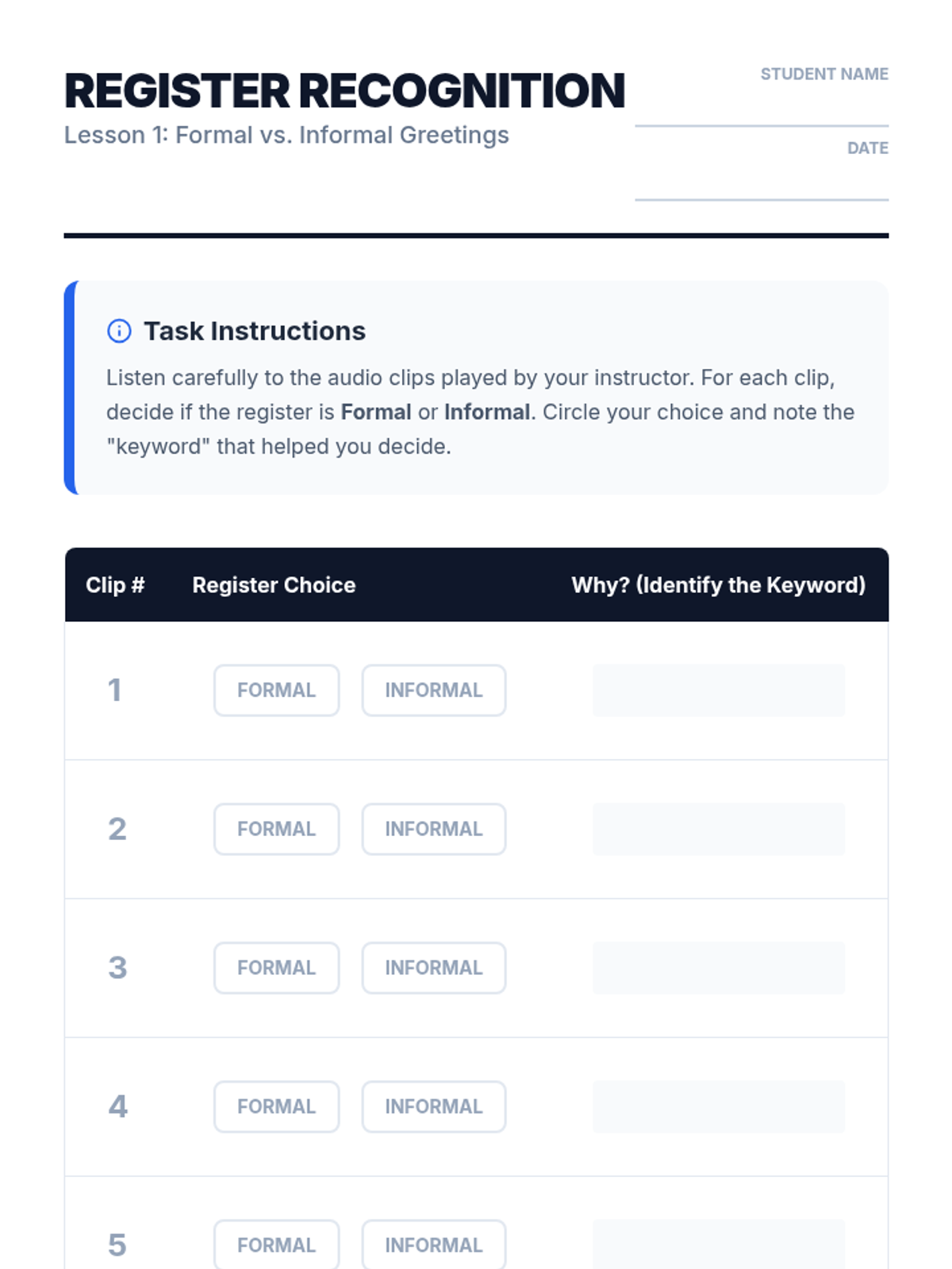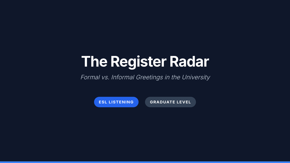 A specialized ESL listening sequence for graduate students, focusing on navigating academic registers, classroom imperatives, campus logistics, and administrative interactions. Students will develop the ability to distinguish between formal and informal tones and follow multi-step oral instructions in a university setting.