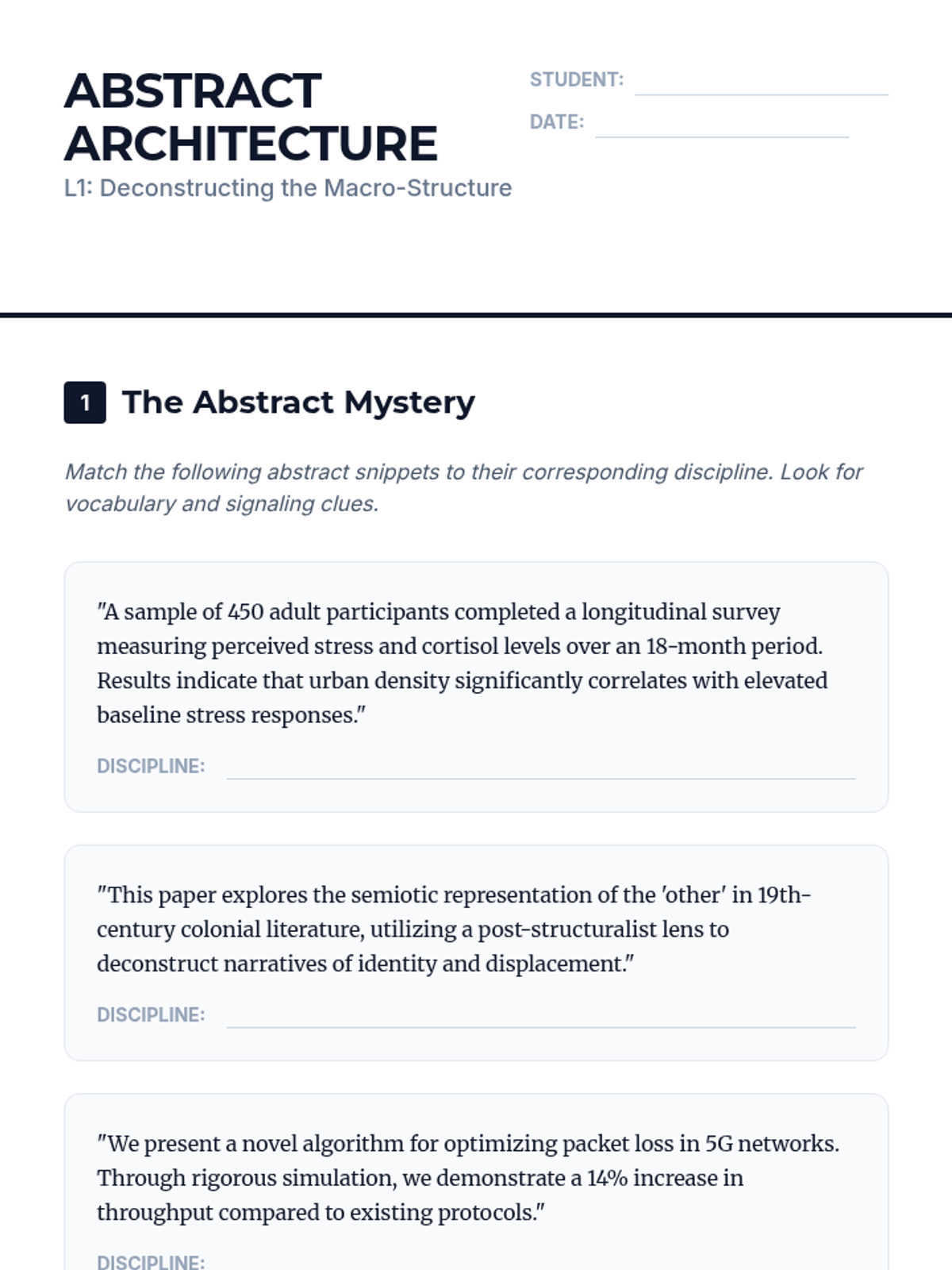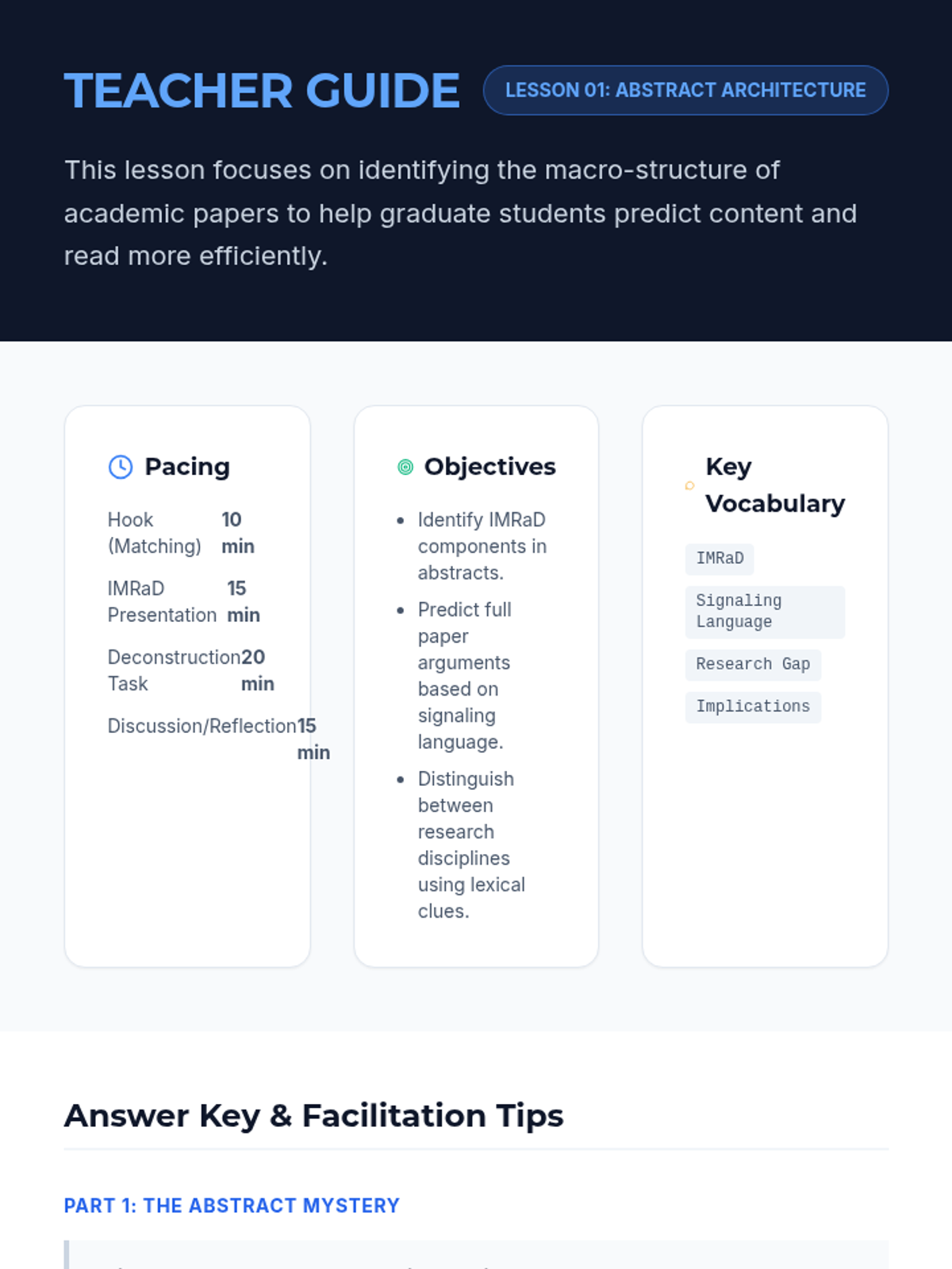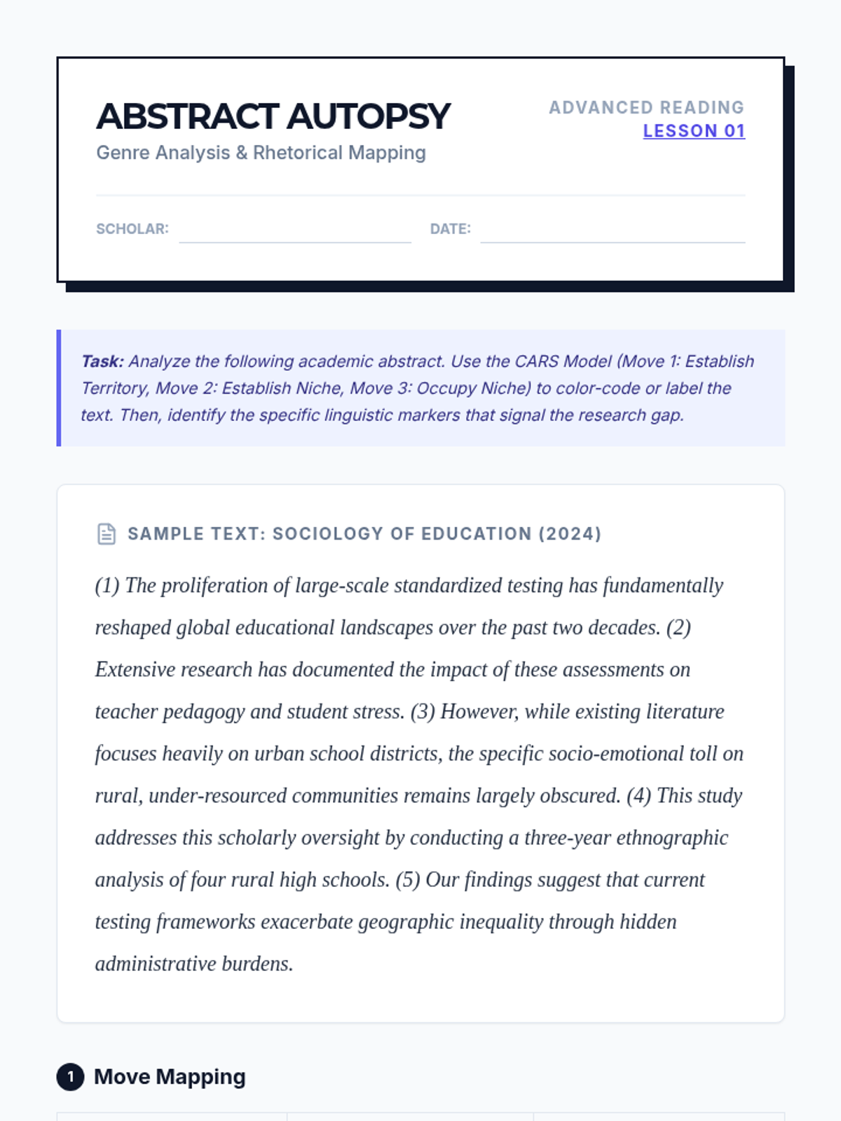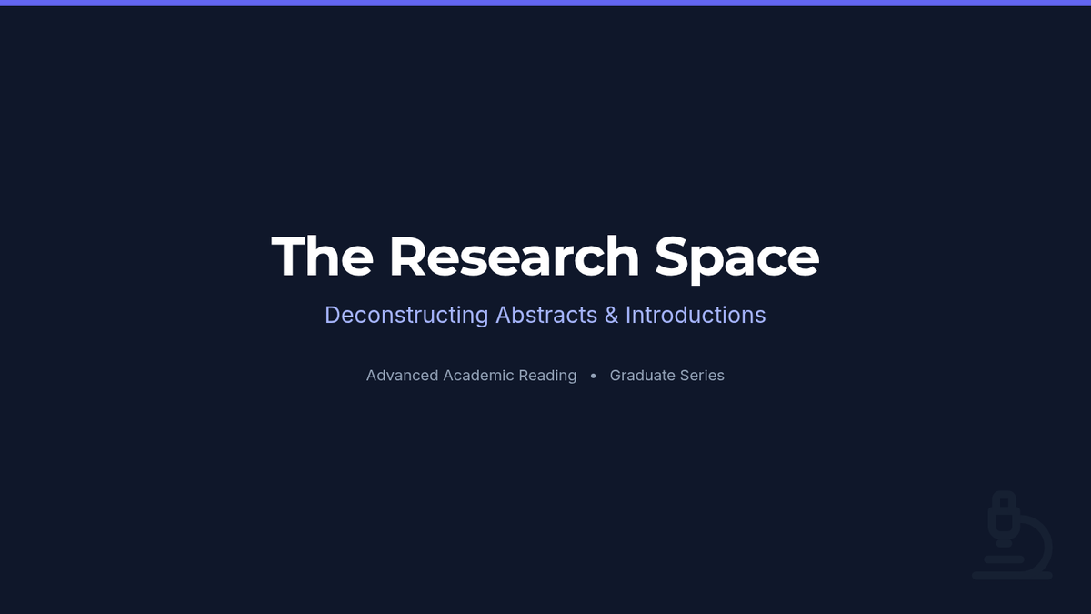 An advanced academic reading sequence for graduate students, focusing on the rhetorical structures of scholarly discourse. Students will deconstruct abstracts, synthesize literature, analyze hedging/stance, and critique methodological validity to master high-level academic communication.