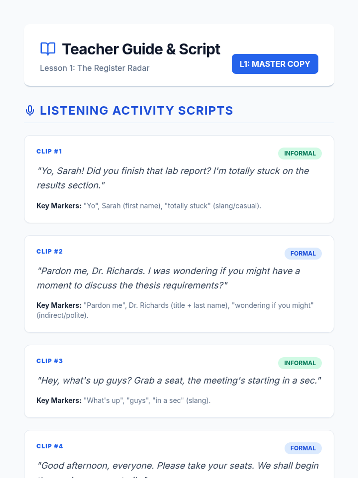 This sequence helps graduate students navigate the nuances of academic and professional English. Students learn to adjust their linguistic register based on context, audience, and power dynamics, moving from formal lectures to casual networking events.