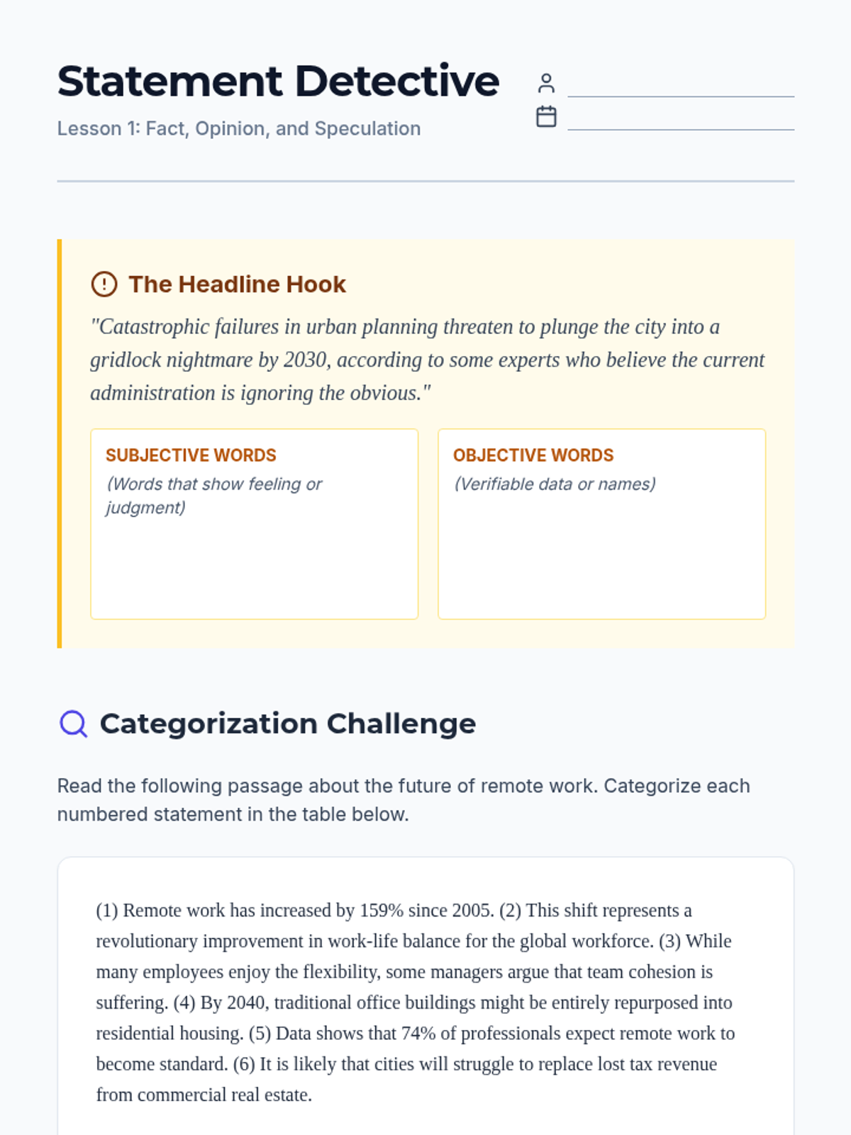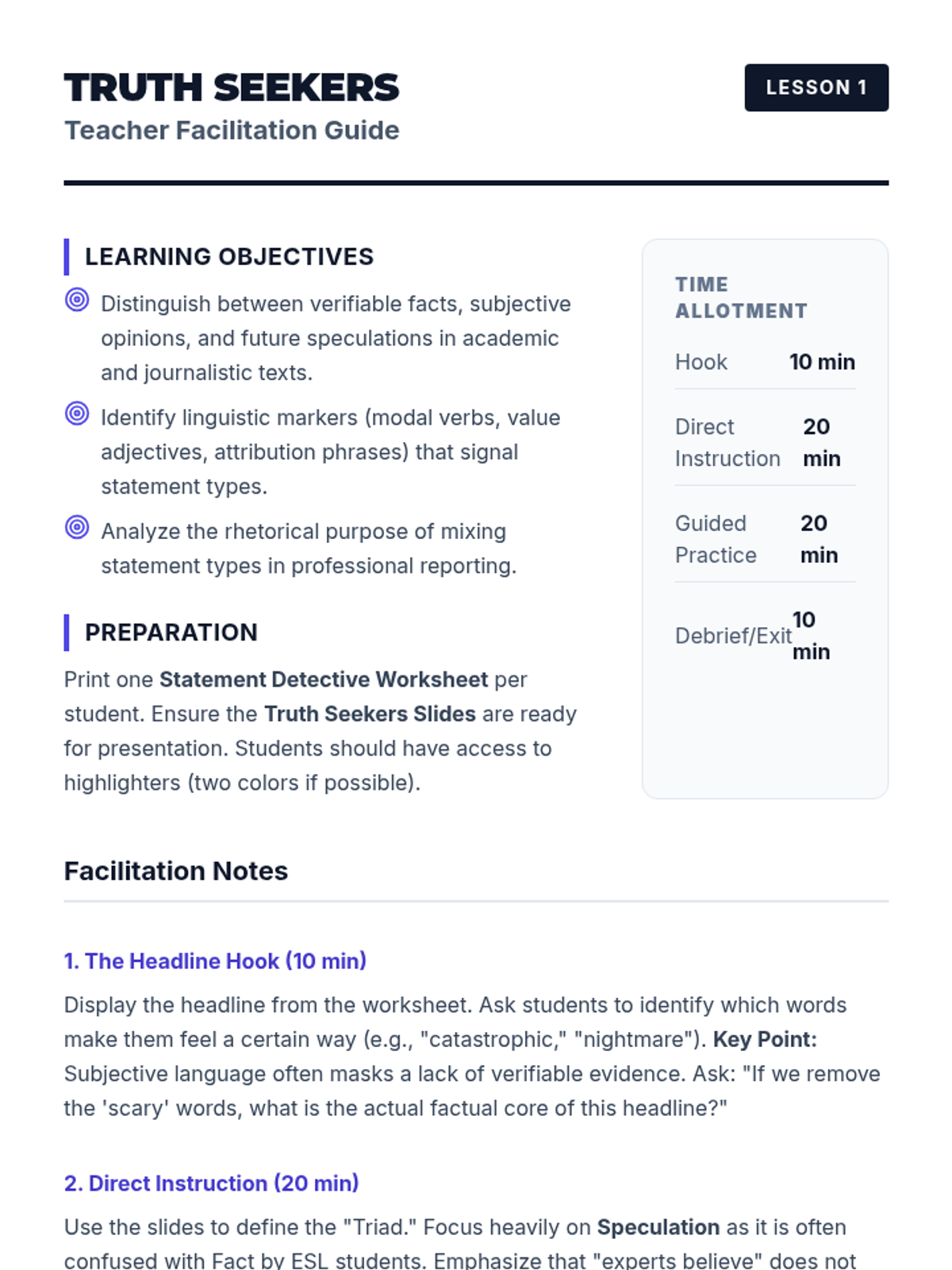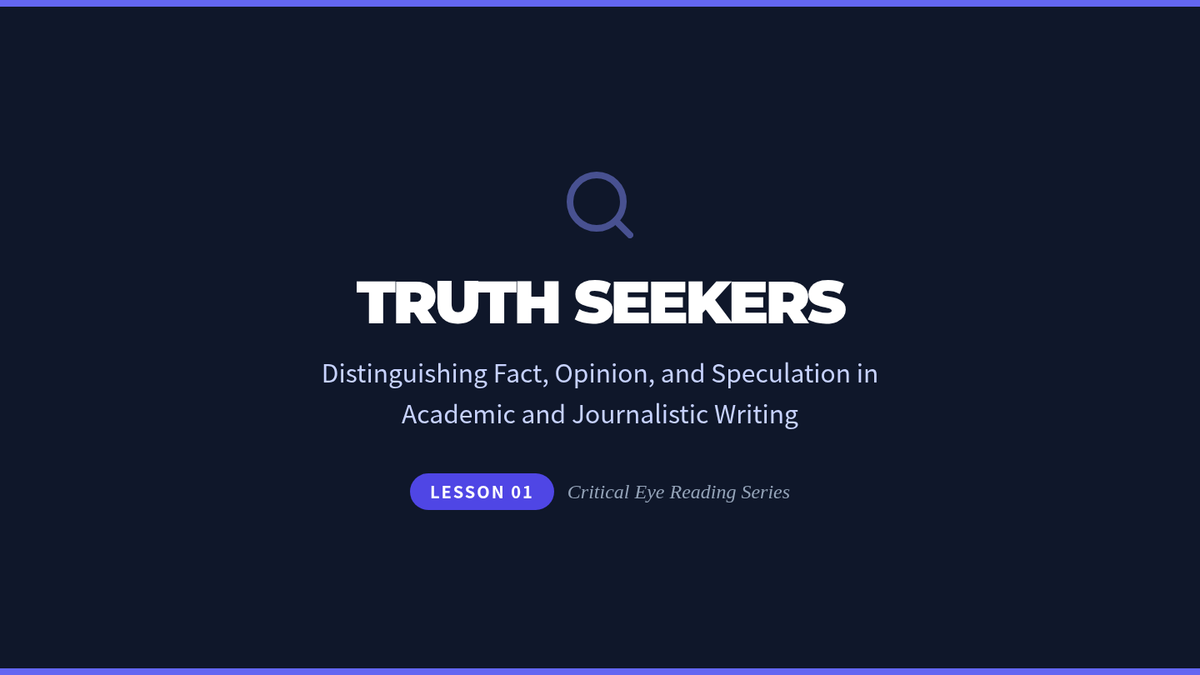 This sequence for intermediate ESL graduate students develops critical media literacy skills, focusing on the linguistic markers of fact, opinion, and speculation, the impact of connotative vocabulary, and the detection of bias and satire in complex texts.