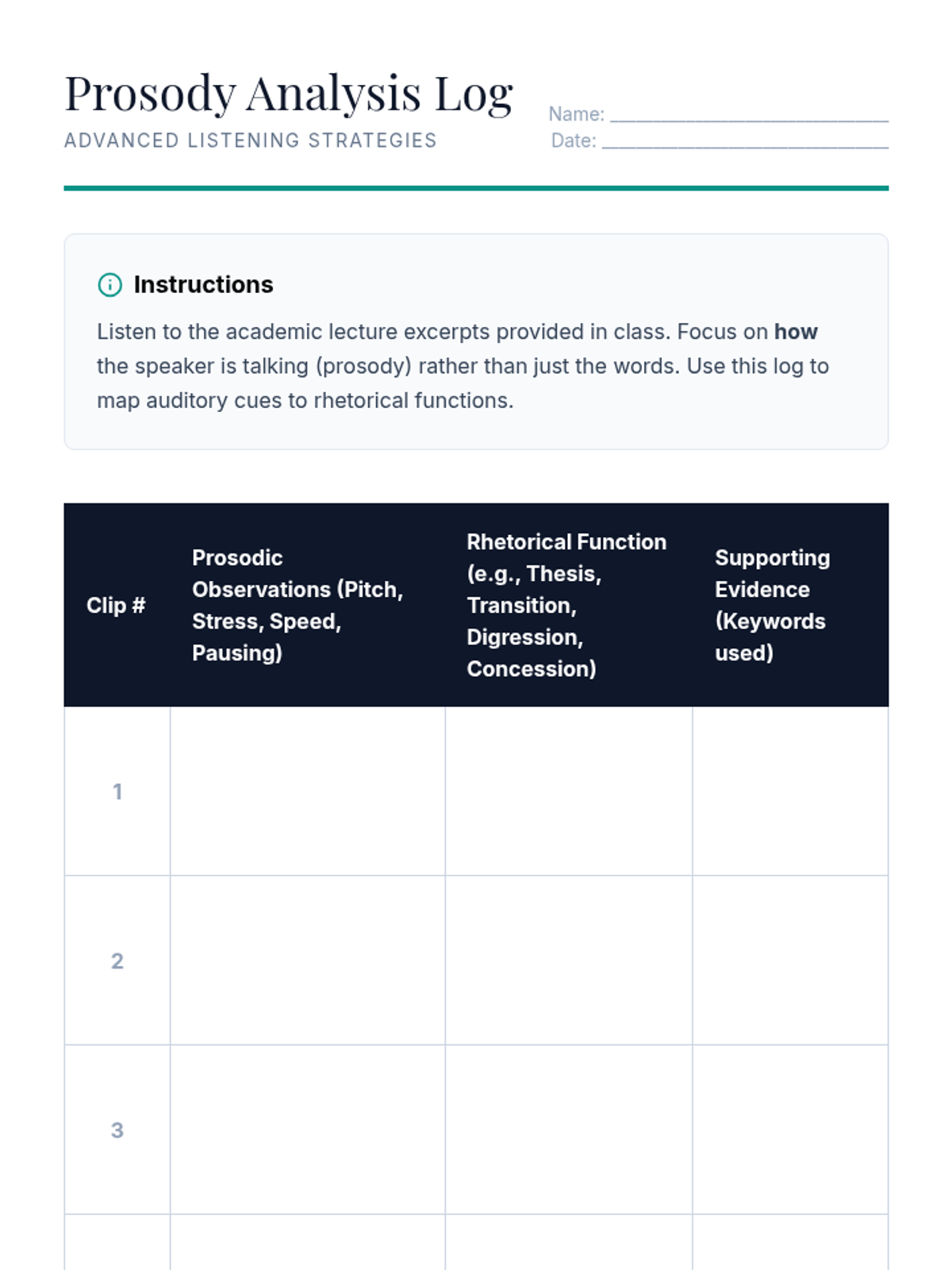 This sequence immerses undergraduate students in the rigorous environment of university-level academic discourse, focusing on the deconstruction of complex lectures and presentations. Students move from identifying structural signposts to evaluating implicit bias, speaker intent, and rhetorical strategies in real-time.