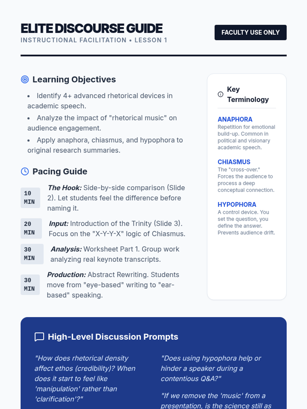 This advanced sequence for graduate ESL students focuses on mastering rhetorical strategies, prosodic control, and academic ethos for high-stakes presentations. Students move from analyzing elite discourse to defending their own research in a simulated conference environment.