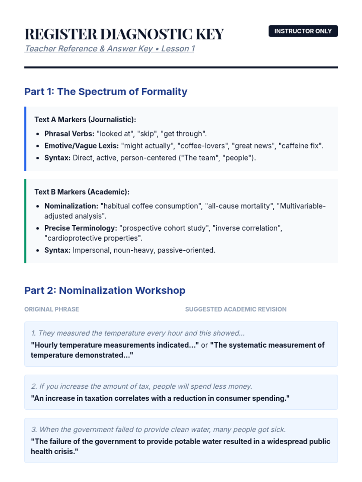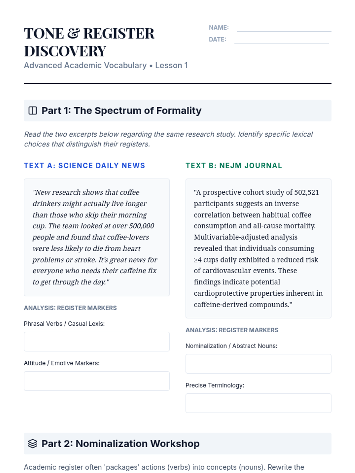 A comprehensive unit designed for graduate students to transition from general English to high-frequency academic collocations and formal register. Students will analyze research literature, master abstract noun-preposition pairings, refine reporting verbs, and use nominalization to enhance lexical density in their scholarly writing.