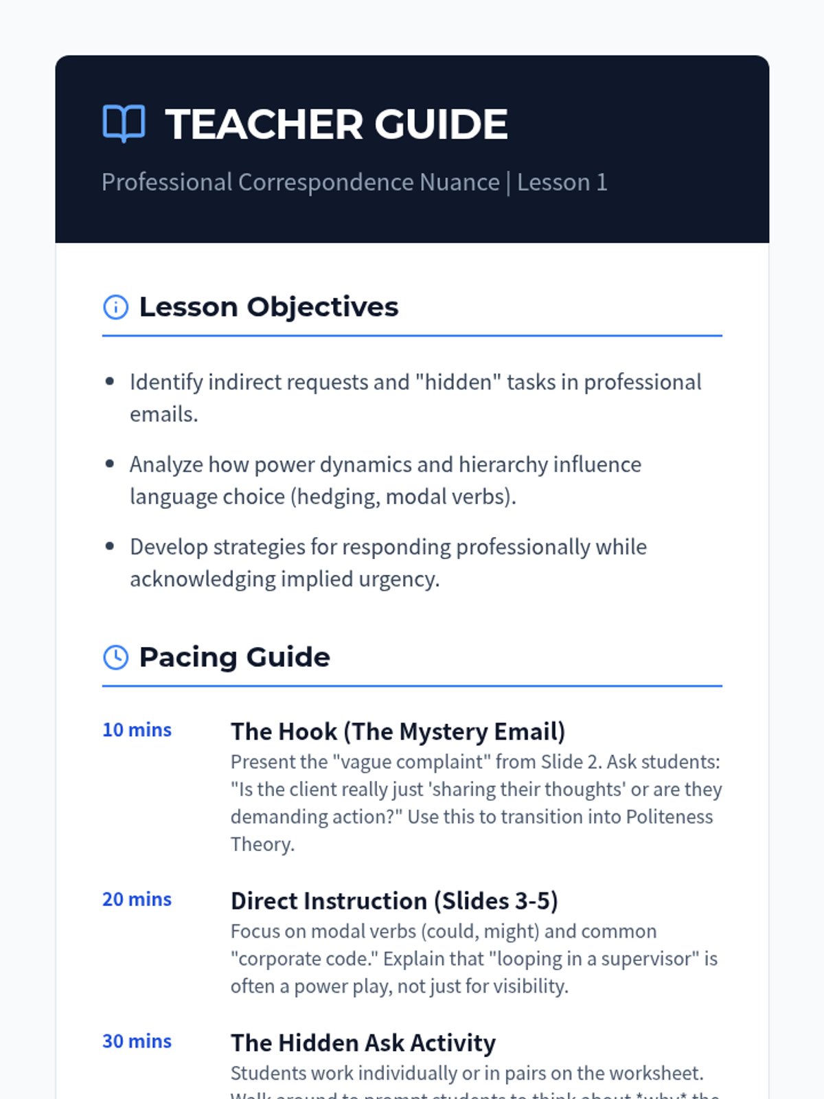 This sequence for graduate ESL students explores the nuances of English beyond literal meaning. Students will master the ability to detect sarcasm, bias, contrastive stress, and professional register, equipping them for complex academic and professional communication.