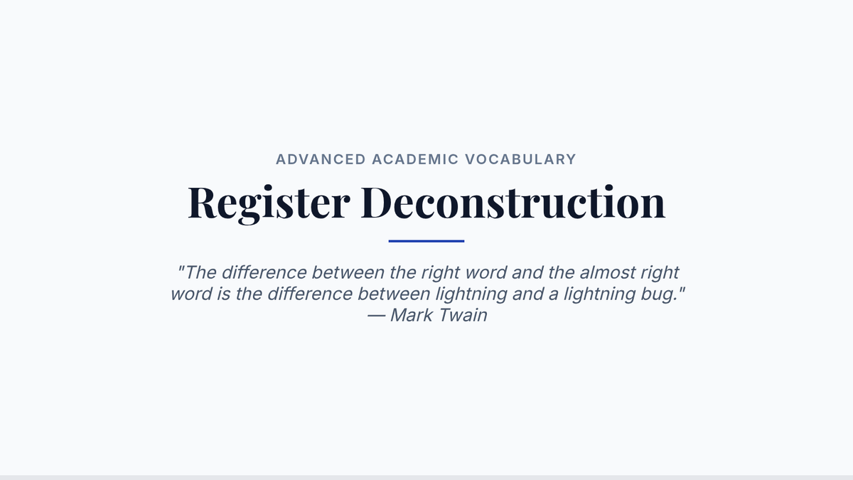 A comprehensive sequence for graduate students focusing on advanced academic vocabulary, register, collocations, etymology, and hedging strategies in research writing. Students move from analysis to application, culminating in a lexical density editing workshop.