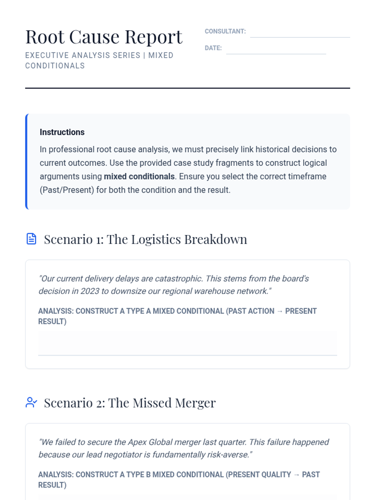 A sequence for graduate ESL students focusing on using complex conditional structures (0, 1, 2, 3, mixed, and inverted) to build academic arguments, analyze research limitations, and propose future studies. Students move from basic review to advanced stylistic inversions and synthesis in a 'Future Directions' research context.