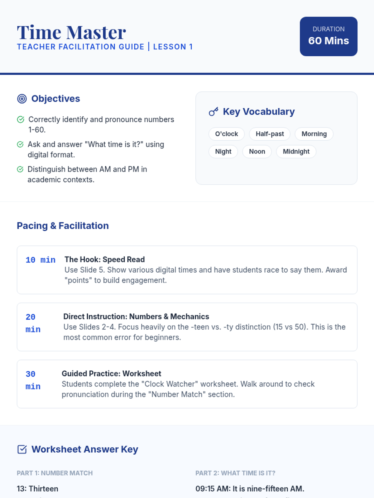 A sequence for graduate students focusing on beginner English vocabulary related to time, schedules, and campus navigation to manage their academic lives effectively.