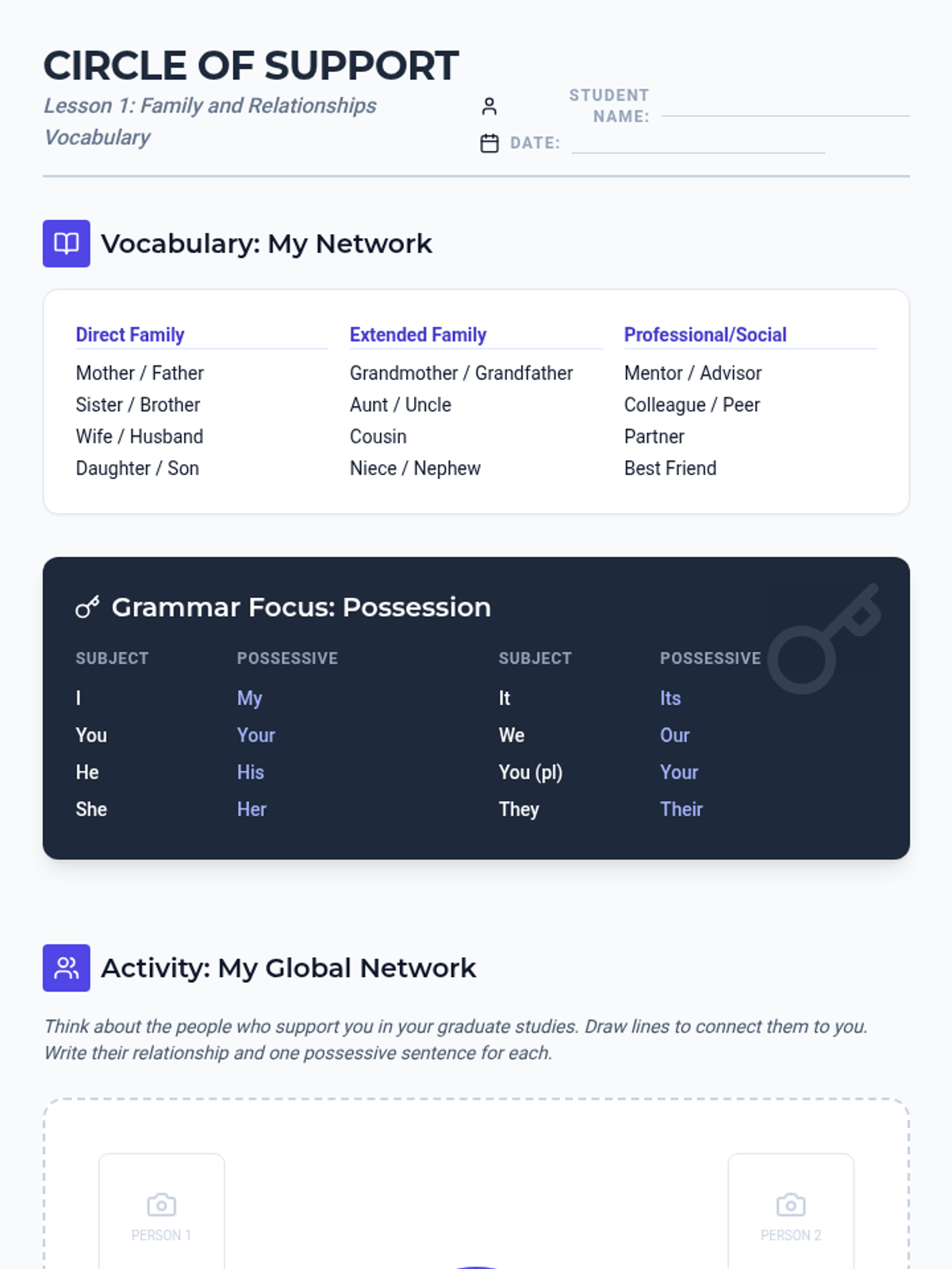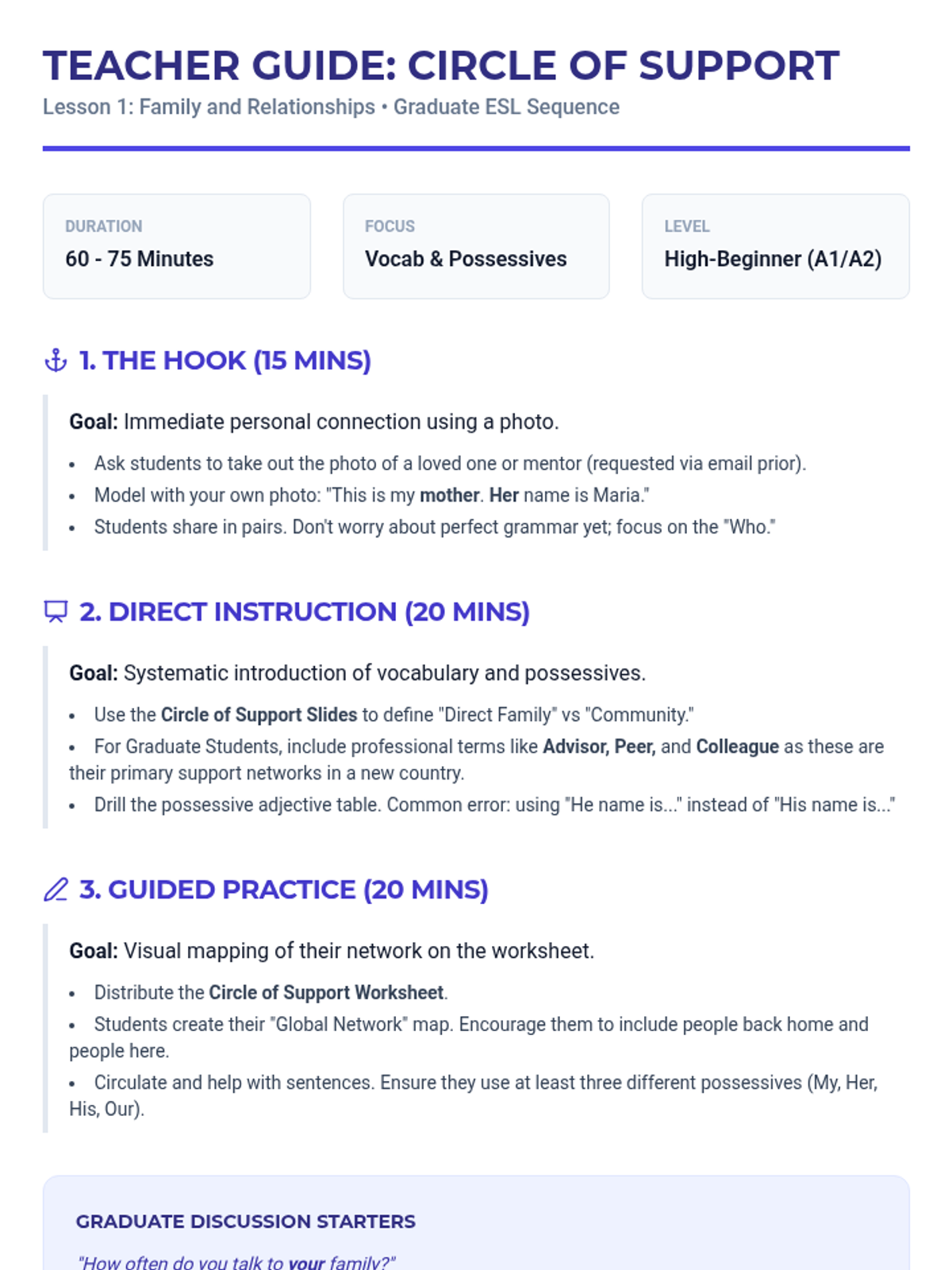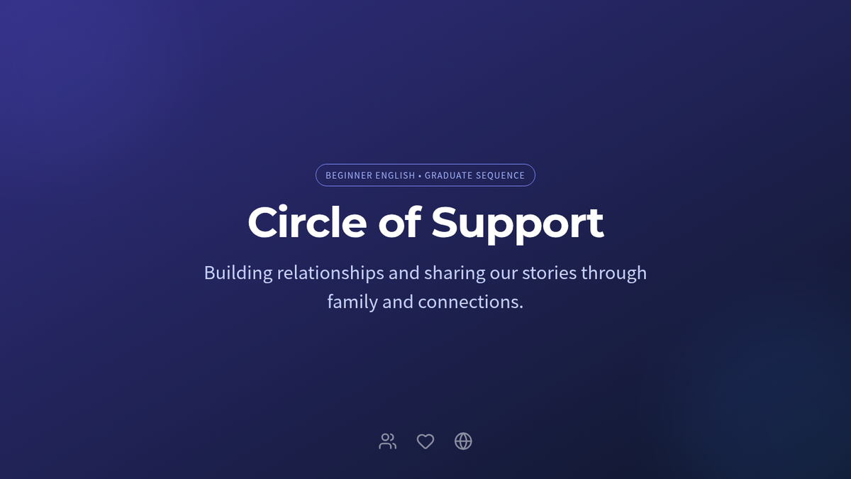 A basic English vocabulary sequence for graduate students focusing on social-emotional connection, personal narratives, and cross-cultural exchange to build community.