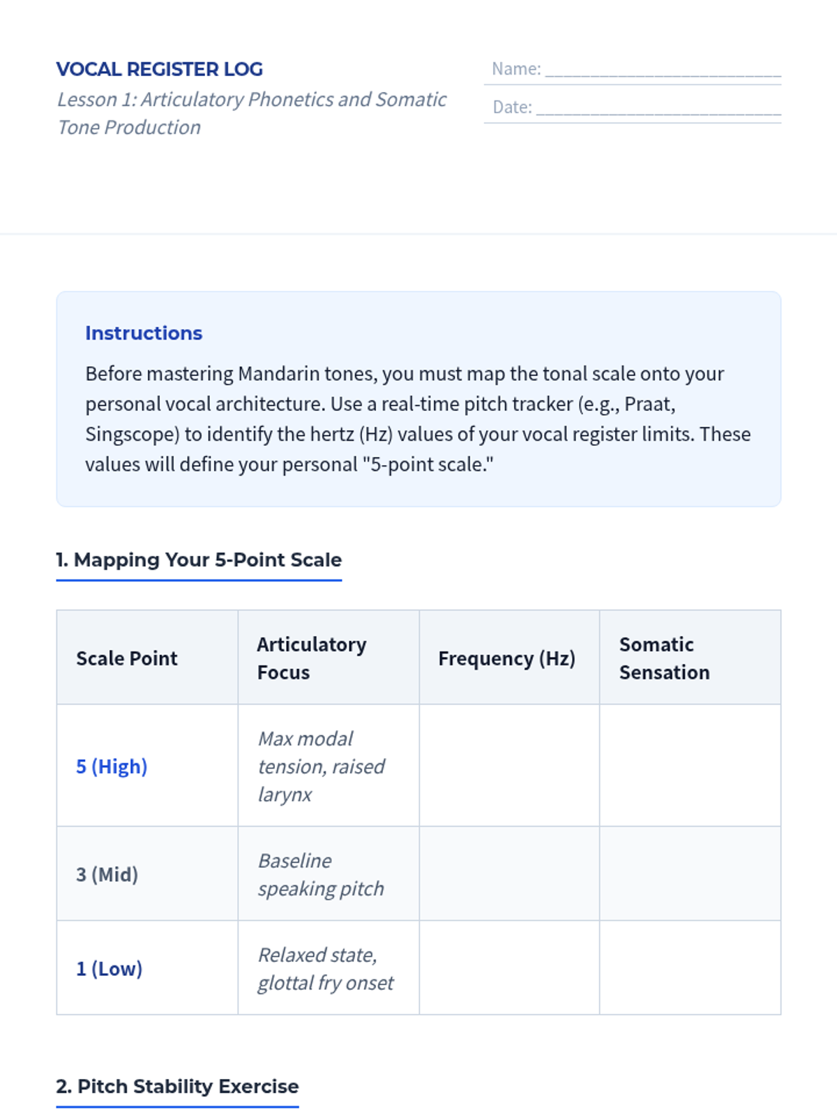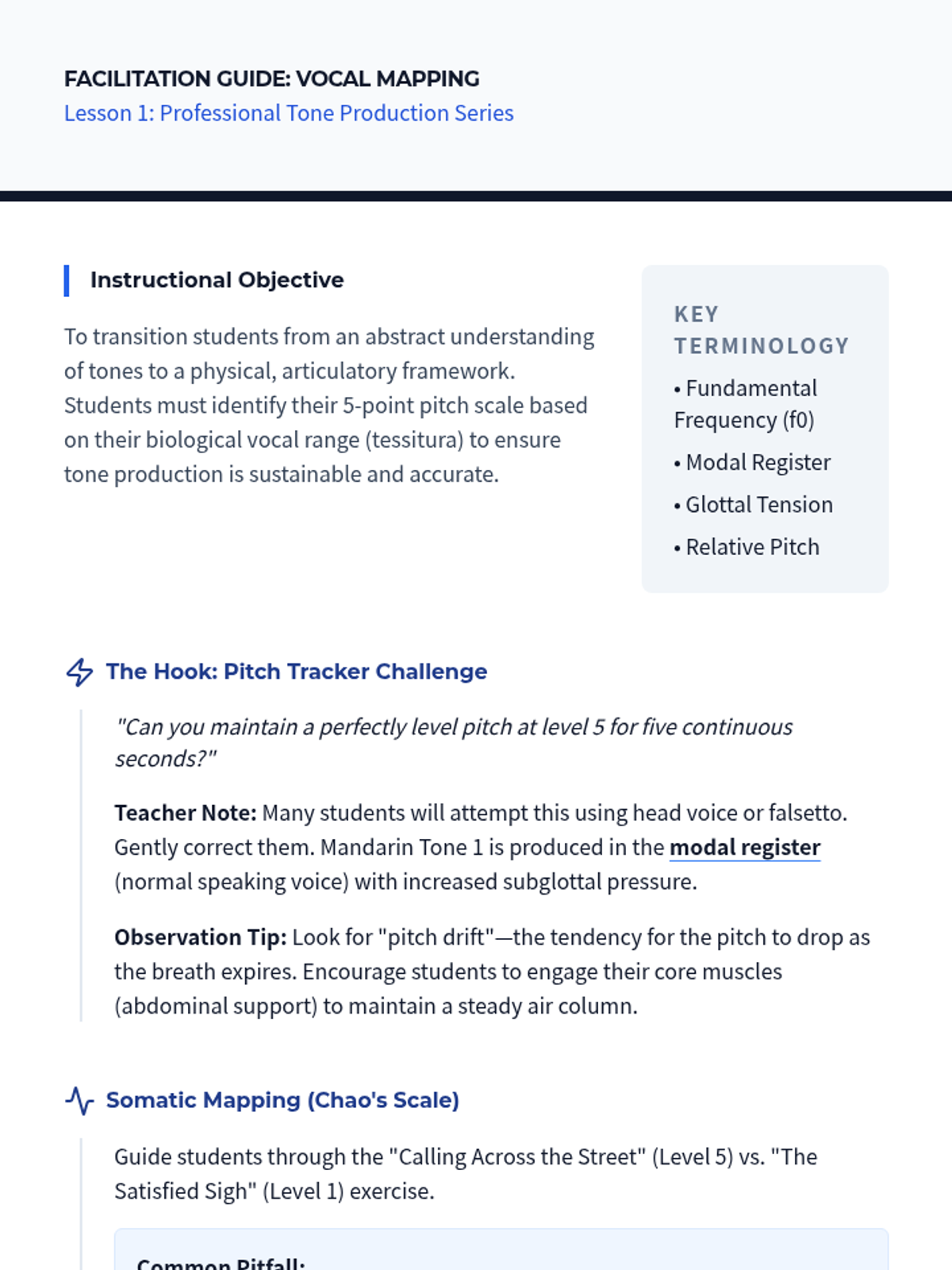 A graduate-level sequence focused on the articulatory phonetics and somatic production of Mandarin Chinese tones, emphasizing vocal register mapping and physical pitch control.