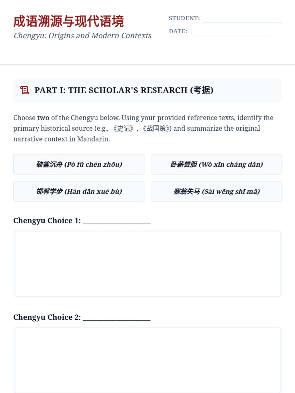 This advanced Mandarin course explores the linguistic structure, historical origins, and modern applications of Chengyu (four-character idioms), moving beyond memorization to stylistic mastery in academic writing.