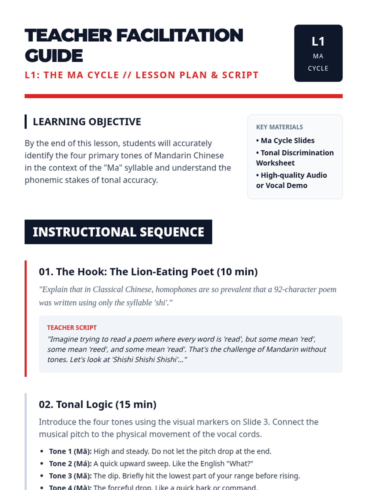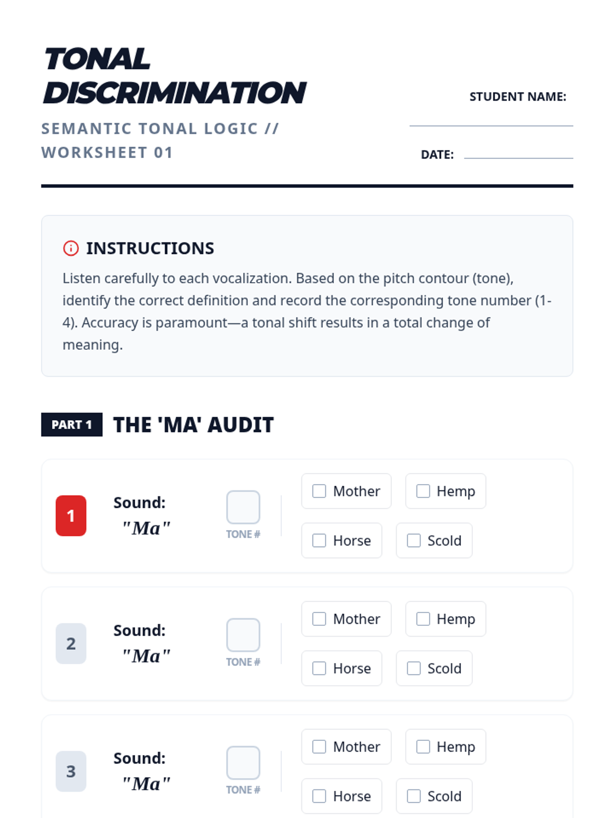 This sequence addresses the critical link between tones and meaning in Mandarin Chinese, focusing on minimal pairs where tone is the only distinguishing factor. Graduate students engage in analytical, gamified challenges to move from isolated auditory discrimination to complex semantic processing.