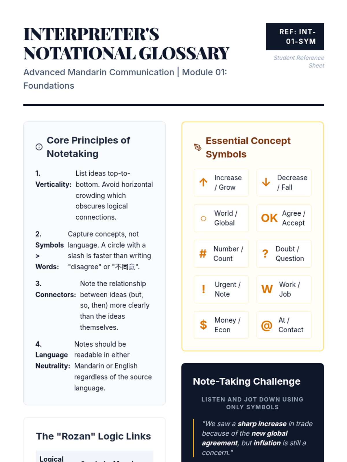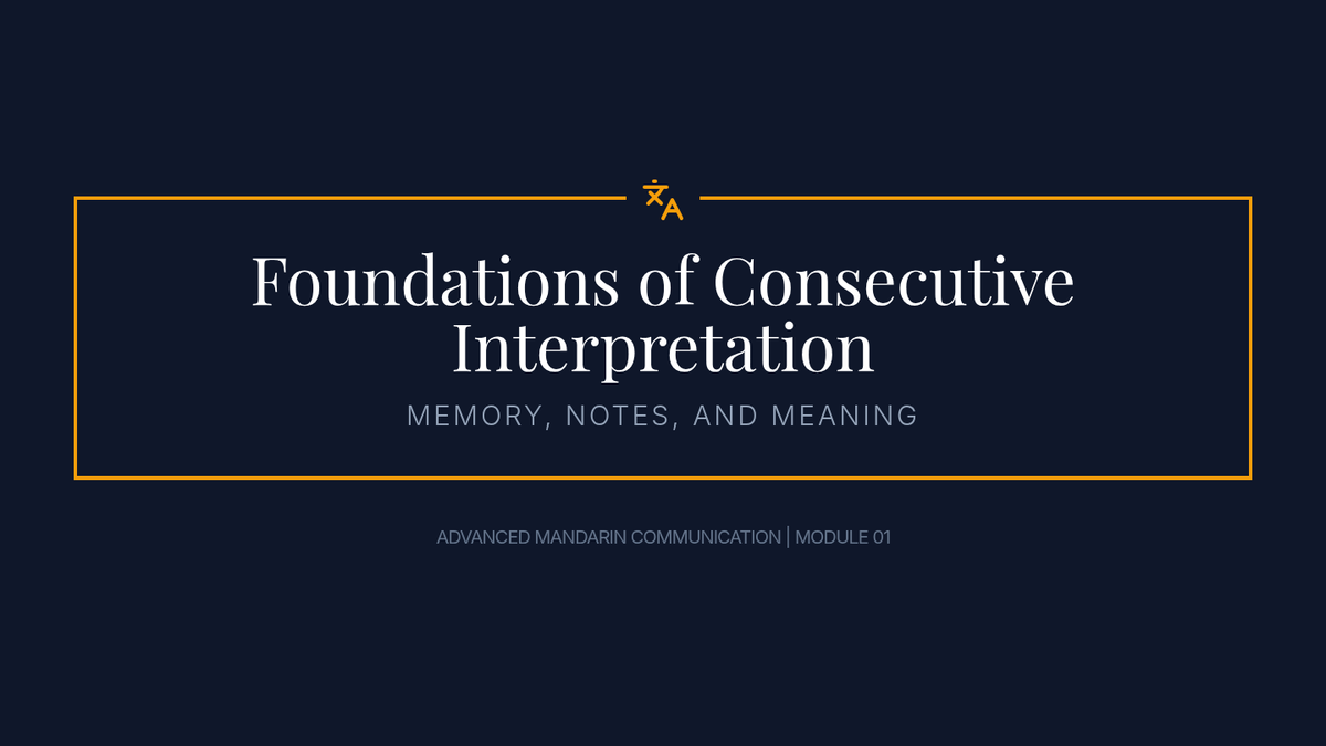 A graduate-level course focused on the cognitive and linguistic skills required for advanced Mandarin-English interpretation and cultural mediation, covering note-taking, sight translation, and specialized terminology.