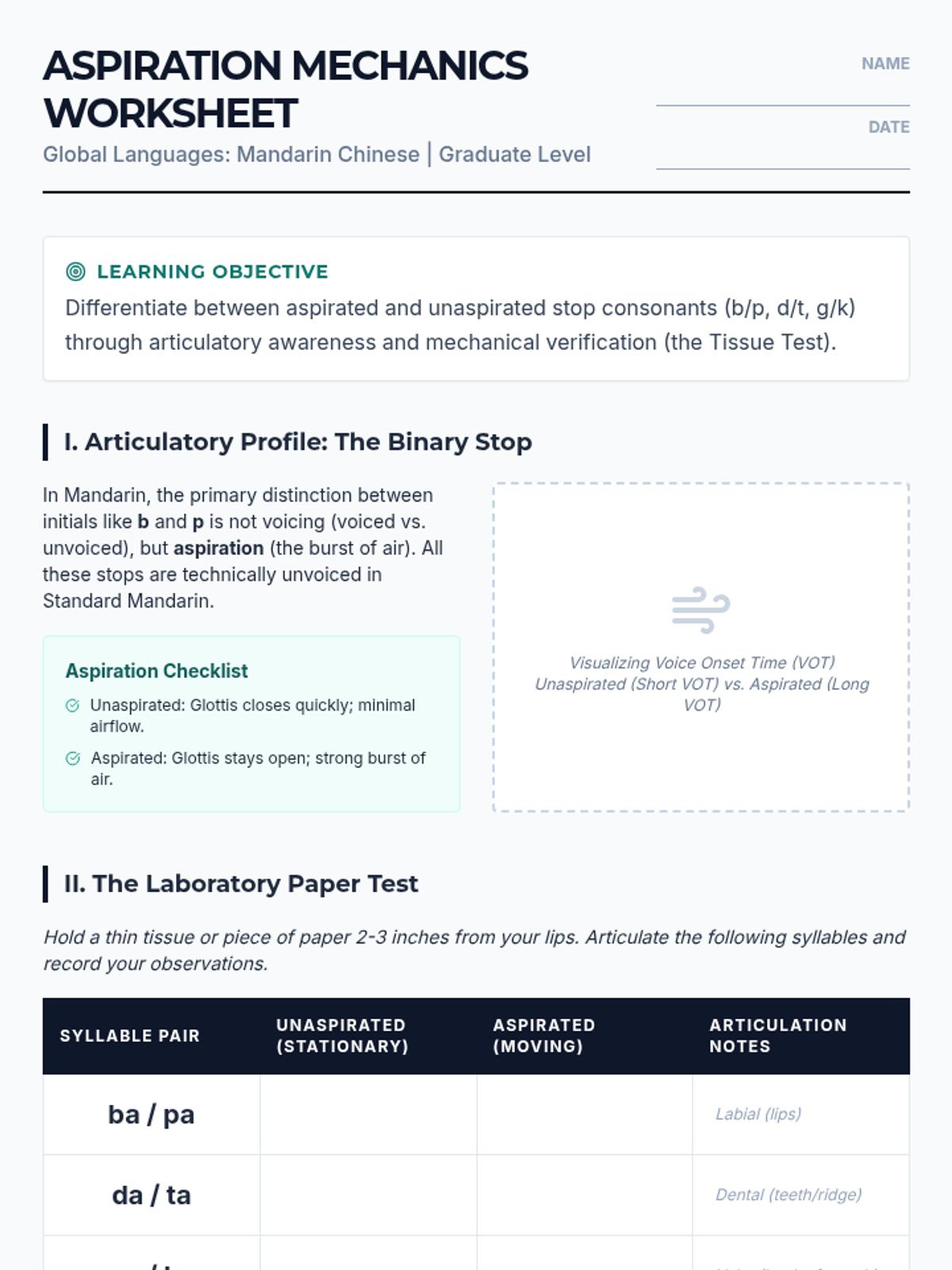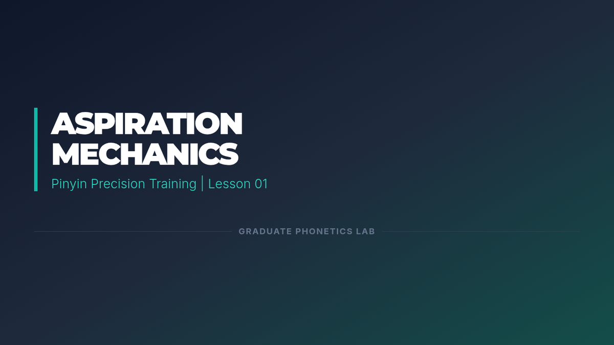 An intensive linguistic approach to Mandarin Pinyin for graduate students, focusing on the phonetics of aspiration, tongue placement (retroflex vs. palatal), and the contextual variation of the 'i' vowel. Students move from mechanical breath control to precise articulatory geometry.