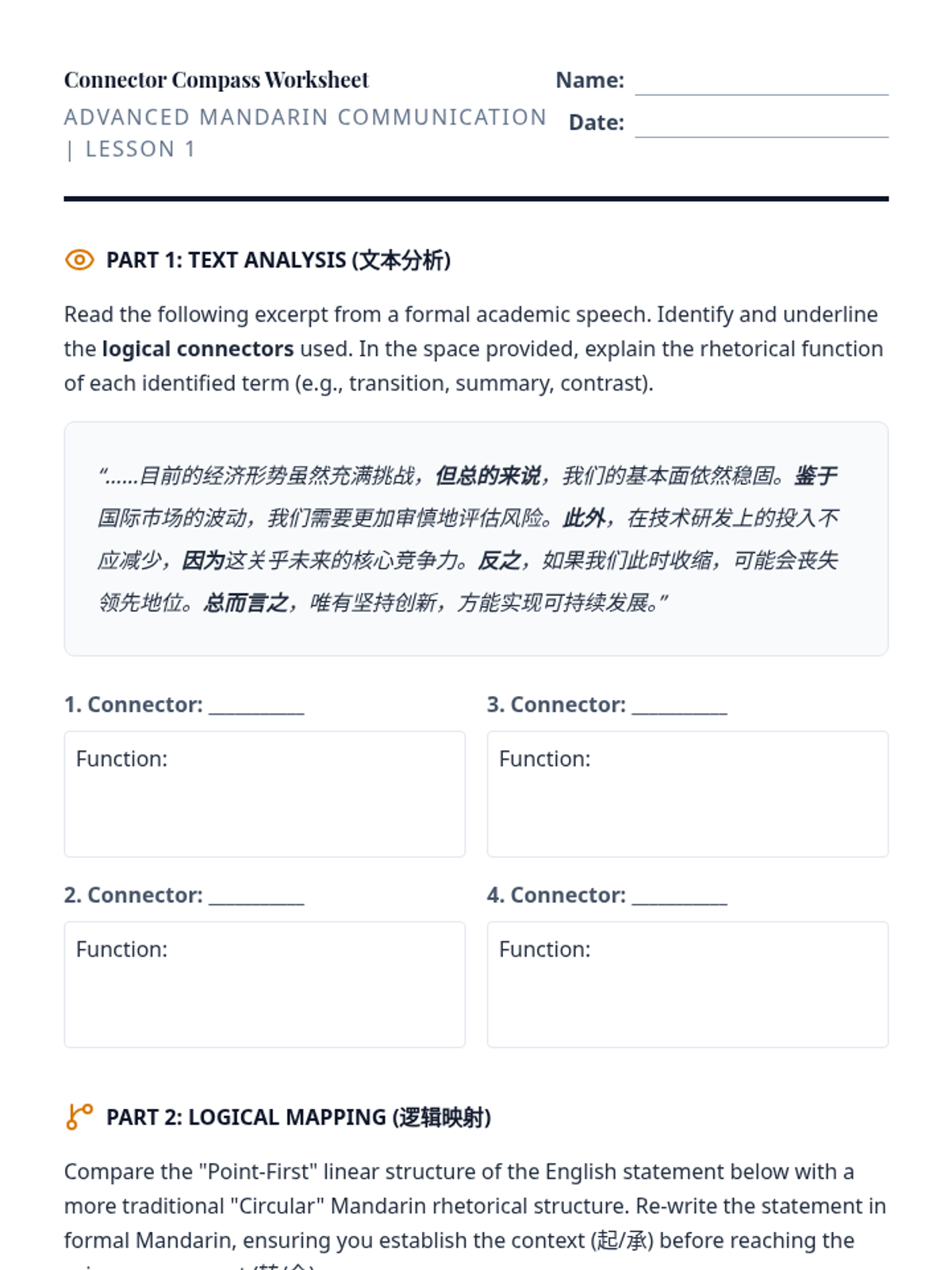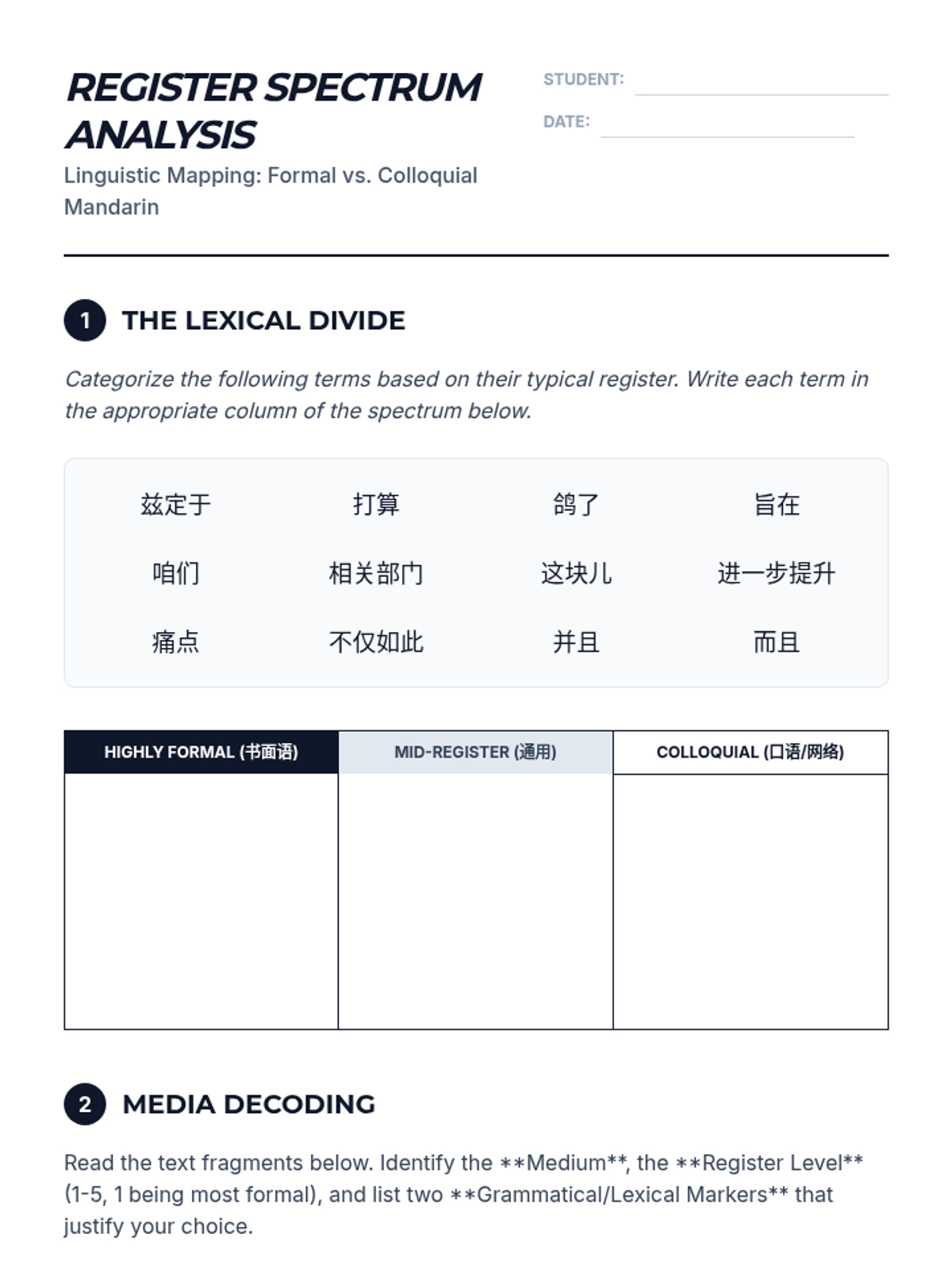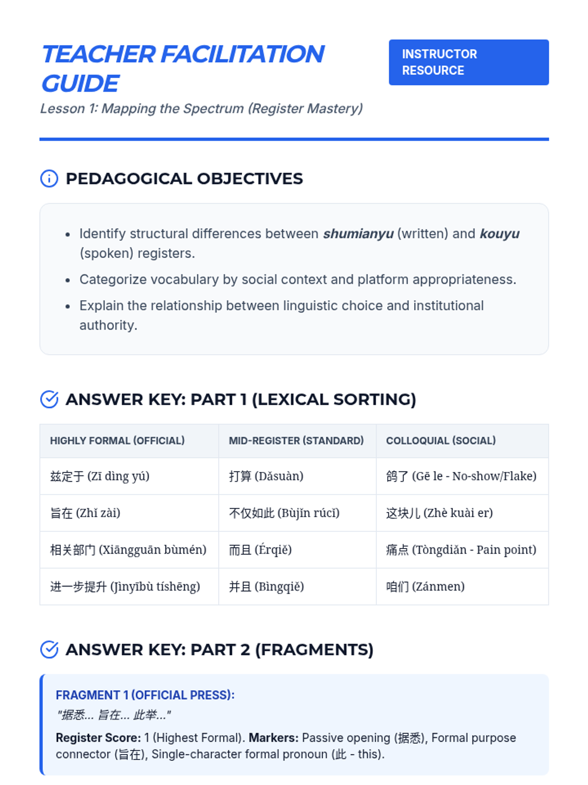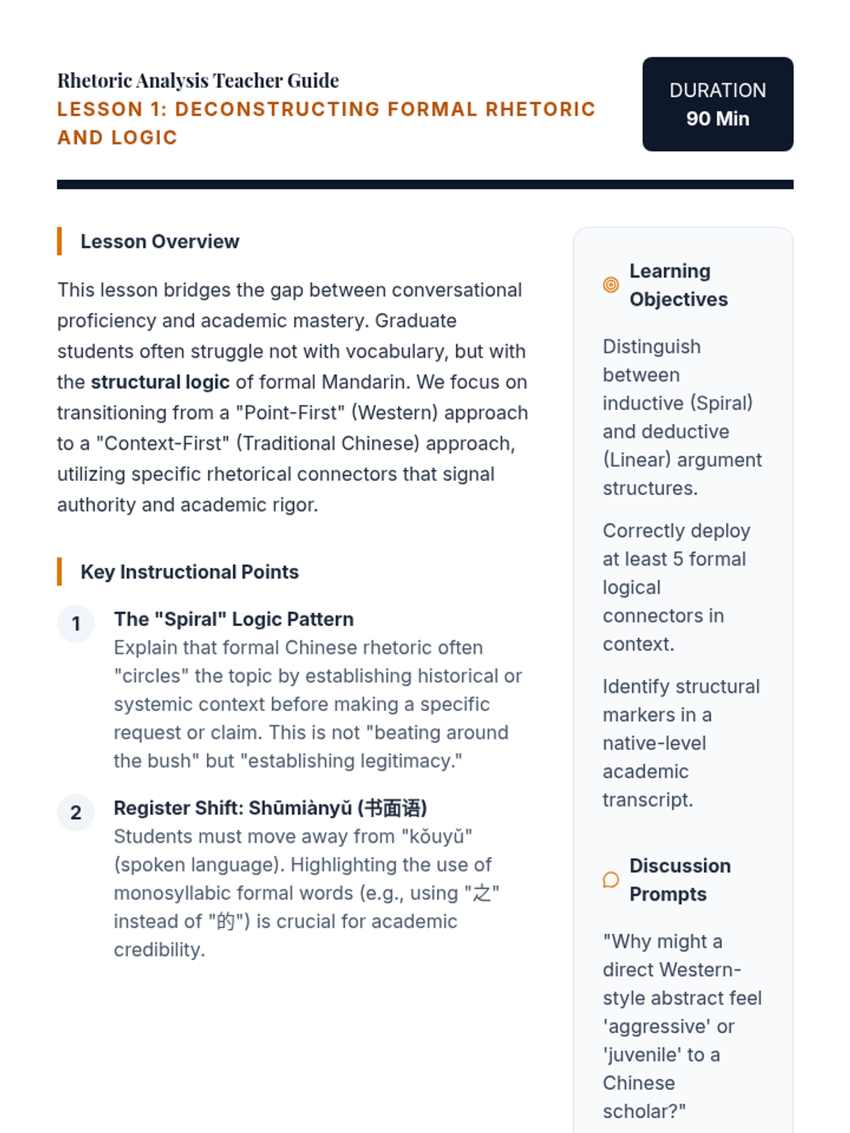 A comprehensive unit for advanced Mandarin learners focusing on the transition from colloquial speech to formal academic and bureaucratic written Chinese (Shumianyu). Students will master formal vocabulary, complex syntax, and stylistic registers.
