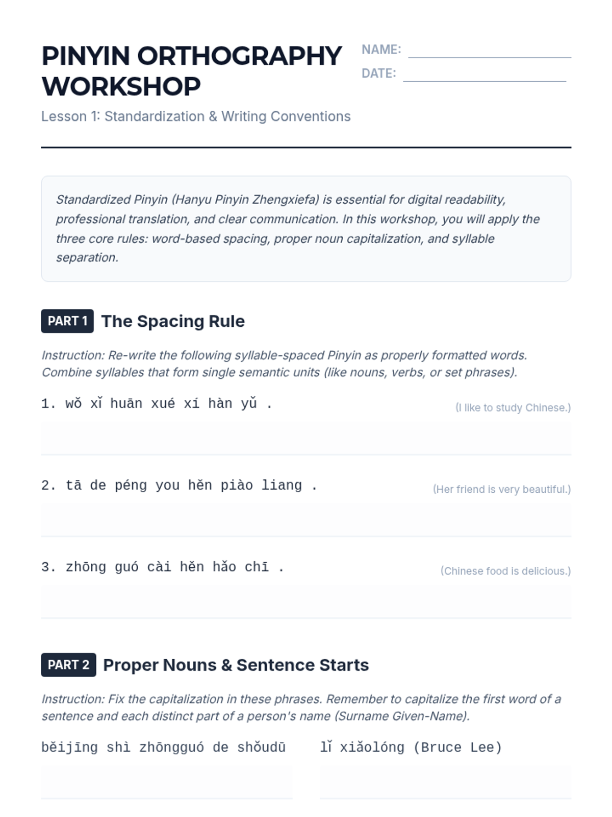 A comprehensive sequence for undergraduate students on Pinyin orthography and digital input proficiency. This unit moves from the formal rules of spacing and capitalization to the practical mastery of typing Chinese characters using an Input Method Editor (IME).