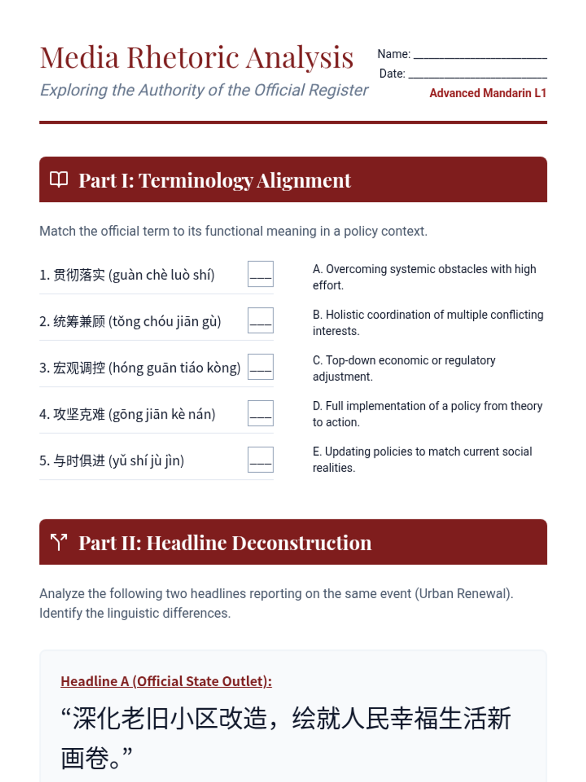 A specialized sequence for graduate students to master the formal register of Chinese news media. The course covers headline syntax, economic reporting logic, passive structures in incident reports, bias in editorials, and cross-regional news synthesis.