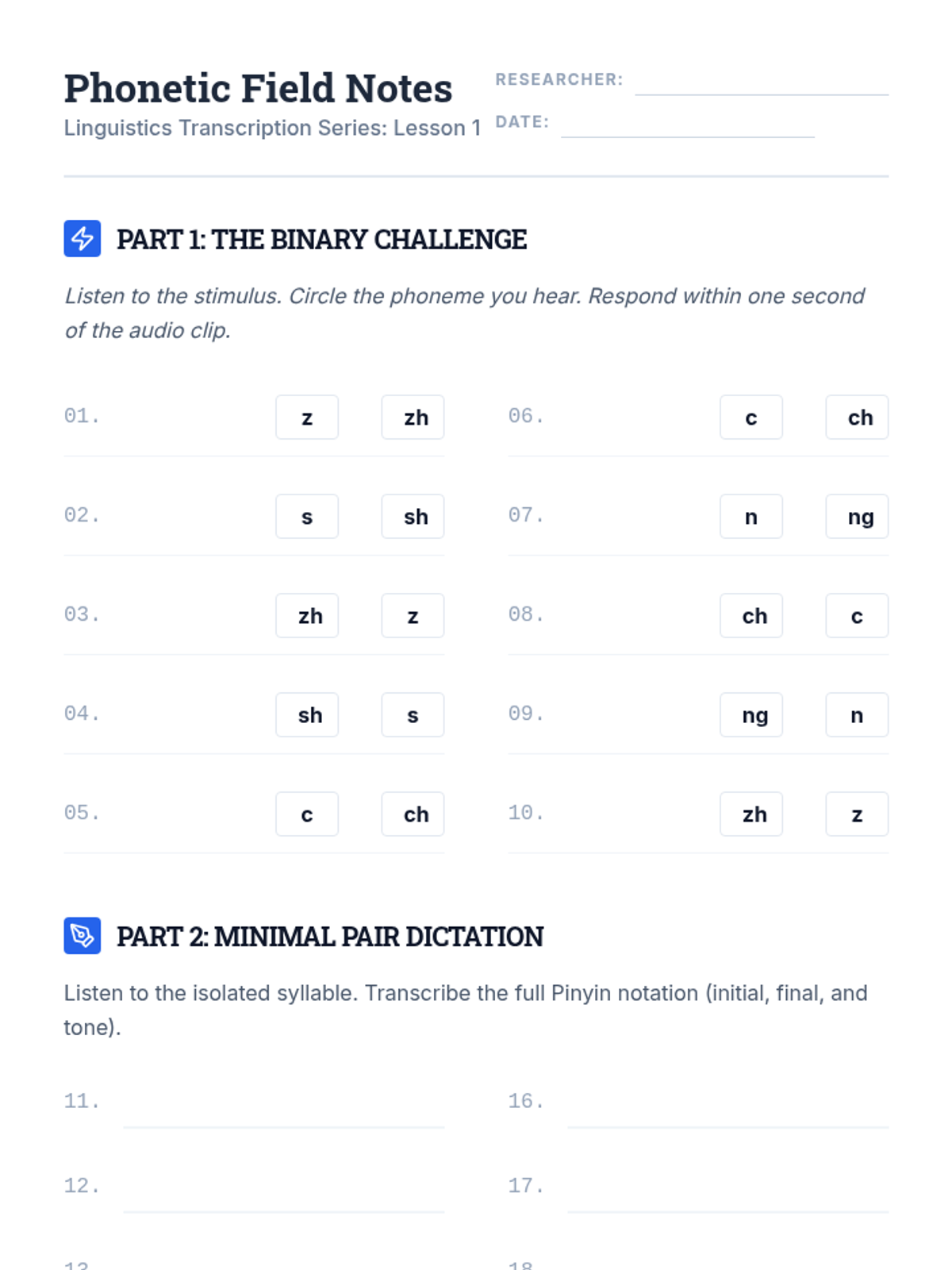 A comprehensive sequence designed for graduate-level linguistics and language students to master the transcription of spoken Mandarin into accurate Pinyin notation, with a focus on minimal pairs, tone sandhi, and rapid dictation.