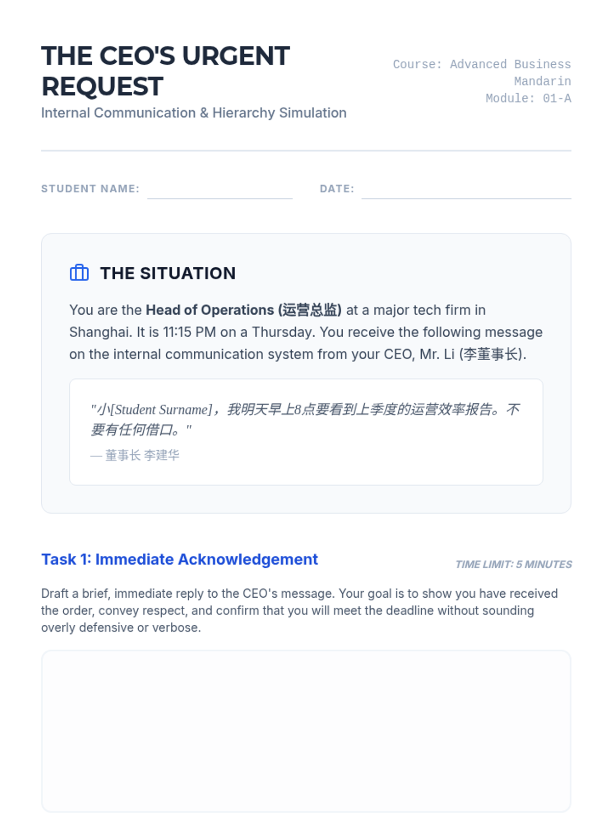 A comprehensive series for graduate students to master formal Mandarin communication within Chinese corporate environments. This sequence covers hierarchical protocol, negotiation tactics, the cultural nuances of 'face', formal written registers, and high-stakes meeting facilitation.